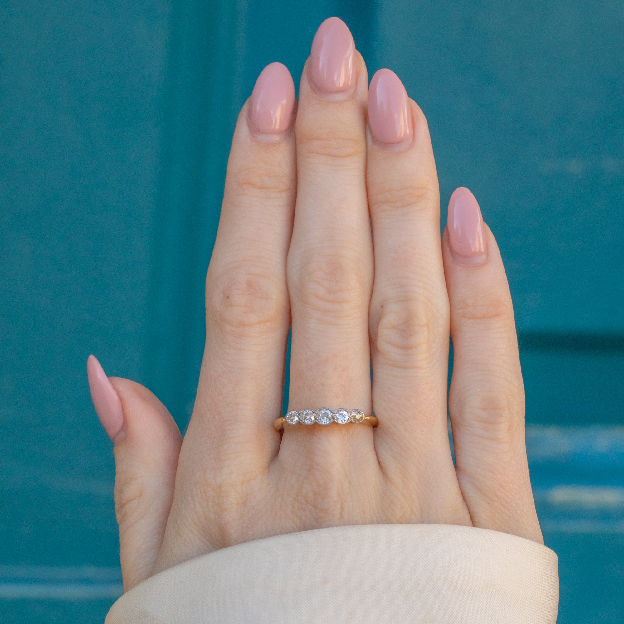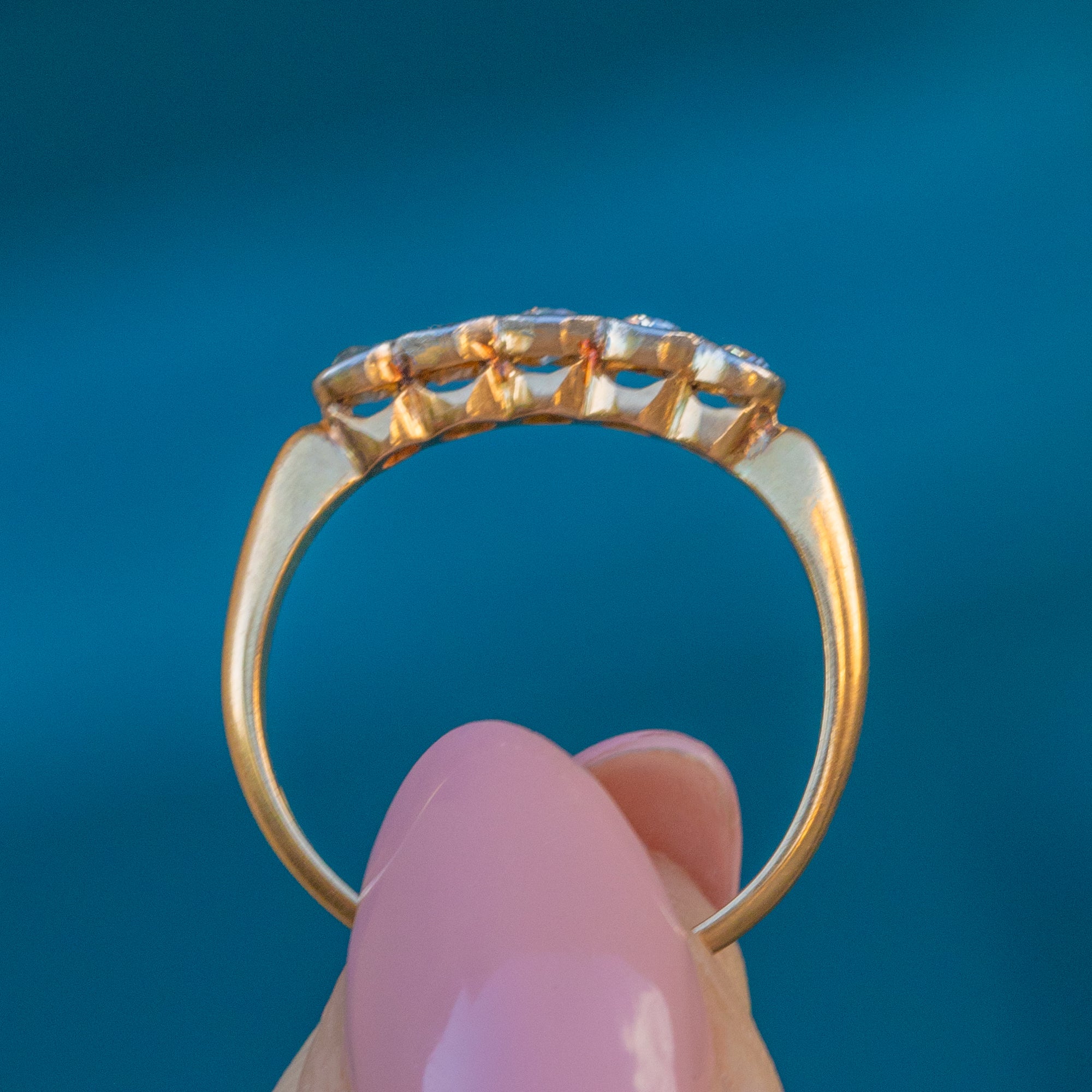 VERY GOOD. This is a superb antique 18ct Gold Diamond five stone ring in very good condition. This piece has a beautiful array of Diamonds, each with a pretty sparkle. One of the furthest Diamonds has a slight discolouration but this is not particularly noticeable unless under close inspection! There is minimal wear to the piece overall, making her a great investment.