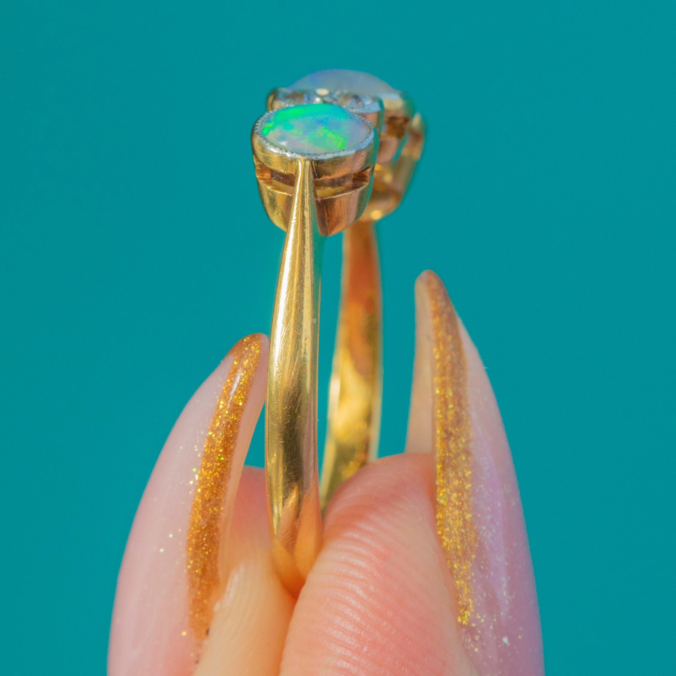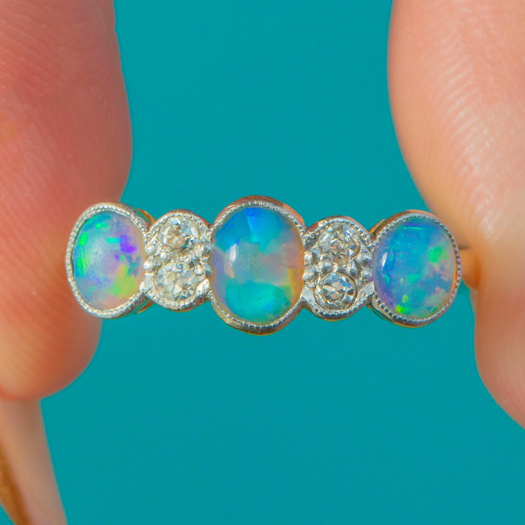 A beautiful Edwardian stacking ring crafted in rich 18ct Yellow Gold with elegant Platinum millegrain settings. This romantic seven-stone design features three natural solid Opal cabochons glowing with fiery pastel flashes, spaced by four bright Old Mine Cut Diamonds for a touch of antique sparkle. Delicate, feminine and wonderfully wearable, it’s a classic early 20th-century look.