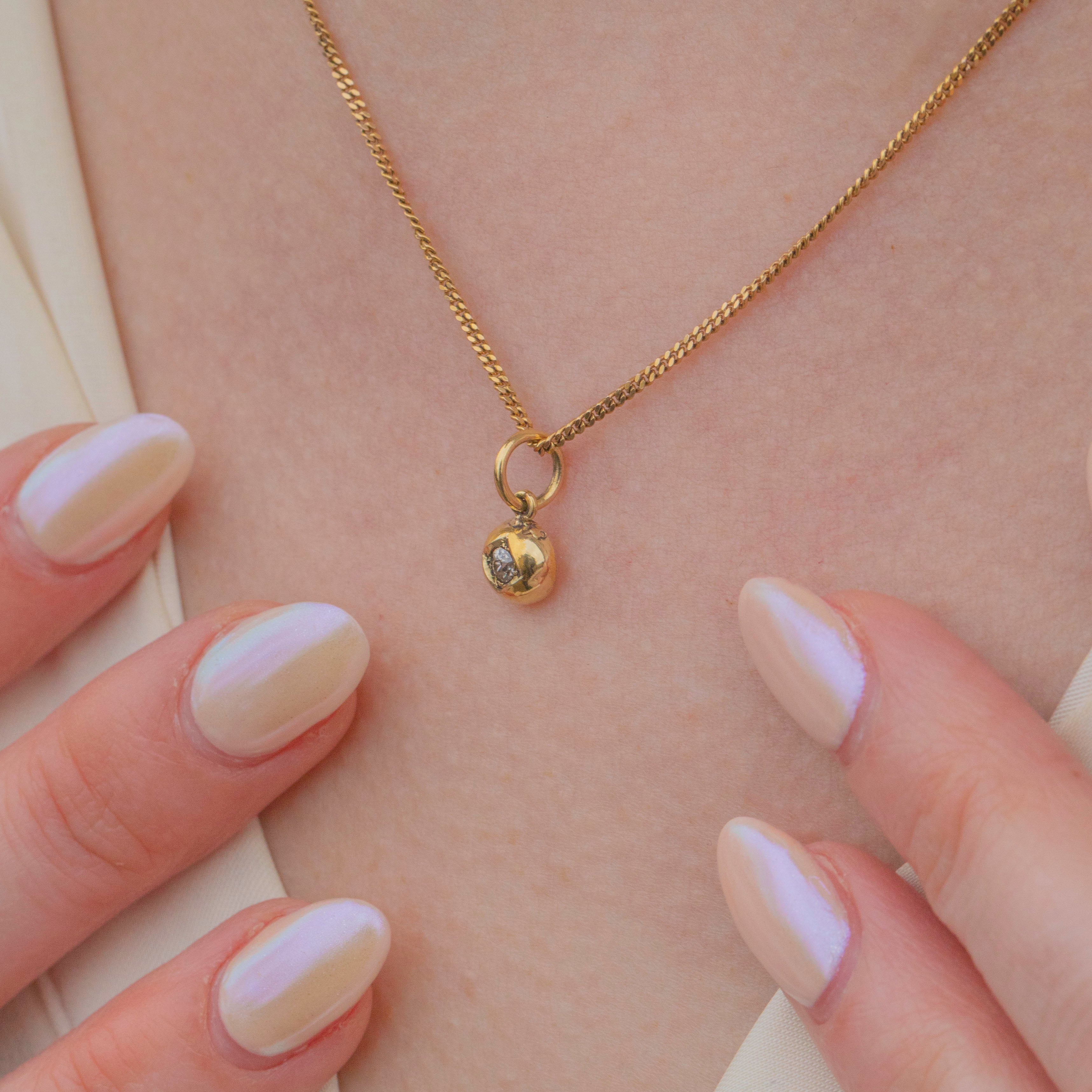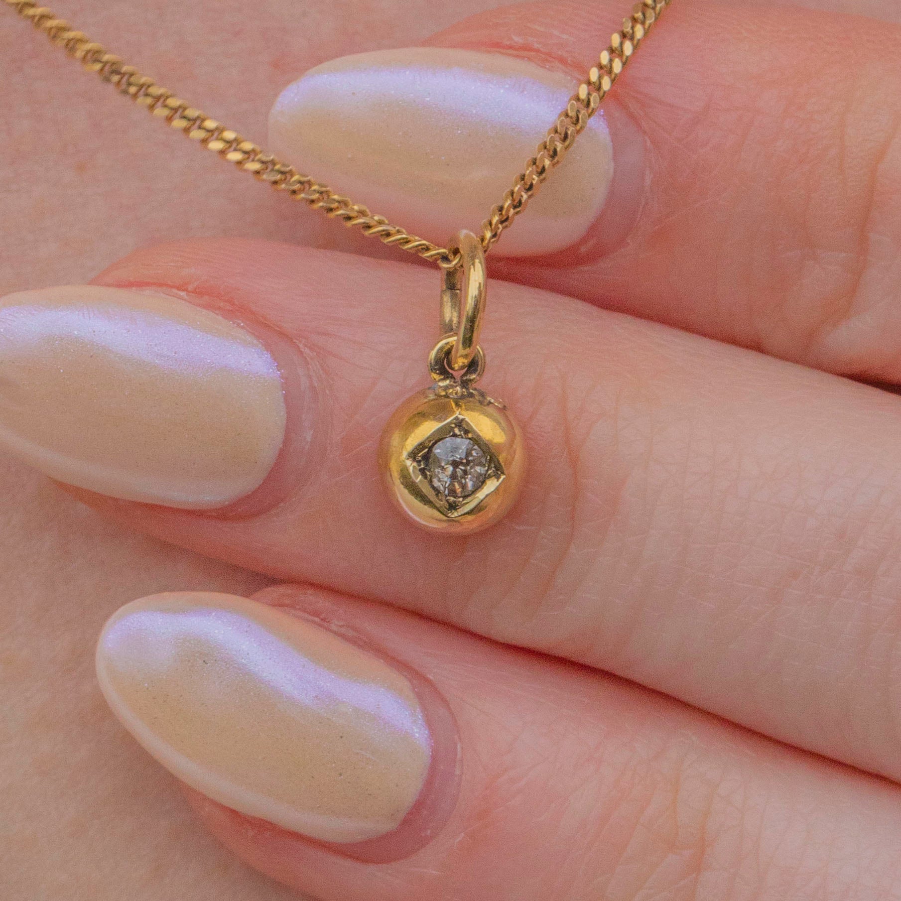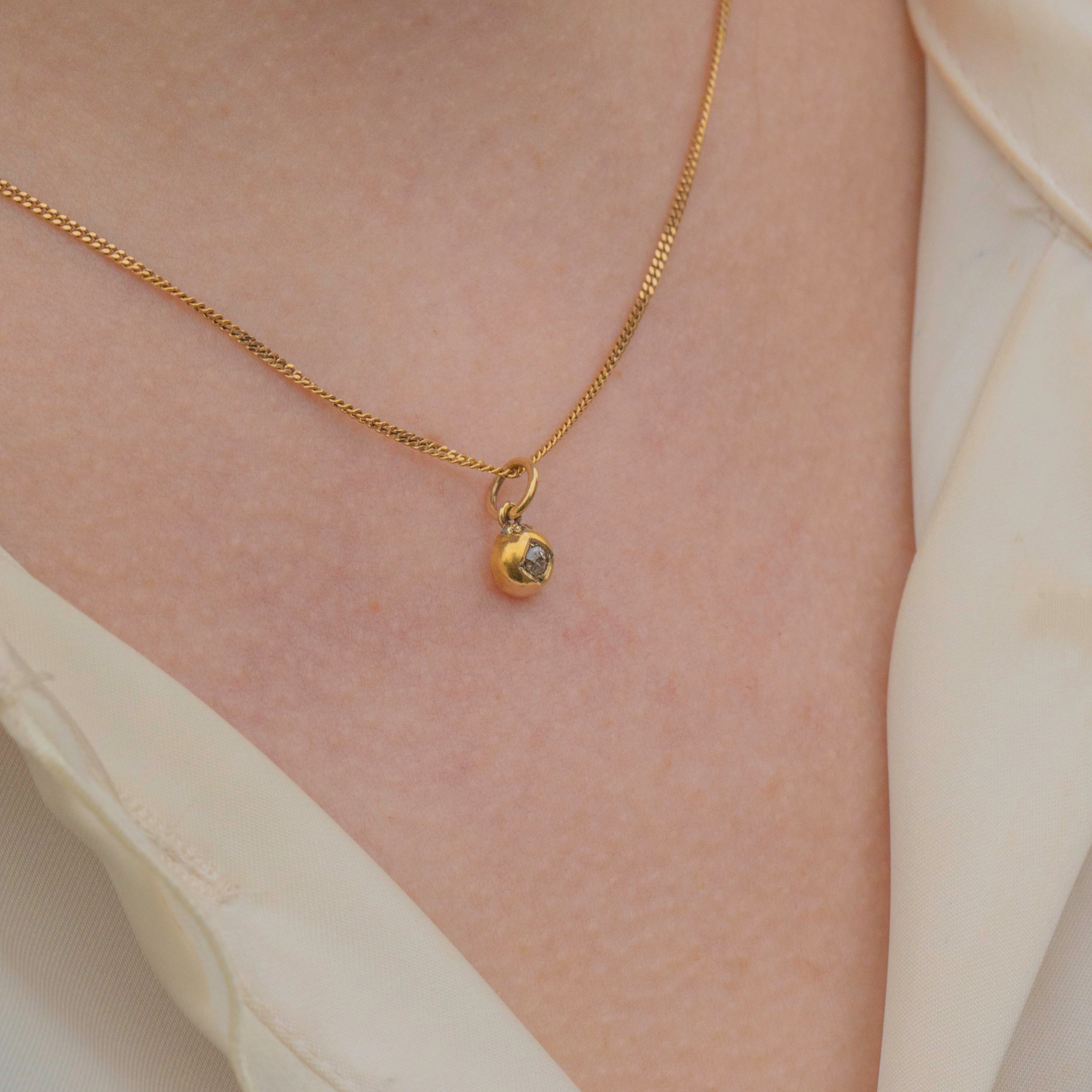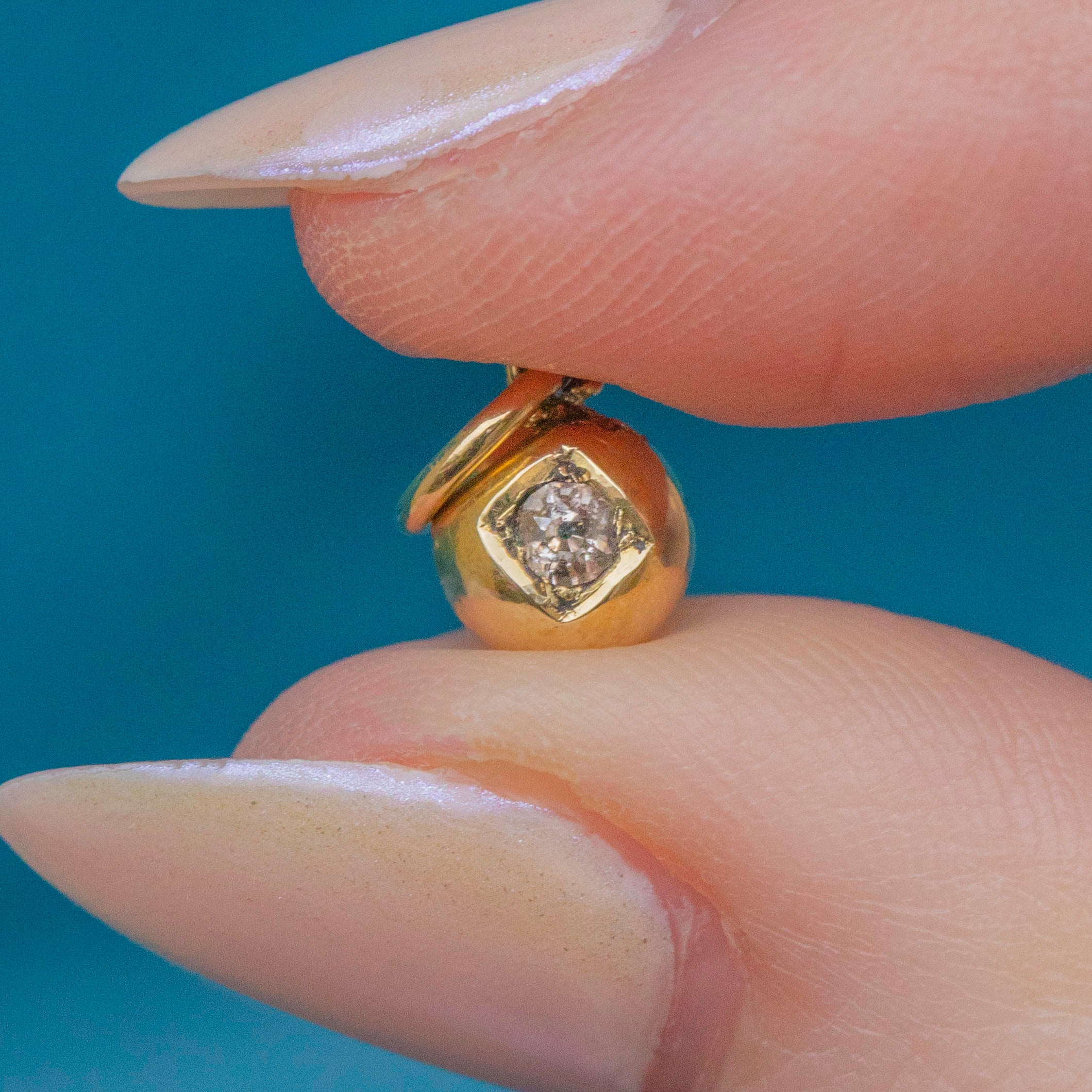 EXCELLENT. This antique 18ct Gold puffy Diamond charm is in excellent condition. The securely set Diamond is pristine with no fleabites, and the Gold is saturated and has retained its domed shape. Though there are a couple of light dings on the back, its sturdy soldered jump-ring ensures it can be worn with complete confidence.