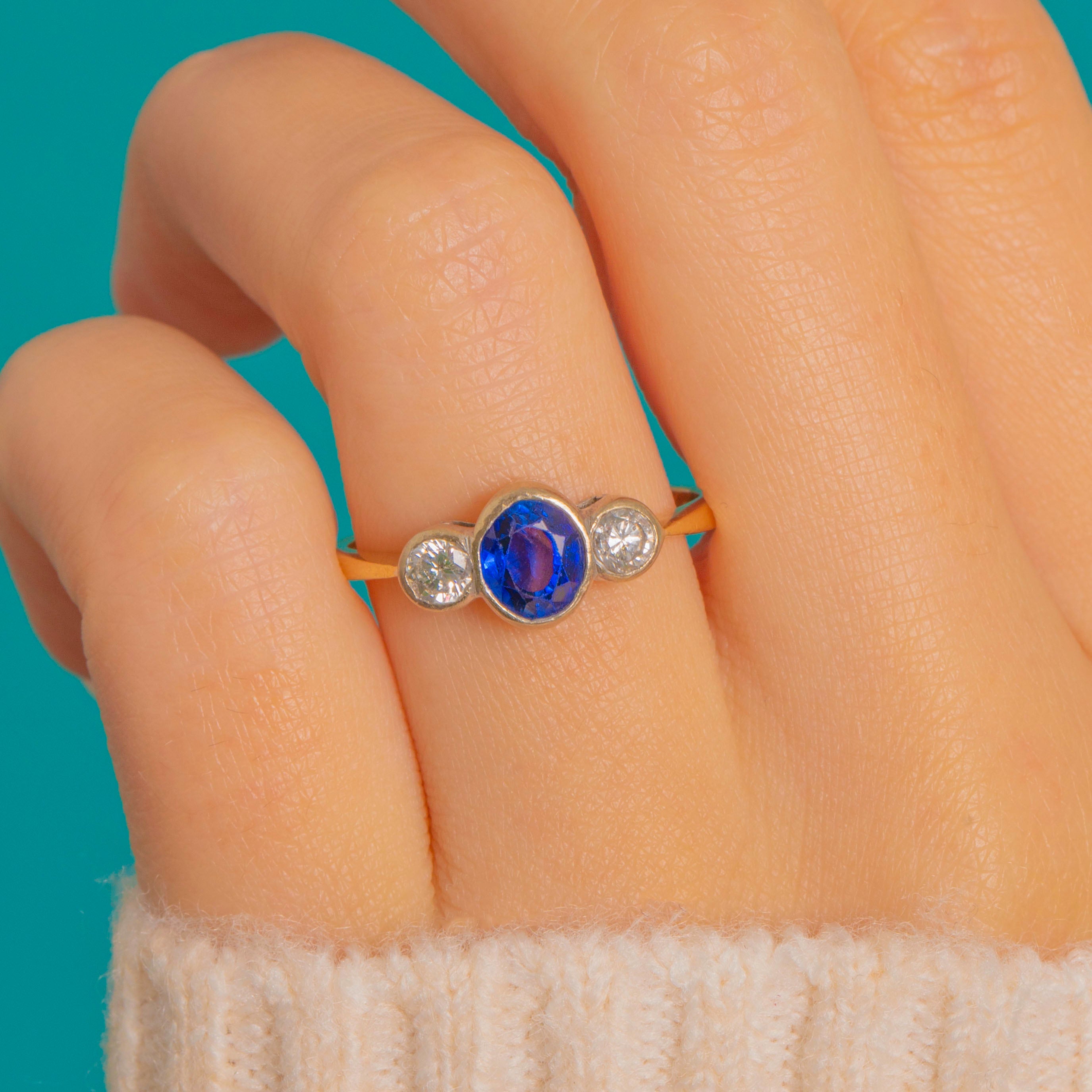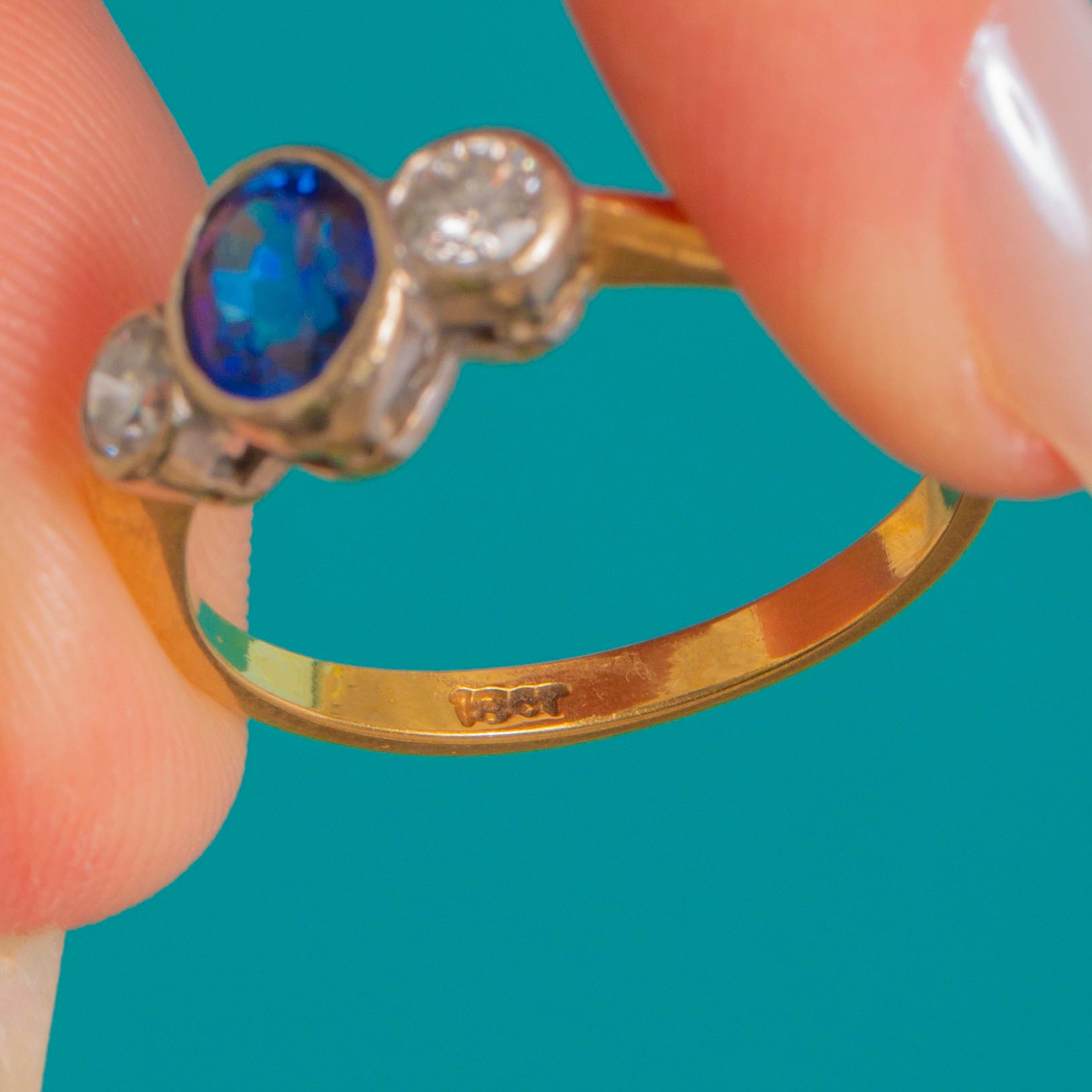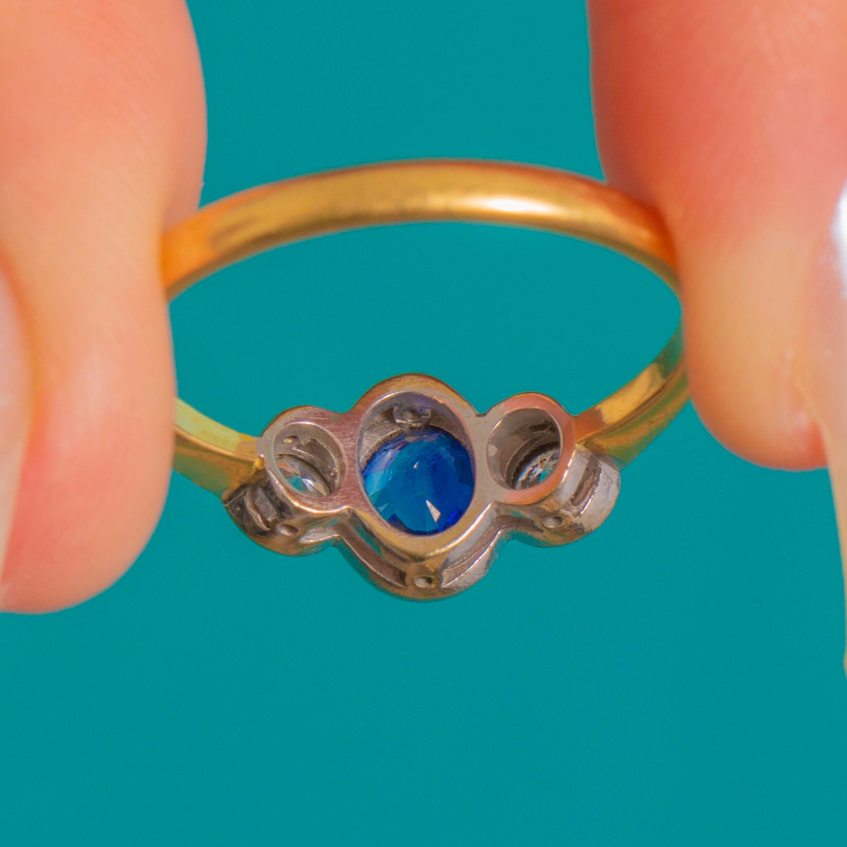 アンティーク 18ct ゴールド ロイヤルブルーサファイア ダイヤモンド トリロジーリング