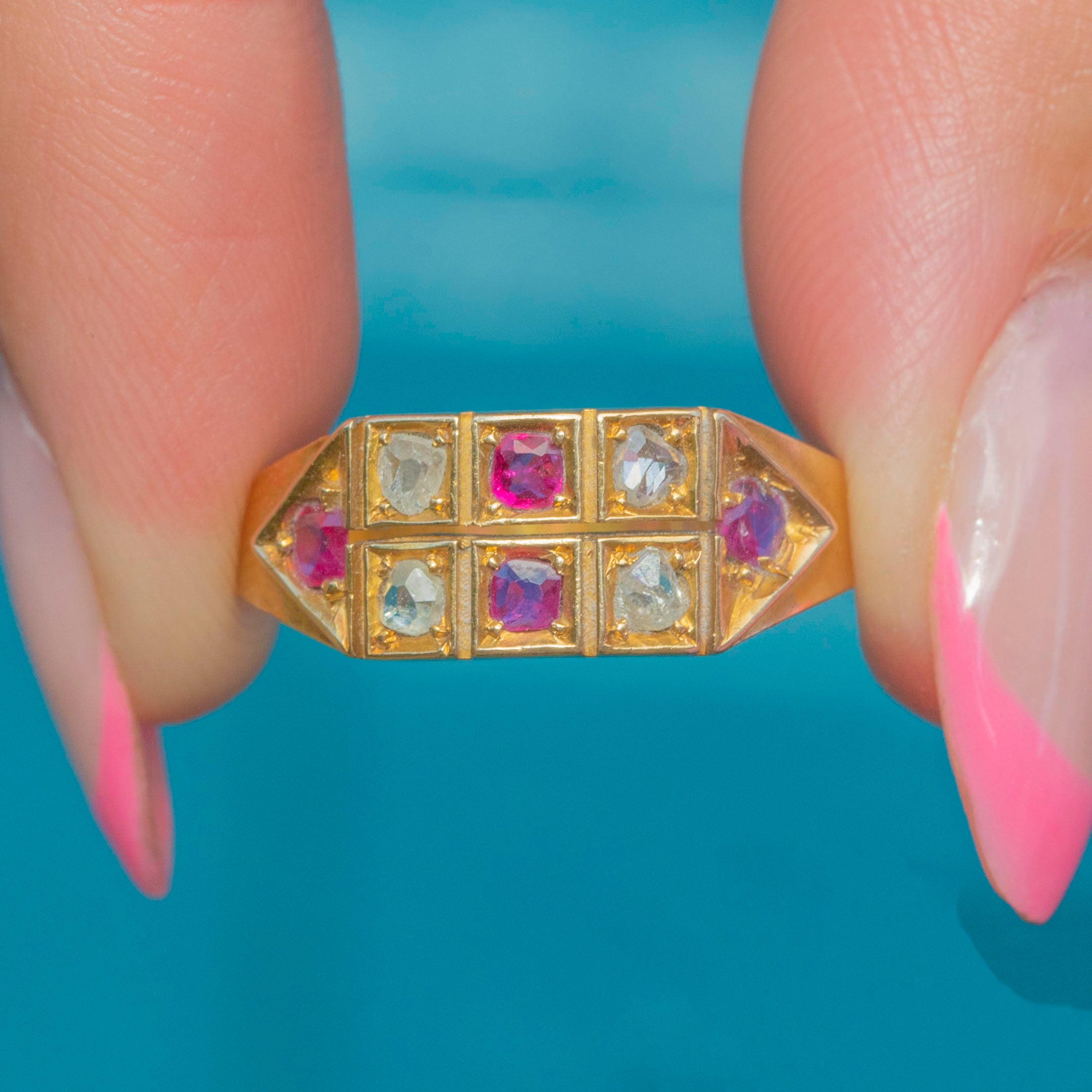 EXCELLENT: This antique 18ct Gold Ruby Diamond chequerboard ring is in excellent condition. The Gold has a bright saturation with a magnificent satin finish, and only mild age related wear visible under close inspection. The gemstones are crisply faceted and securely set, with no chips or abrasions. The chunky antique hallmarks are fully legible, allowing us to accurately date this Victorian treasure to 1876!