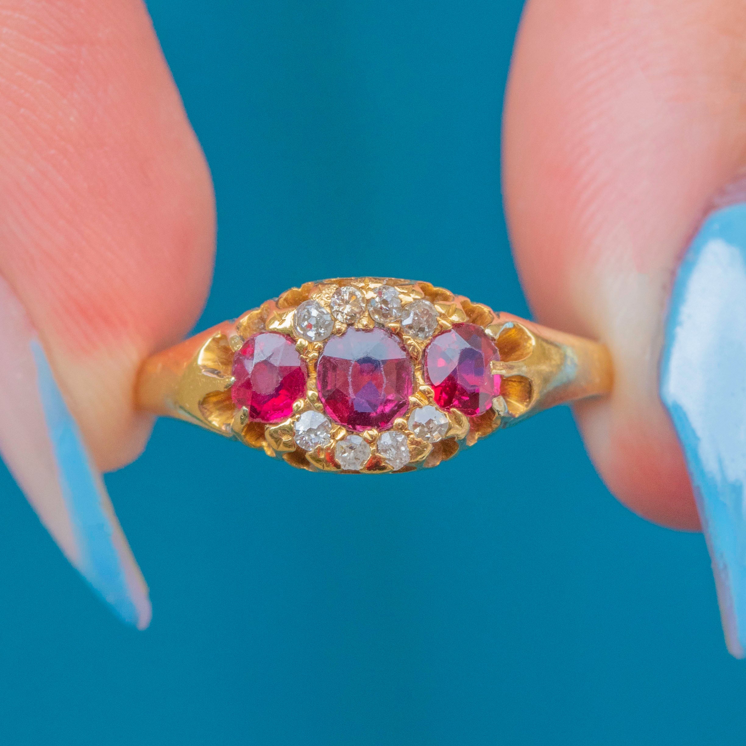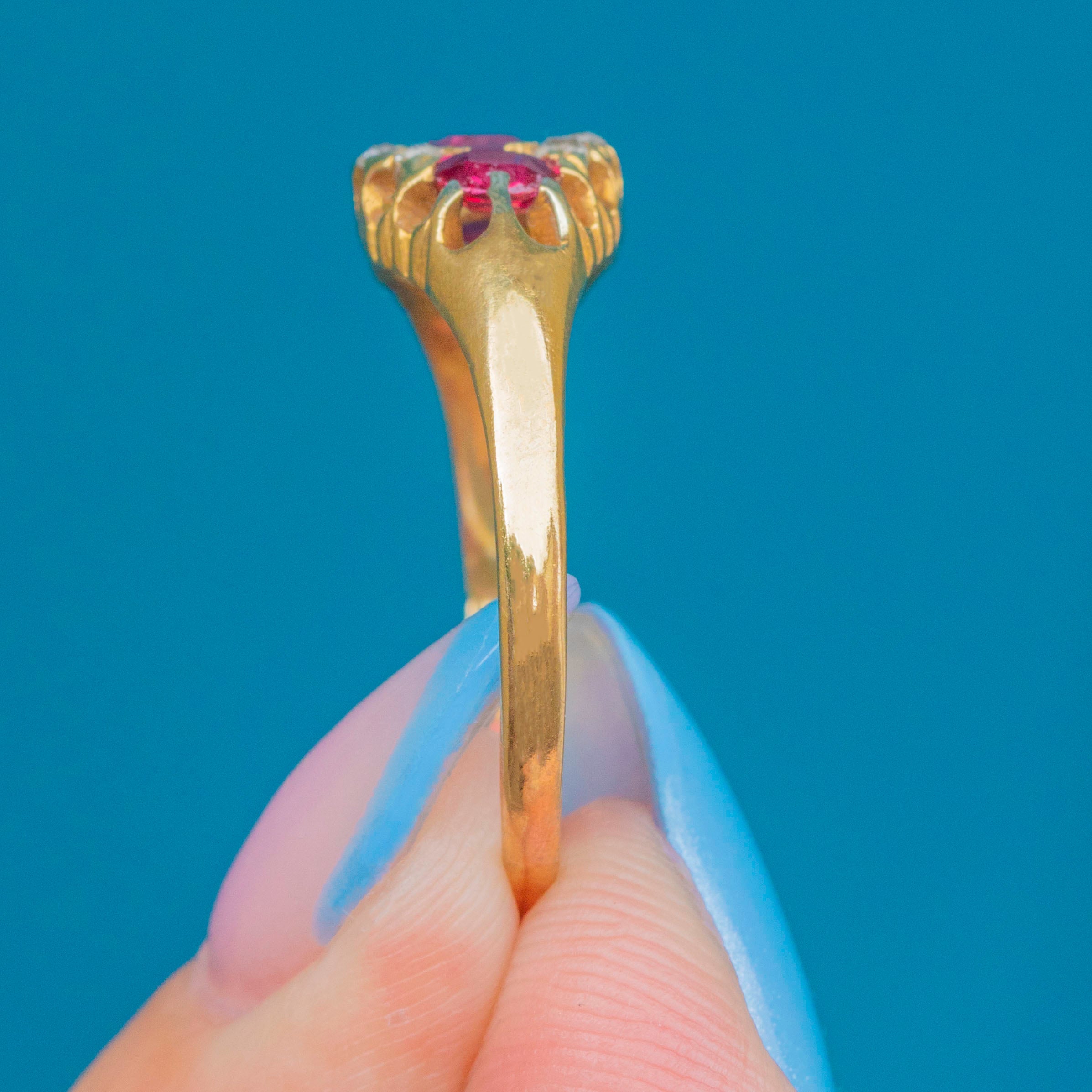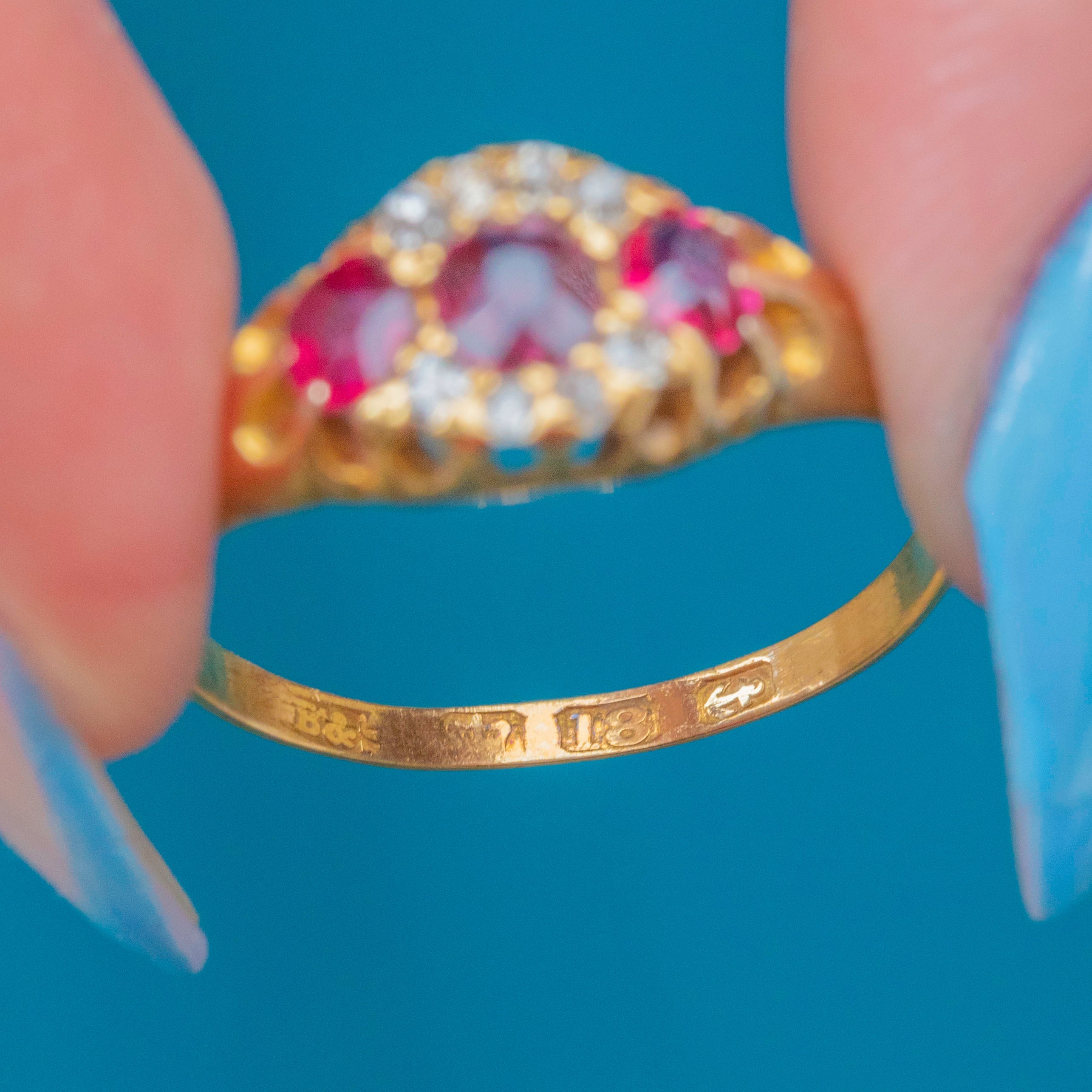 EXCELLENT: Each gemstone is radiant and securely set within the 18ct Gold. There is a very small nibble at the bottom of the central Ruby, though this cannot be seen while the ring is worn. With the smooth band providing comfortable wear, this Victorian ring is a must-have piece.
