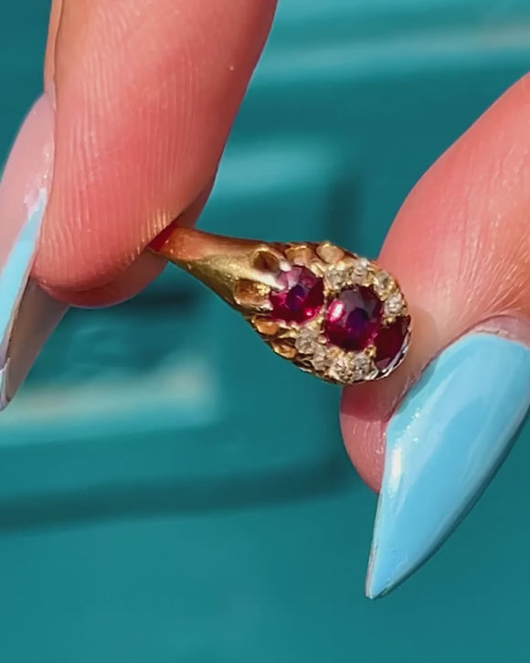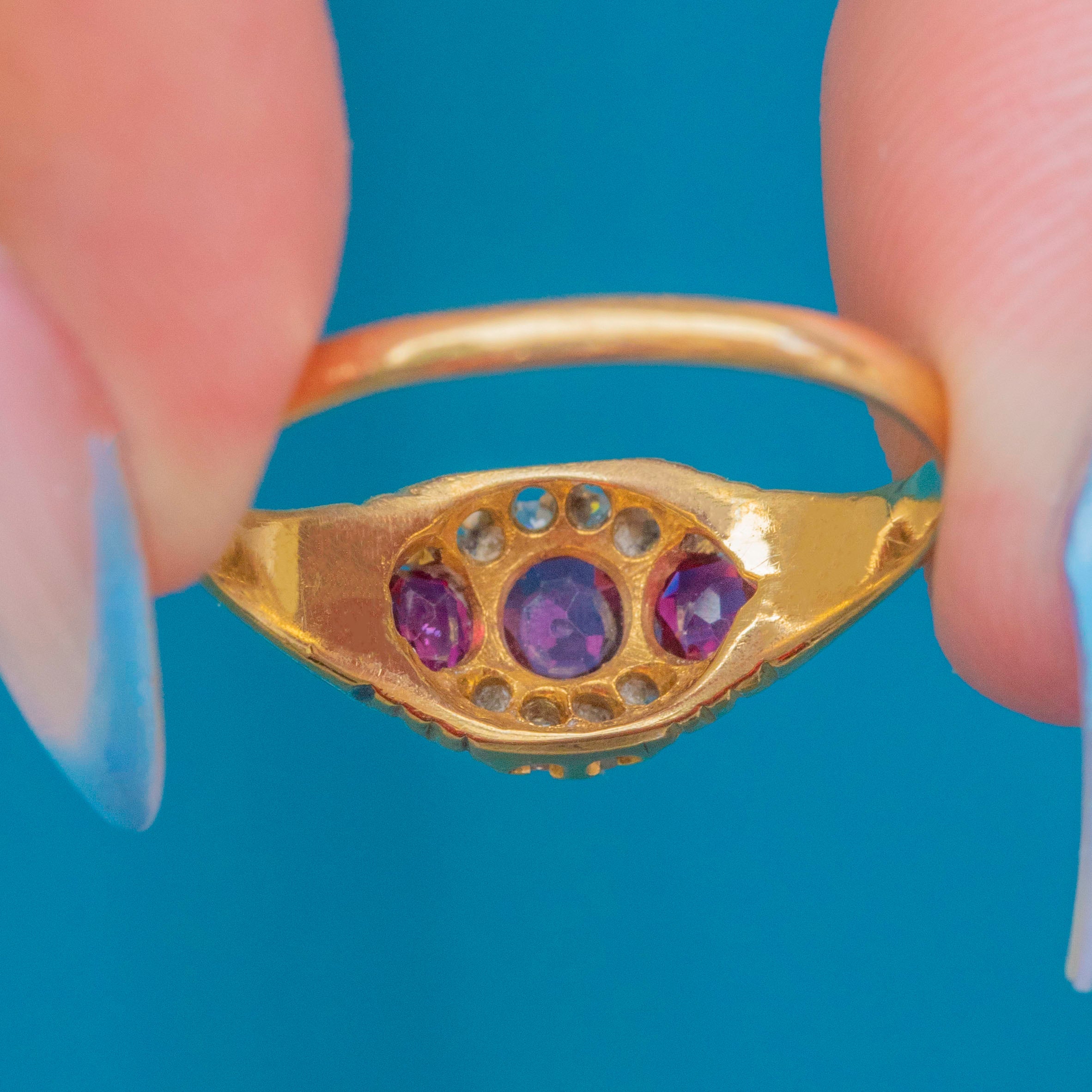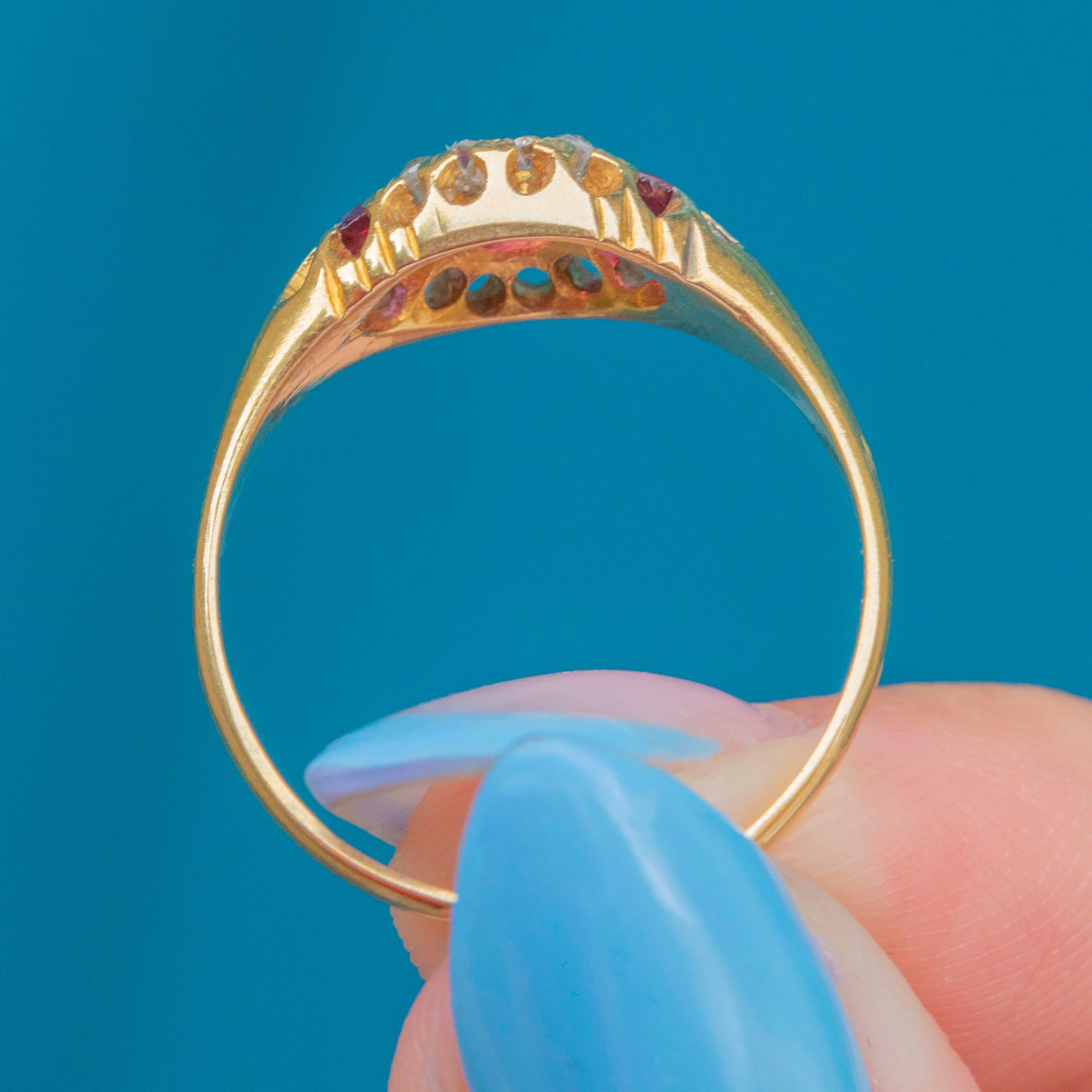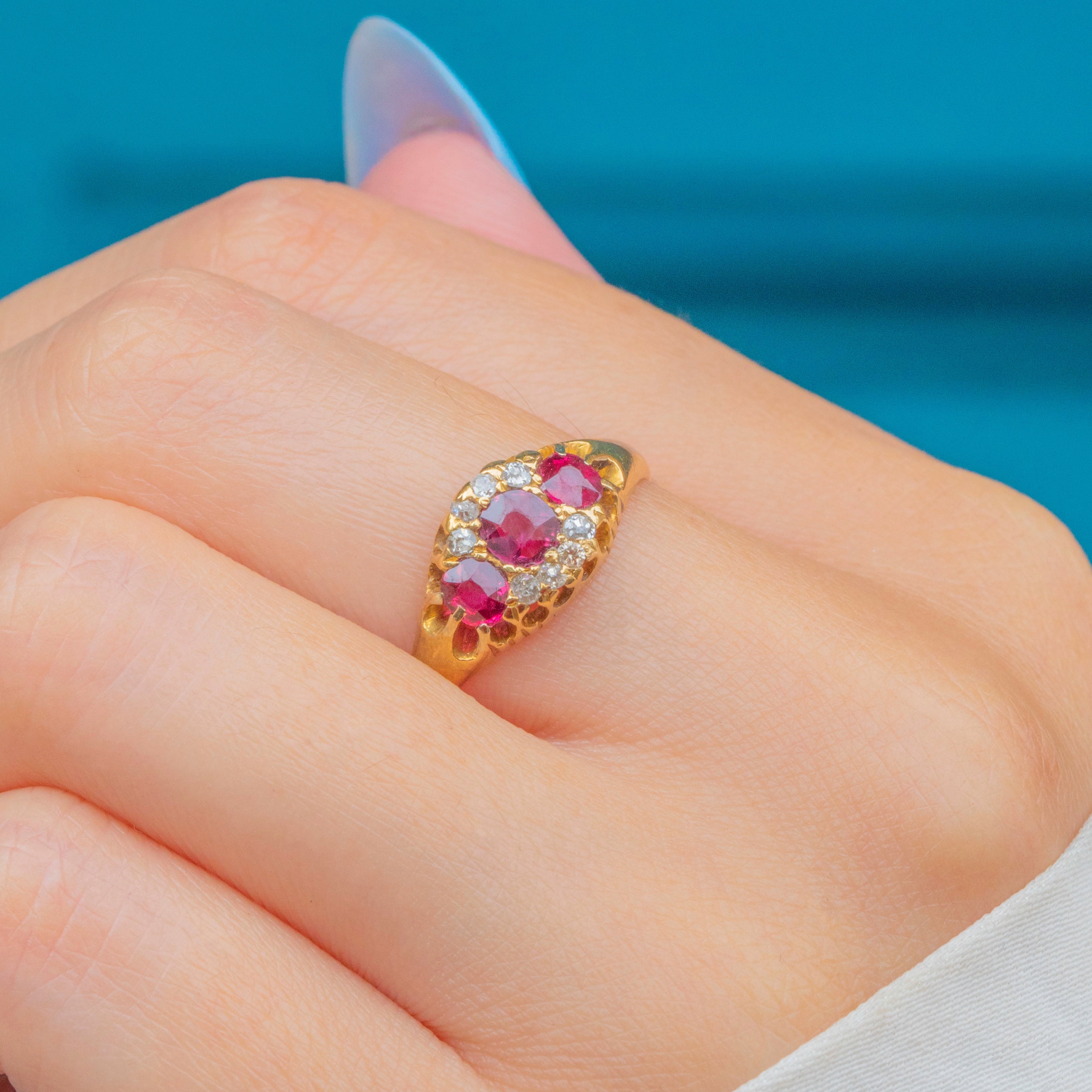 EXCELLENT: Each gemstone is radiant and securely set within the 18ct Gold. There is a very small nibble at the bottom of the central Ruby, though this cannot be seen while the ring is worn. With the smooth band providing comfortable wear, this Victorian ring is a must-have piece.