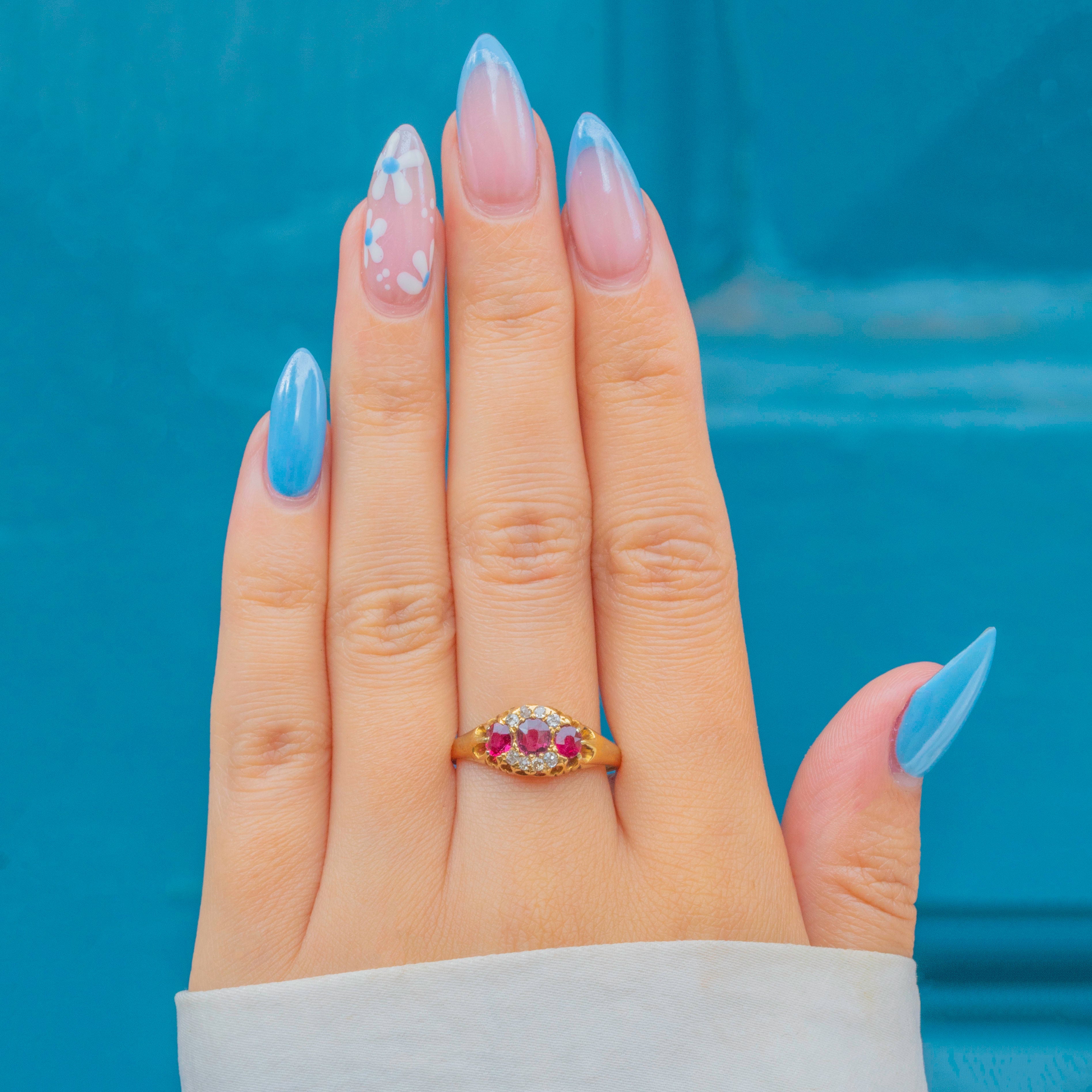 This charming Victorian boat ring boasts three dazzling natural Rubies, each with a distinct magenta hue radiating from its crisp facets. The Rubies are encircled by a halo of scintillating Diamonds and set within buttery 18ct Gold settings, exuding luxury from every curve.