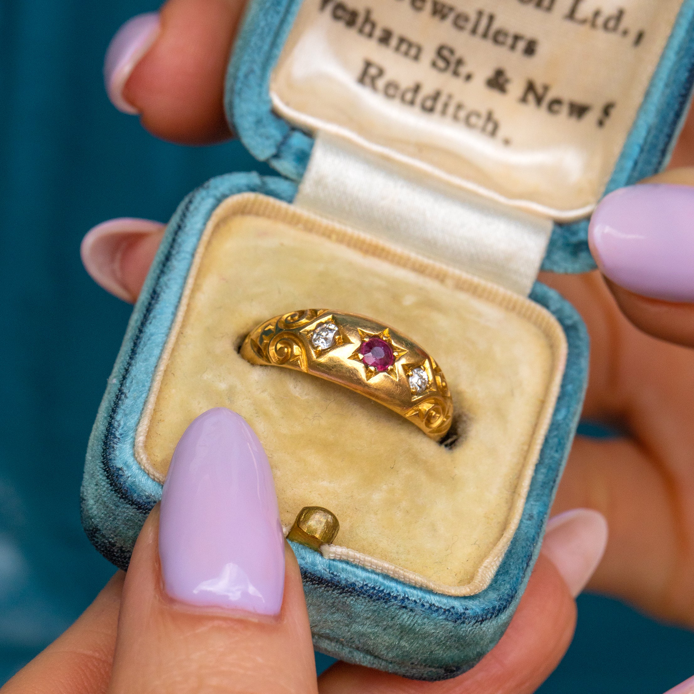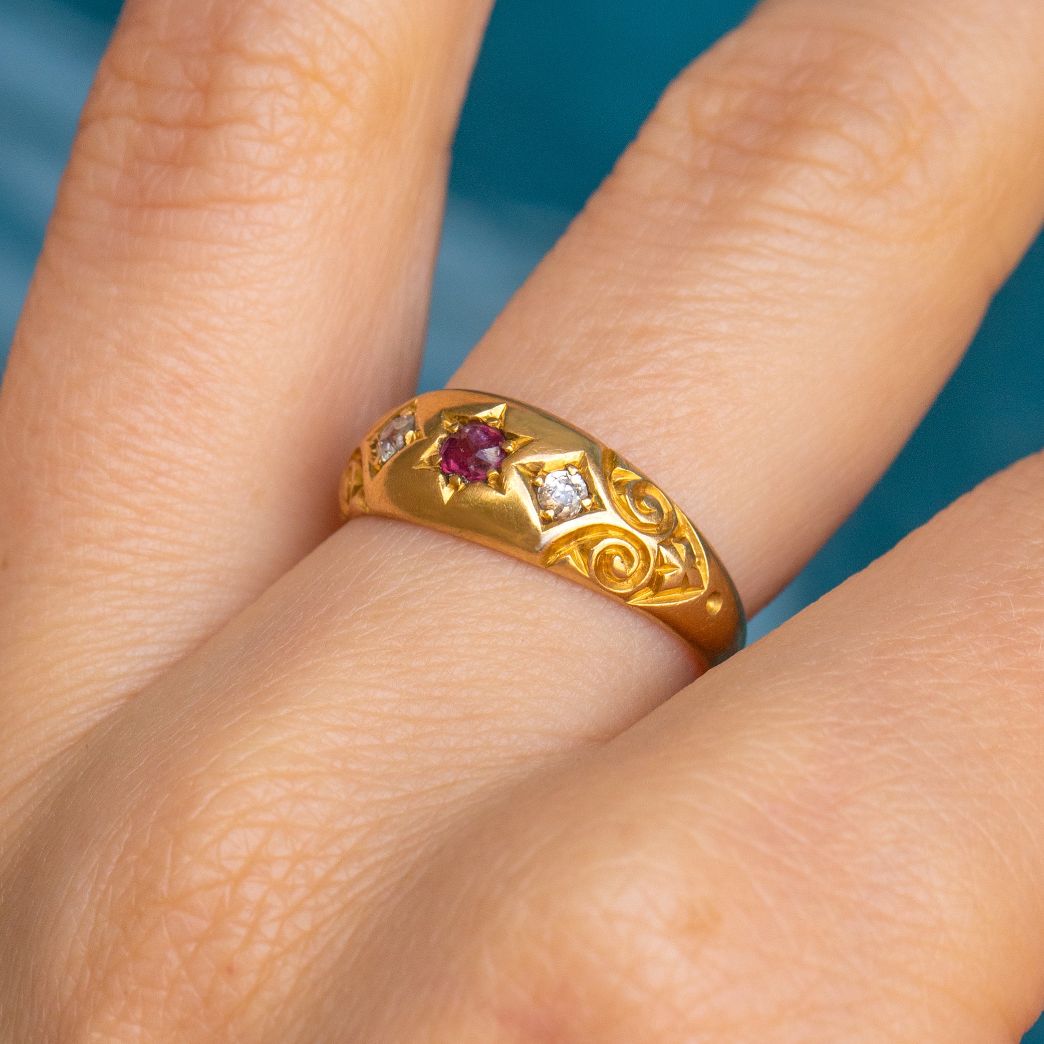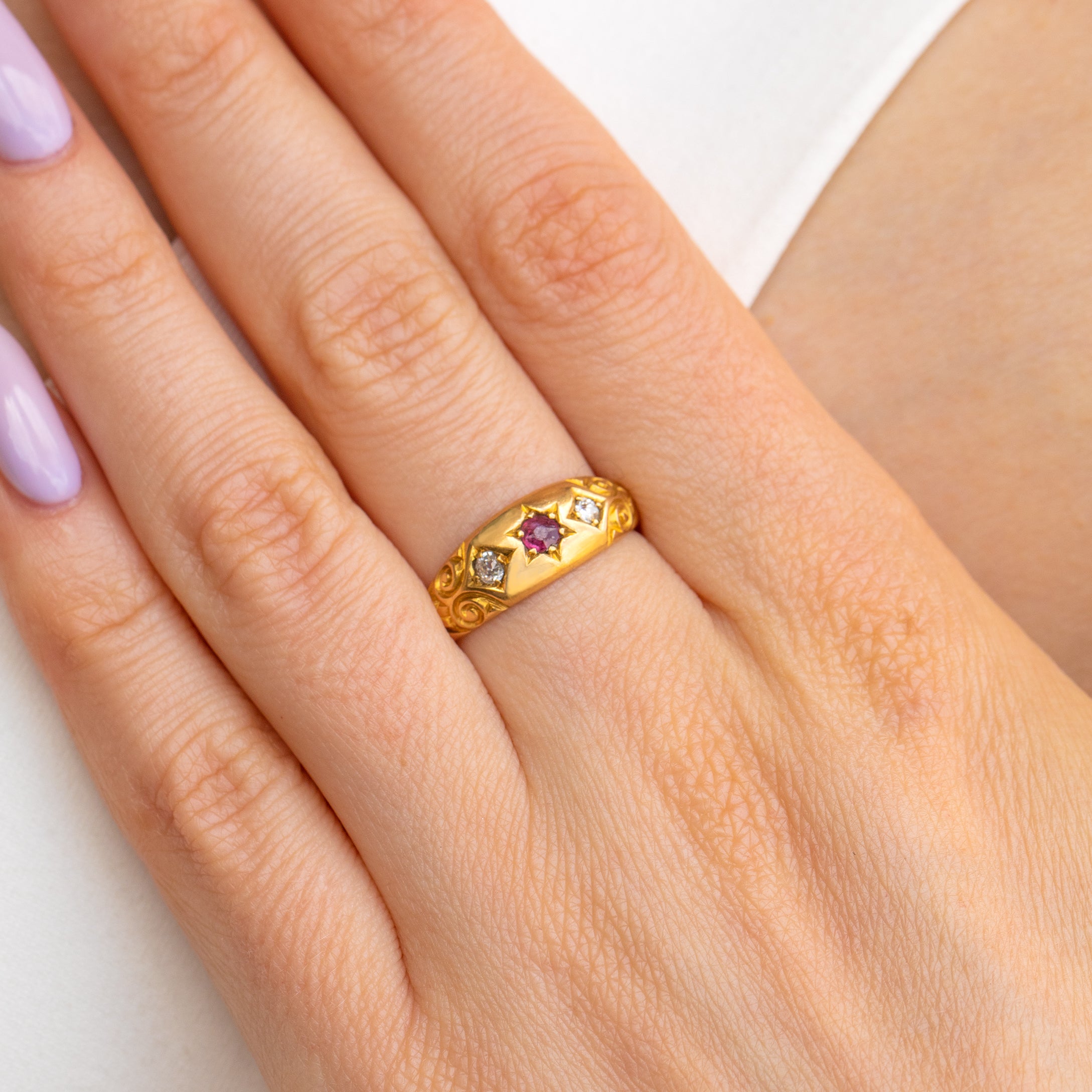 EXCELLENT. This antique 18ct Gold Ruby Diamond gypsy ring is in fantastic condition! Her 18ct Gold has lasted well with no dings to note, and her scrolled shoulders have remained lovely. The Ruby and Diamonds are securely set in their star settings, and there is no damage to the gemstones. There is a resize mark to the back of the band but the work has been carried out very well and it wears super comfortably. She would make a gorgeous addition to your antique jewellery collection!