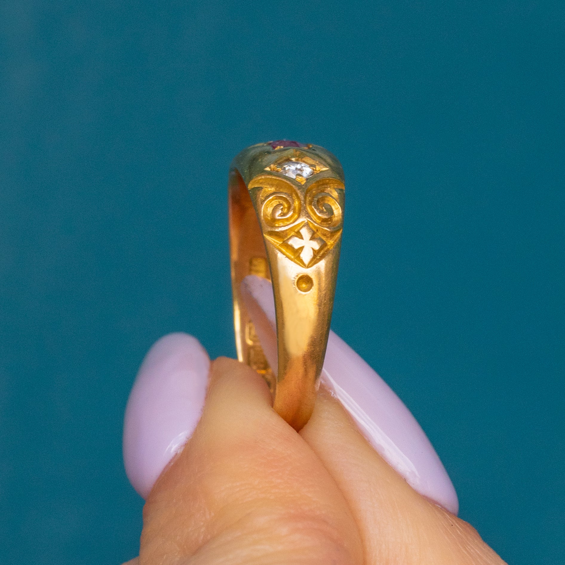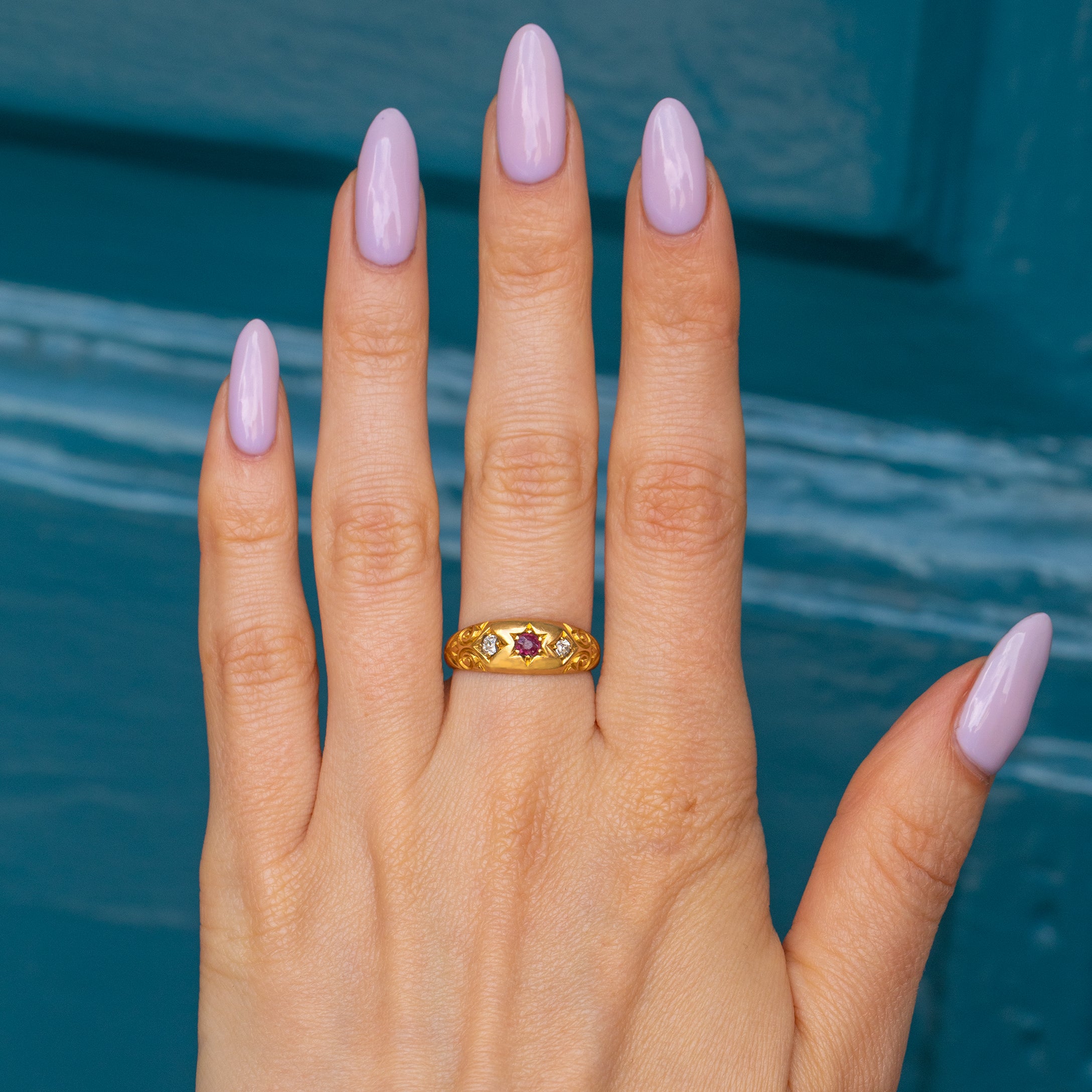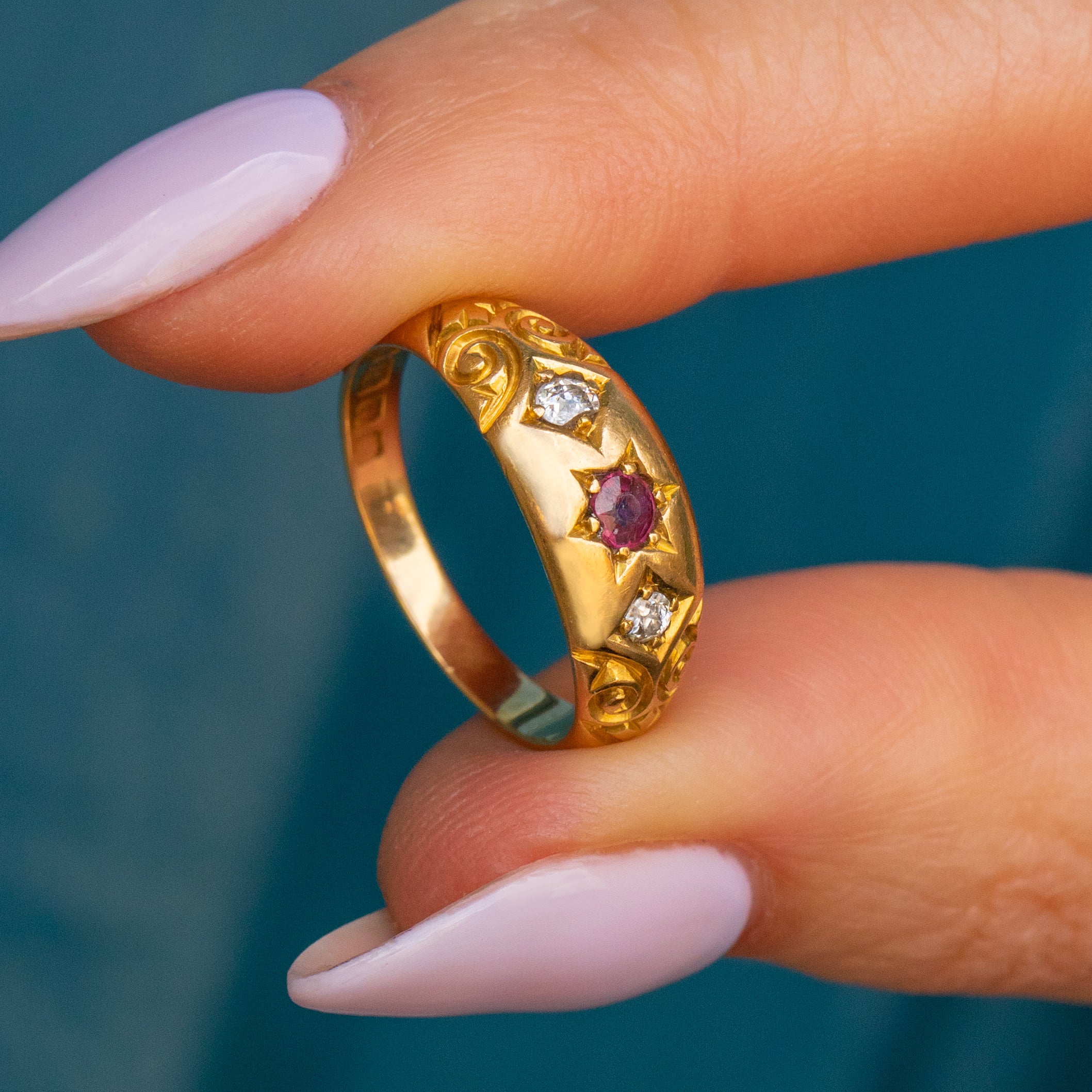 EXCELLENT. This antique 18ct Gold Ruby Diamond gypsy ring is in fantastic condition! Her 18ct Gold has lasted well with no dings to note, and her scrolled shoulders have remained lovely. The Ruby and Diamonds are securely set in their star settings, and there is no damage to the gemstones. There is a resize mark to the back of the band but the work has been carried out very well and it wears super comfortably. She would make a gorgeous addition to your antique jewellery collection!