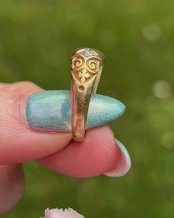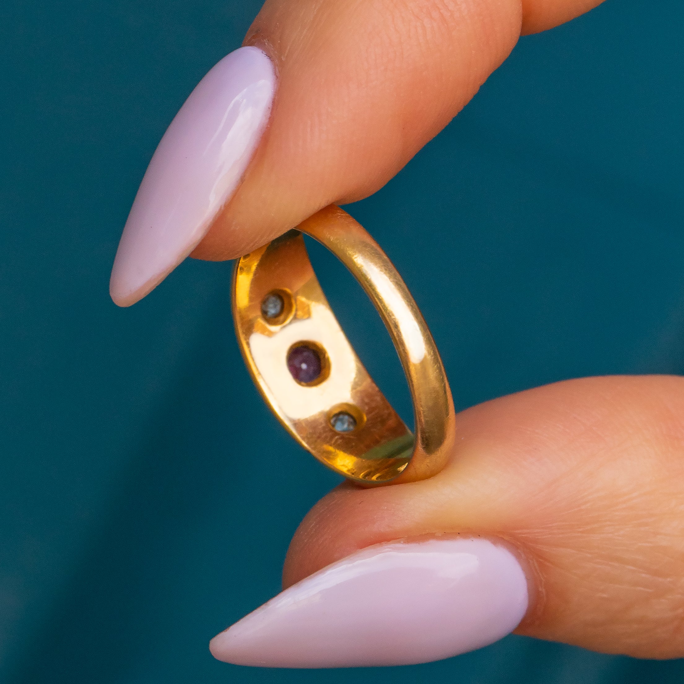 "Gypsy" rings were a favourite in the late Victorian era, beloved for their timeless elegance, which remains today, and this beautiful trilogy ring is no exception. Her 18ct Gold band remains buttery and bright with an elegant swirled design framing her gemstones. Oozing antique charm, she is a must-have for your collection!