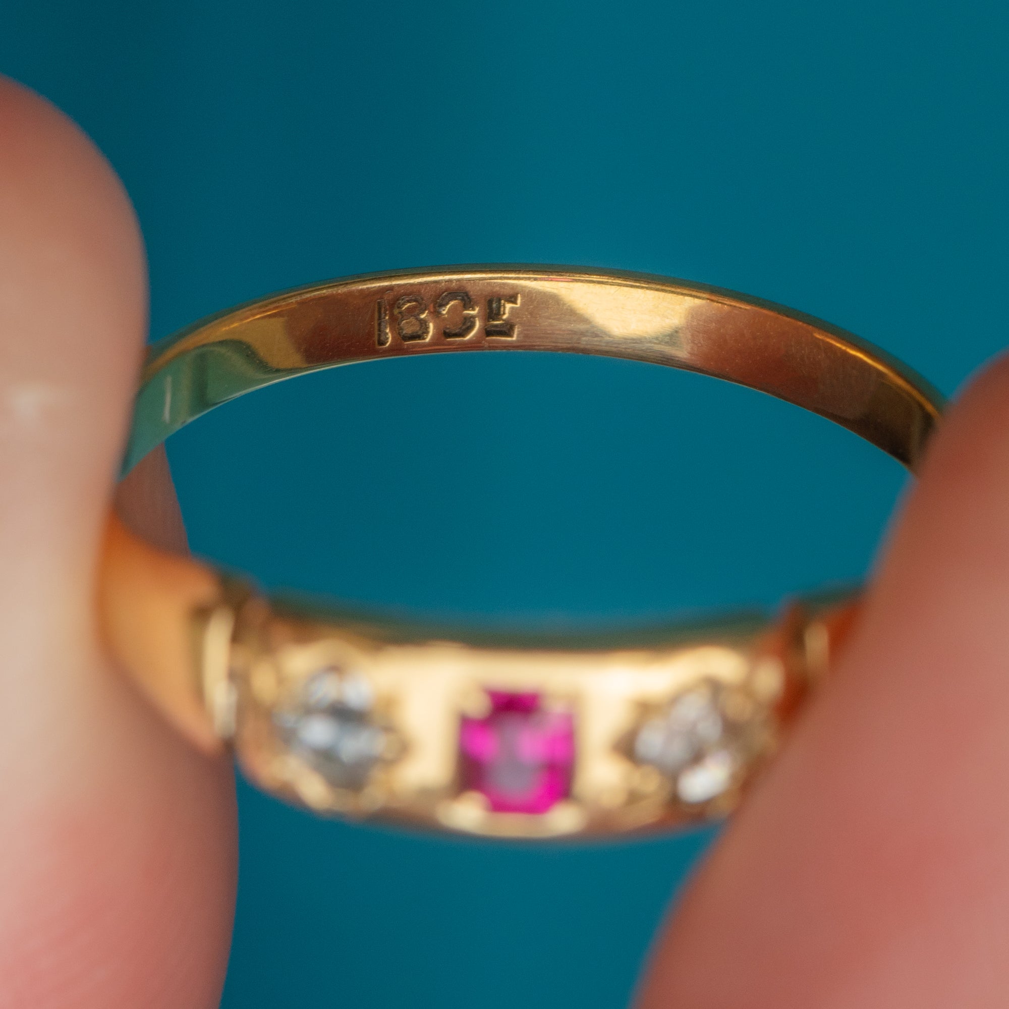 VERY GOOD-EXCELLENT: This antique 18ct Gold Ruby Diamond gypsy ring is in wonderful condition. The Gold is bright and buttery and the band has kept its form well, with only mild surface wear visible under close inspection. One of the claws on the Ruby setting has worn down, but it remains securely set. The gemstones have been immaculately preserved, free from fleabites or abrasions. With plenty of wear potential, don't hesitate to make this Victorian Ruby Diamond ring your newest acquisition!