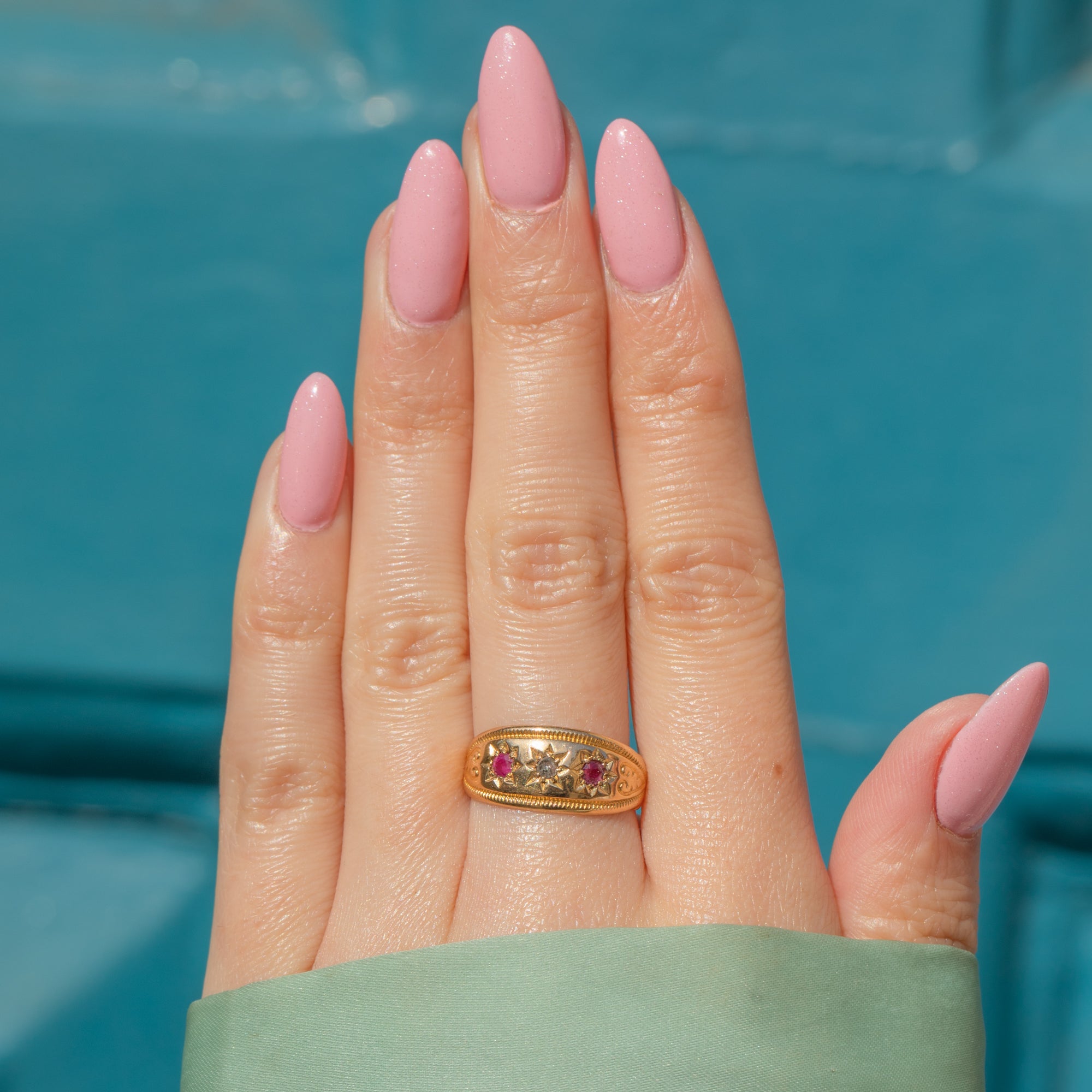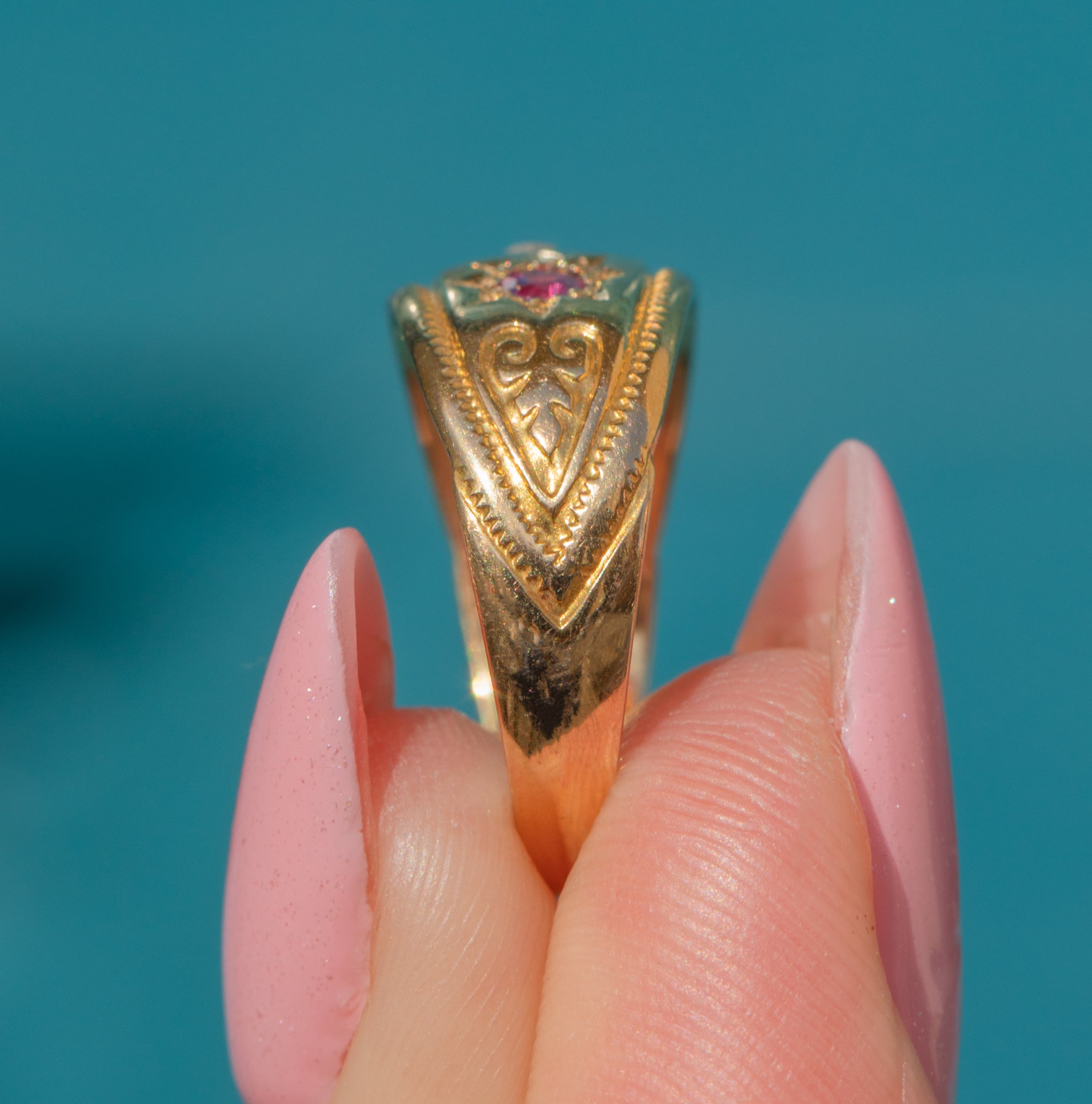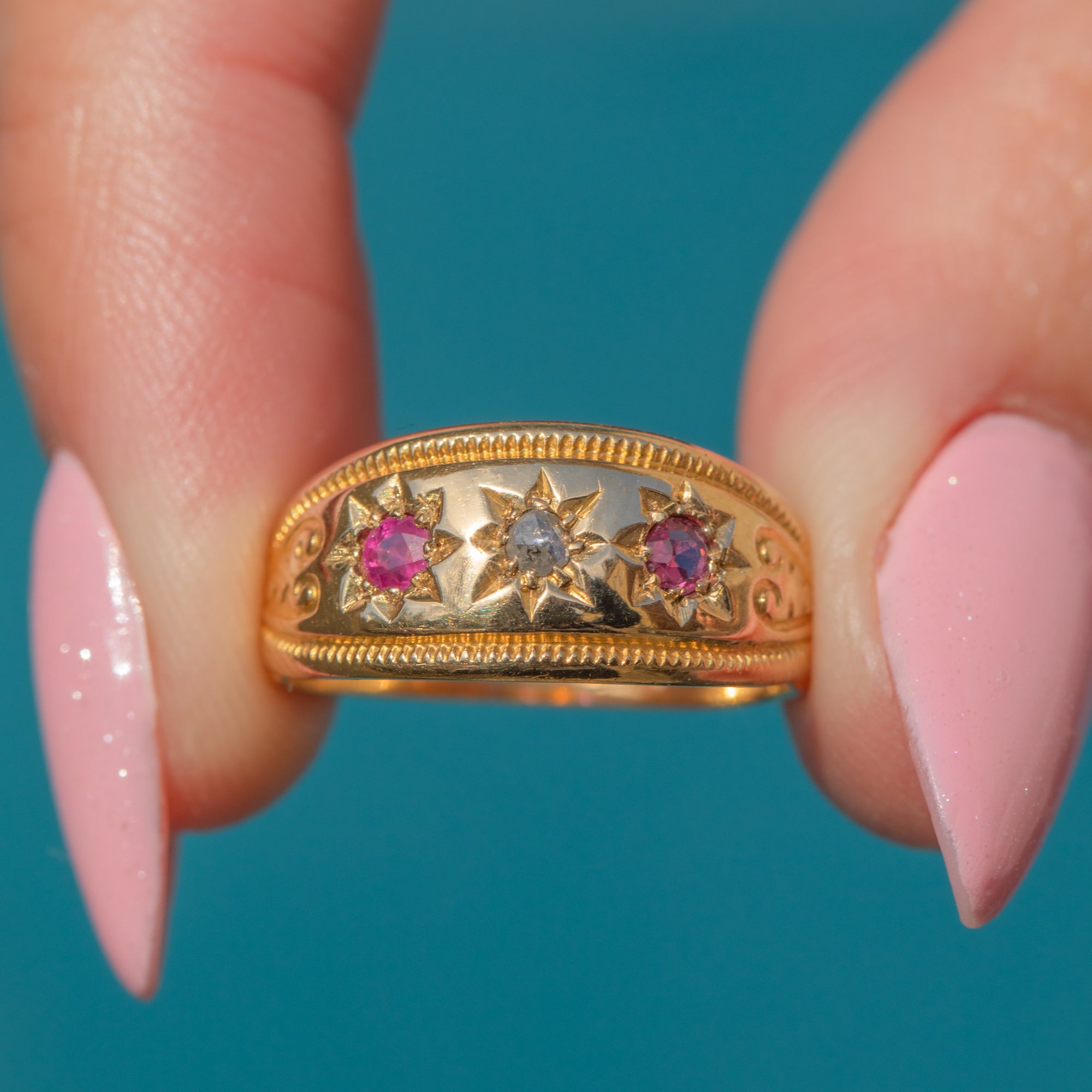 The curvaceous band displays a dainty rose-cut Diamond flanked by vibrant fuchsia Rubies, creating an eye-catching gemstone trilogy. The gems are framed by a striking textured border and swirled engraved shoulders adding a decorative touch. With a low profile, this antique gypsy ring is perfect for everyday wear and can be enjoyed as a standalone piece or stacked amongst your other favourite gems!