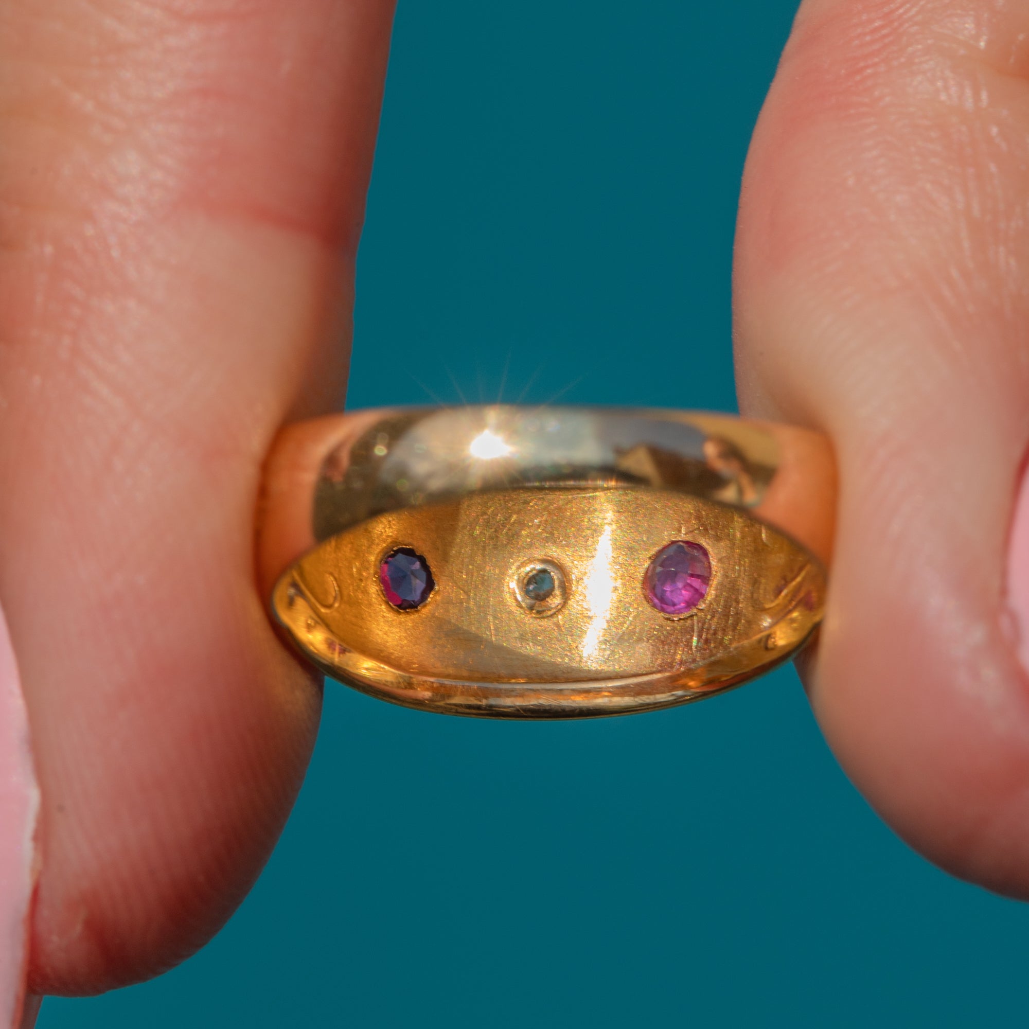 VERY GOOD: This antique 18ct Gold Ruby Diamond gypsy ring is in very good condition. The gemstones are all securely set and although the Diamond has a small nibble, this is difficult to spot without a jeweller's loupe. The Gold is gloriously bright and the engraved details have all remained crisp. Unfortunately, the date letter has been worn down over the years so we're unable to accurately date this piece, but the rare Chester Assay stamp is defined and we are confident that this ring is Victorian due to its distinct style. With plenty of wear potential, you'll adore having this stunning Victorian Gold gypsy ring in your collection!
