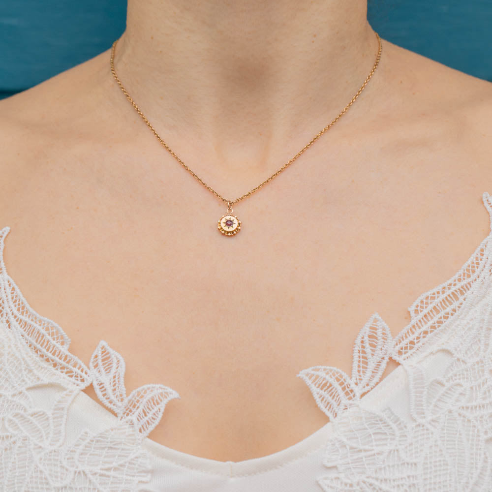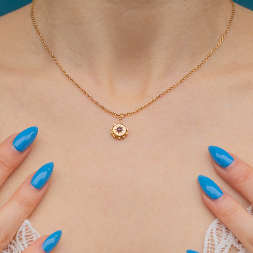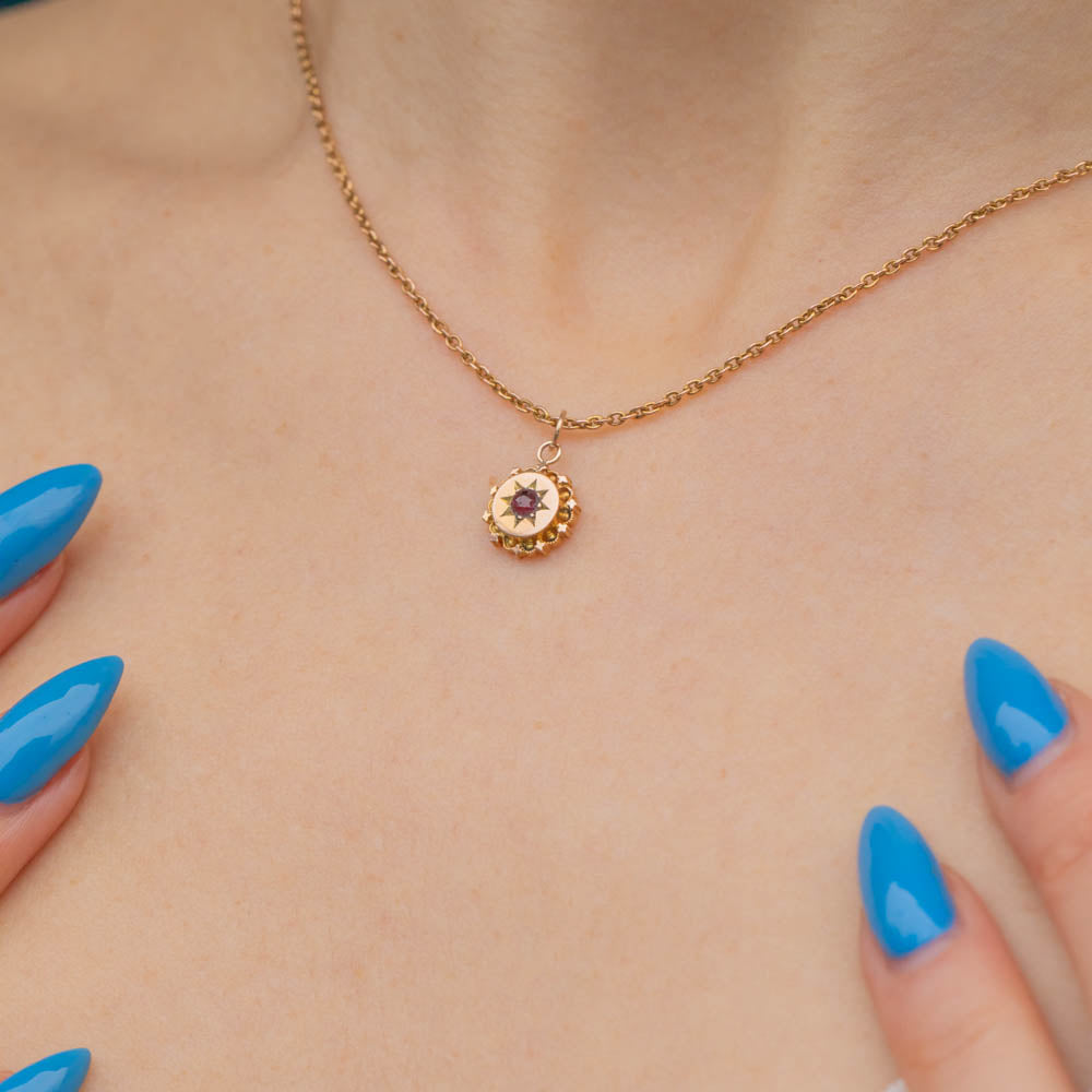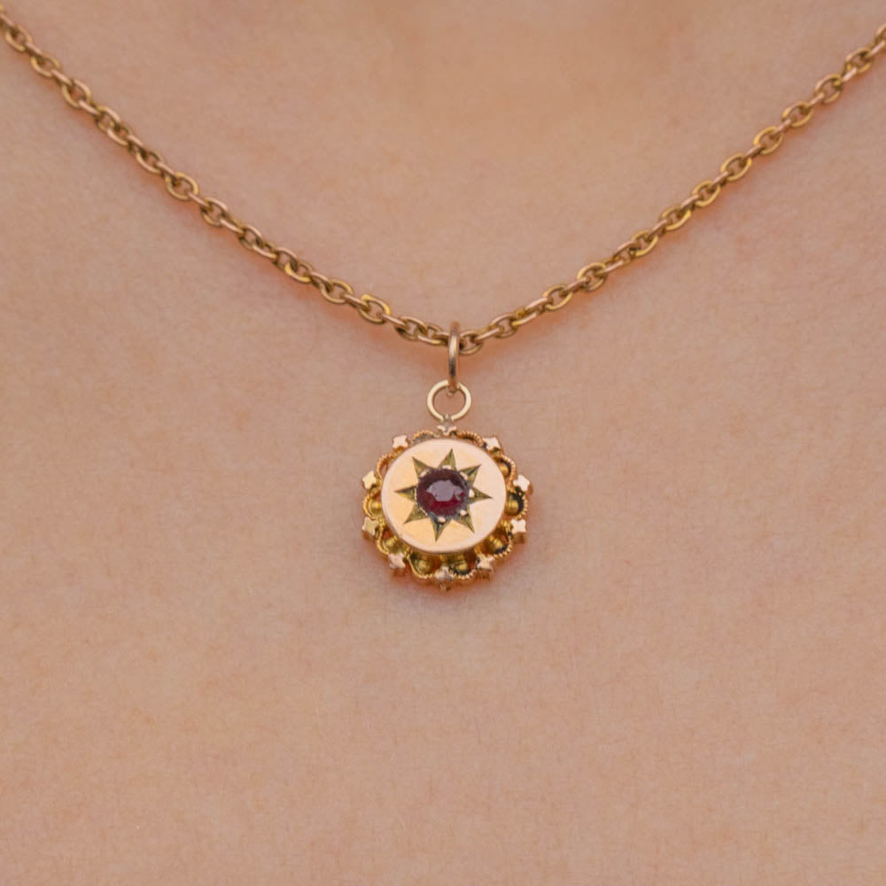 Whether worn alone or incorporated into a necklace stack, this antique Ruby pendant is perfect for everyday wear and will instantly add a touch of celestial charm to your outfit!