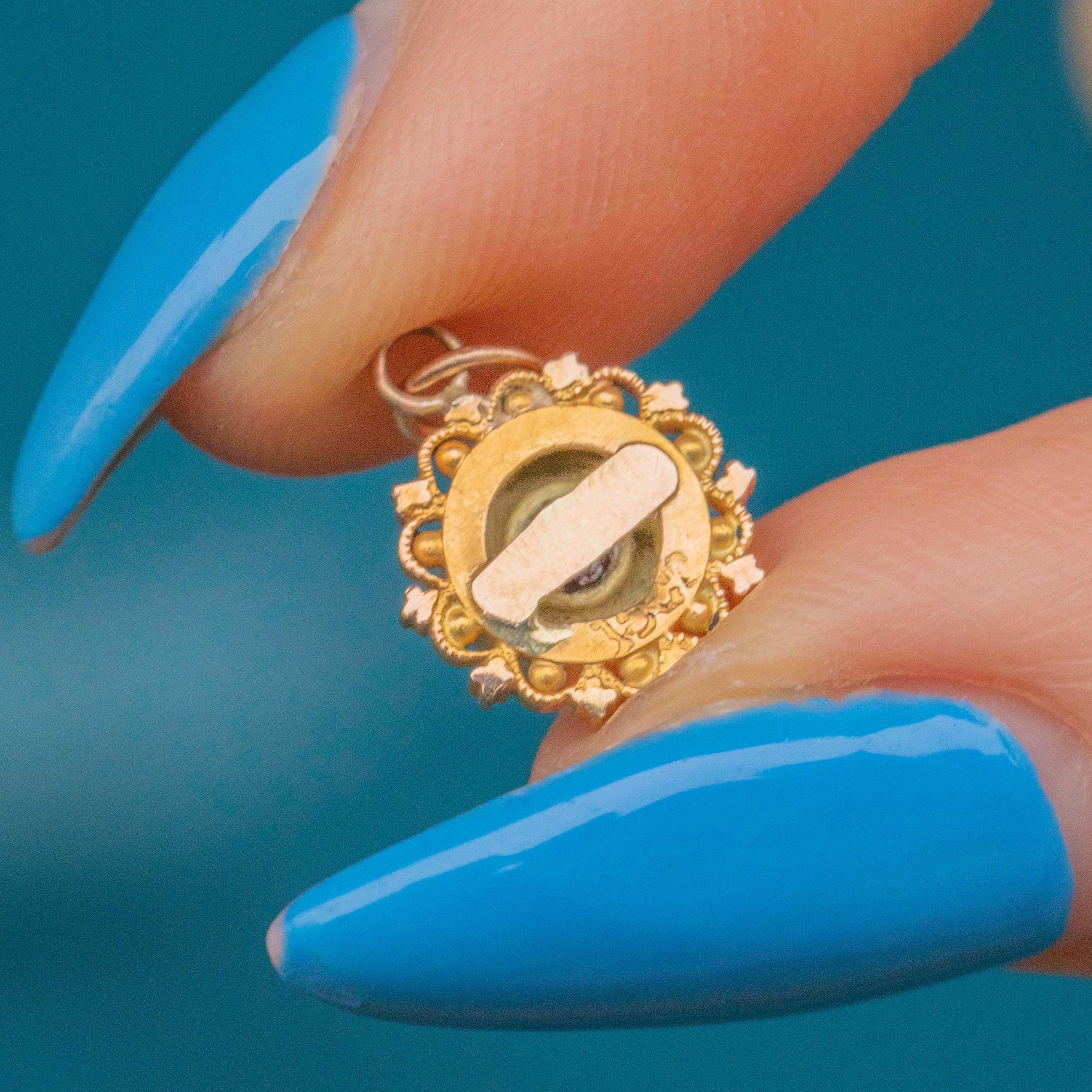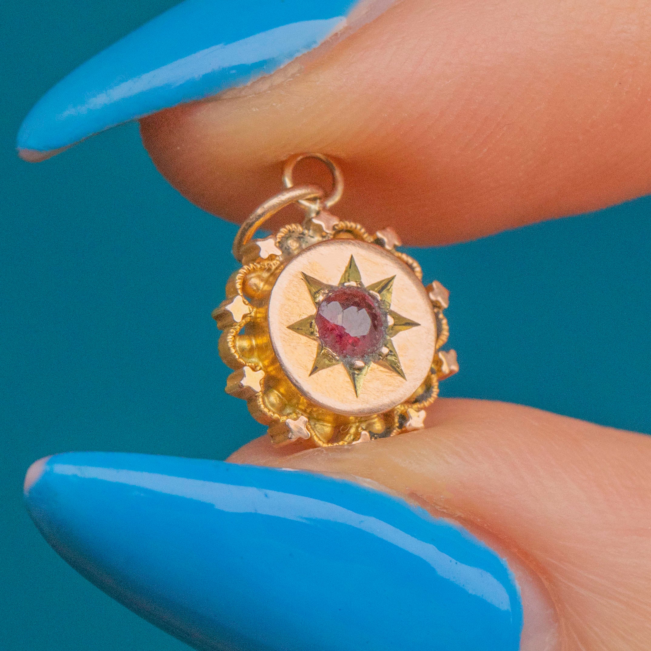 This antique 18ct Gold Ruby Etruscan charm is the perfect dainty treasure! Crafted from sumptuous 18ct Gold, this Victorian charm displays a glimmering cerise Ruby within a pretty star setting, haloed by ornate details that define Etruscan revival jewellery.