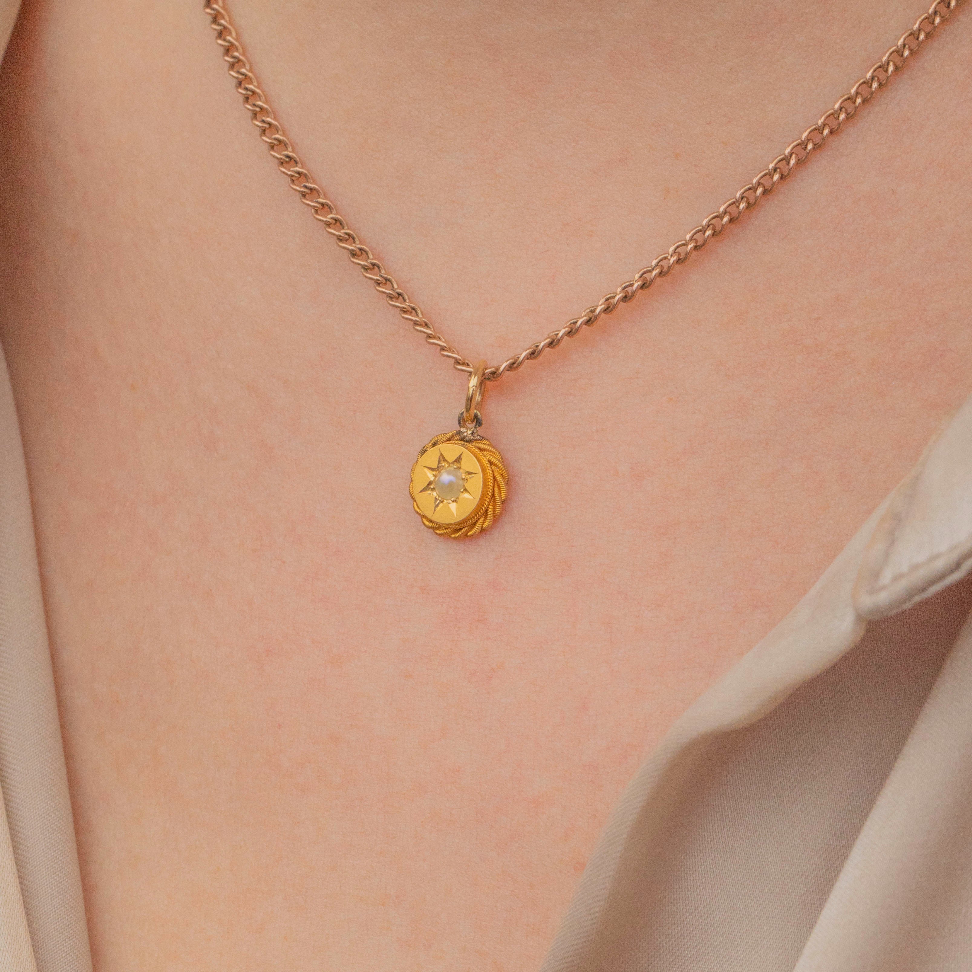 VERY GOOD. This Victorian 18ct Gold Pearl star-set charm is in very good condition. The Gold is brightly saturated and the details are free from signs or wear. There is signs of a conversion from a stick pin on the back, but the charm wears comfortably against the skin and this can't be seen from the front. The Pearl is securely set with no visible surface wear. All in all, a lovely little Victorian charm to add to your collection!