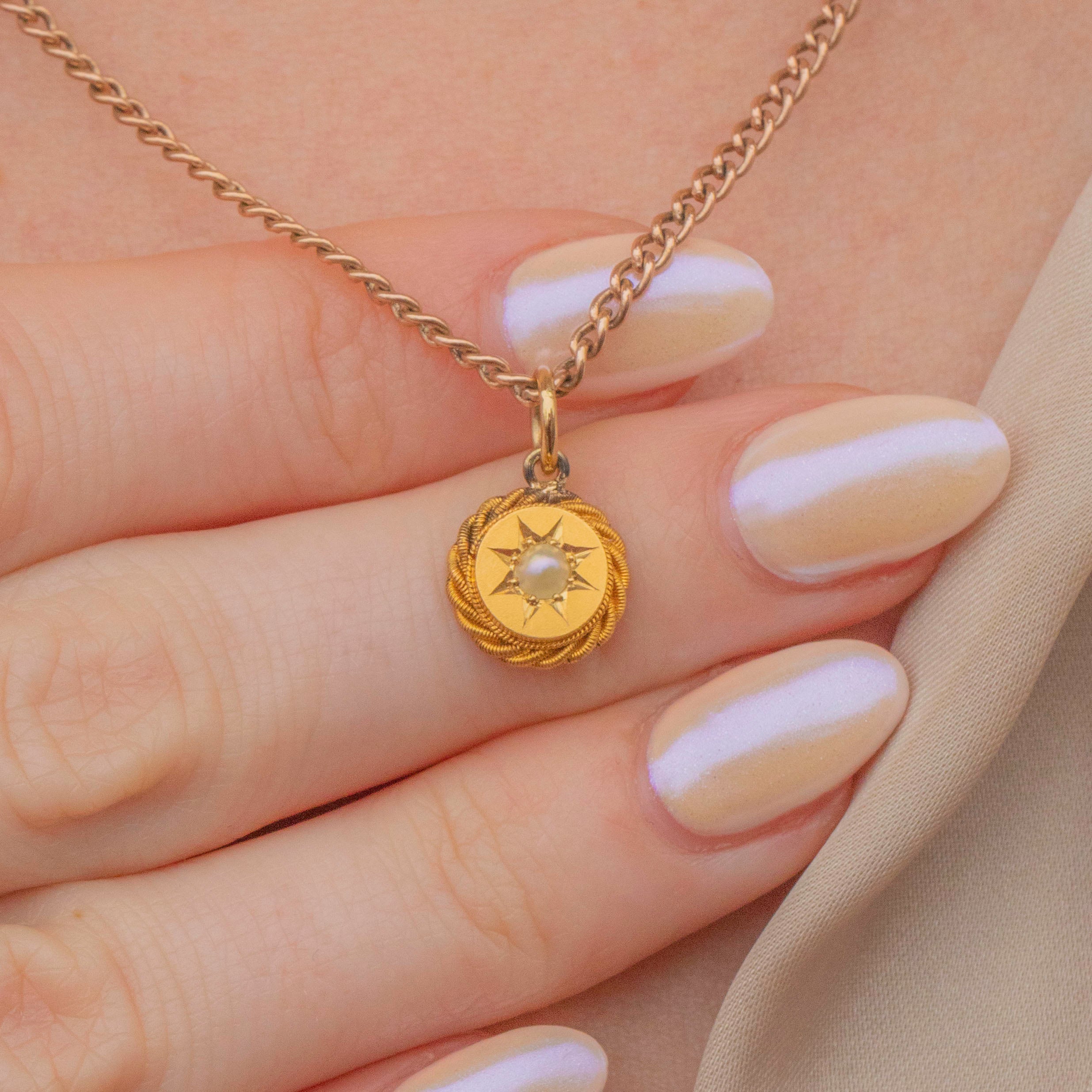Add a touch of celestial allure to your outfit with this sweet Victorian 18ct Gold Pearl star-set charm! The 18ct Gold is brightly saturated, encasing a crisp white Pearl within a bold star setting in its centre, haloed by a rope border for a decorative finish.