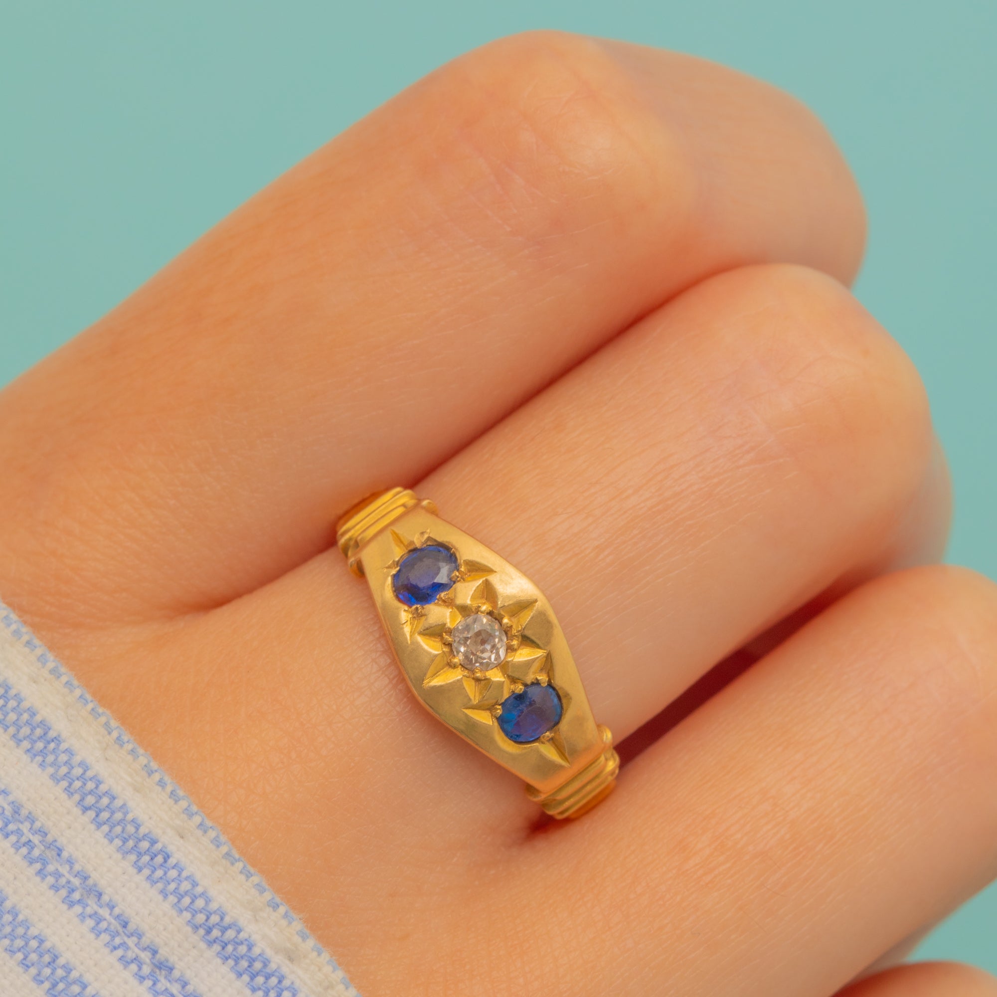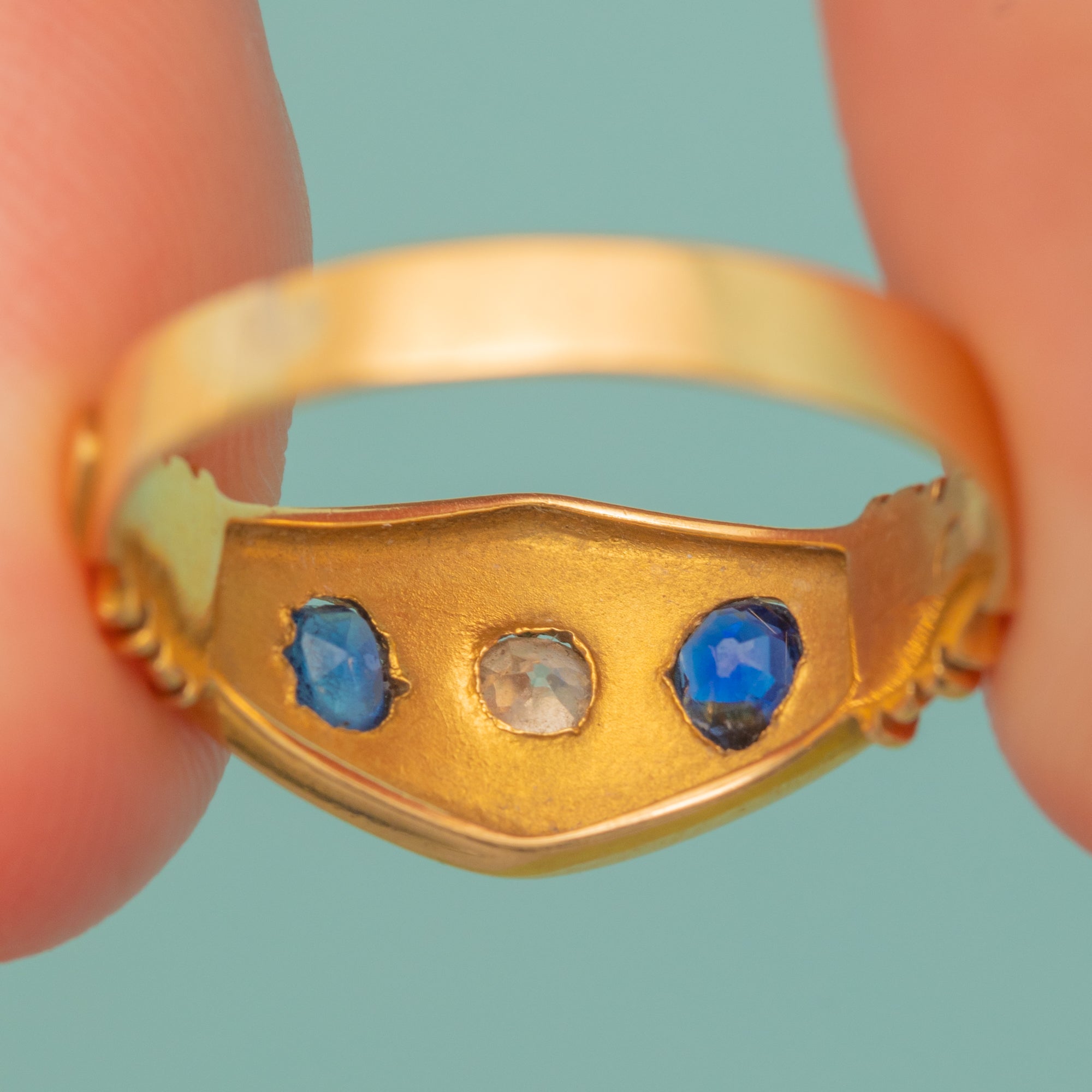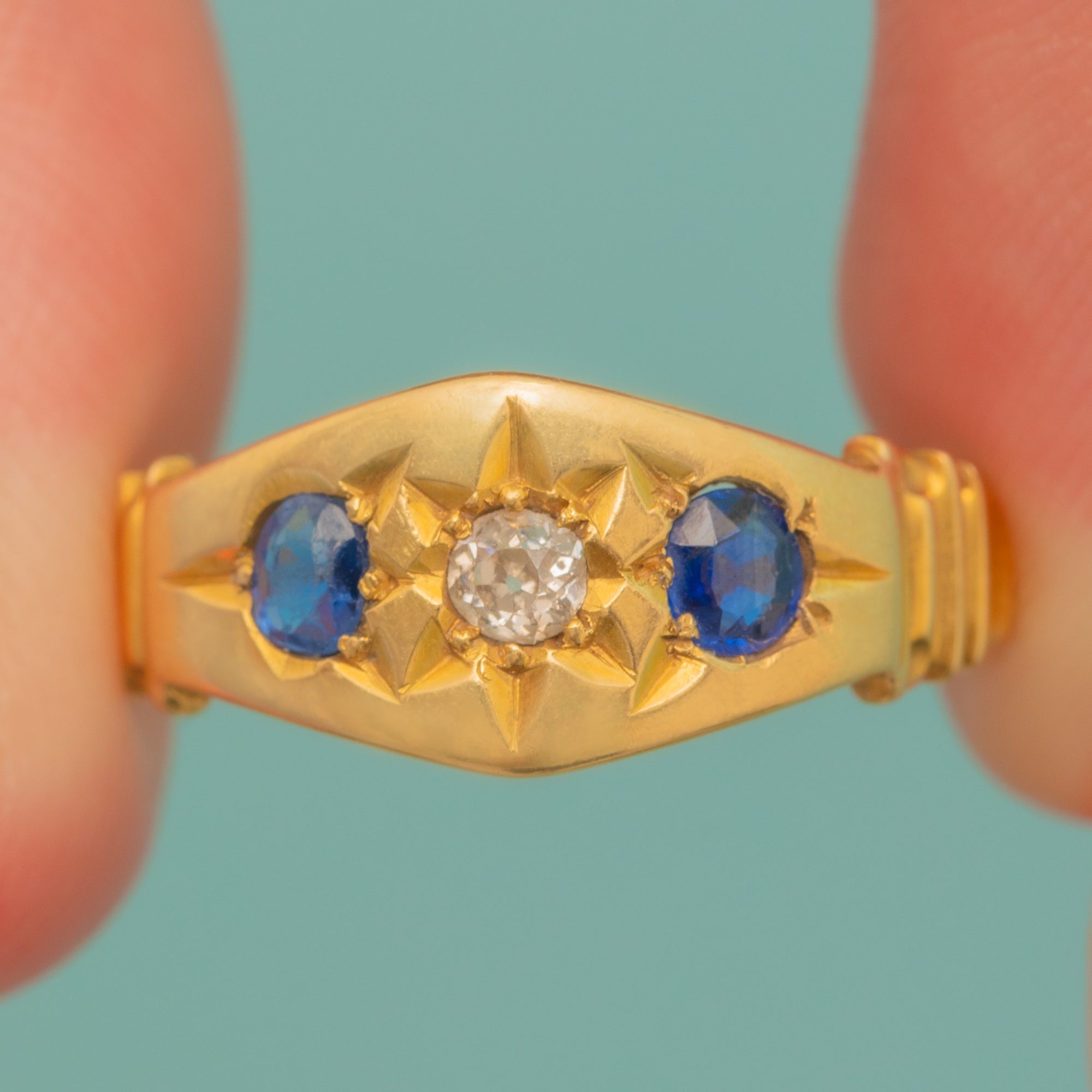 This antique 18ct Gold Sapphire Diamond gypsy ring is divine! Inlaid with two Aegean blue Sapphires and a scintillating Diamond, you'll certainly want this piece in your jewellery box.