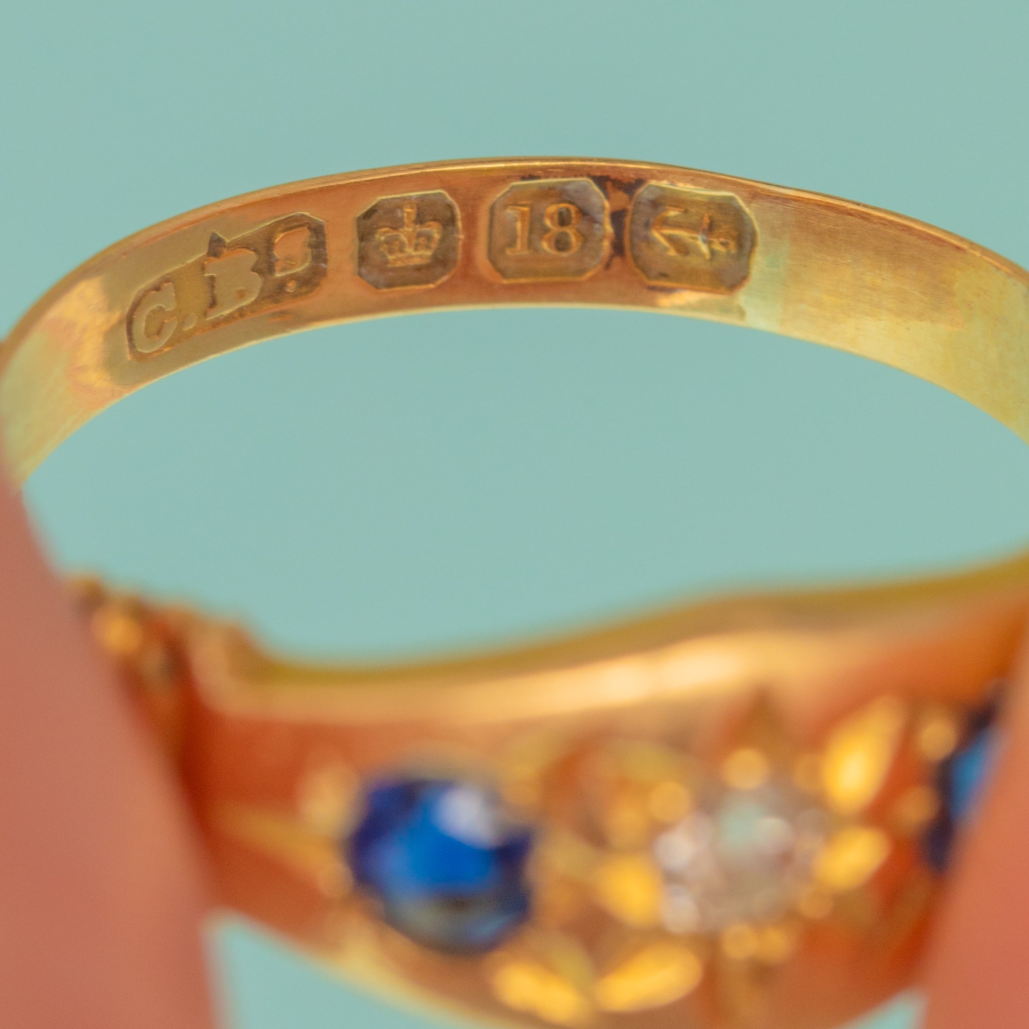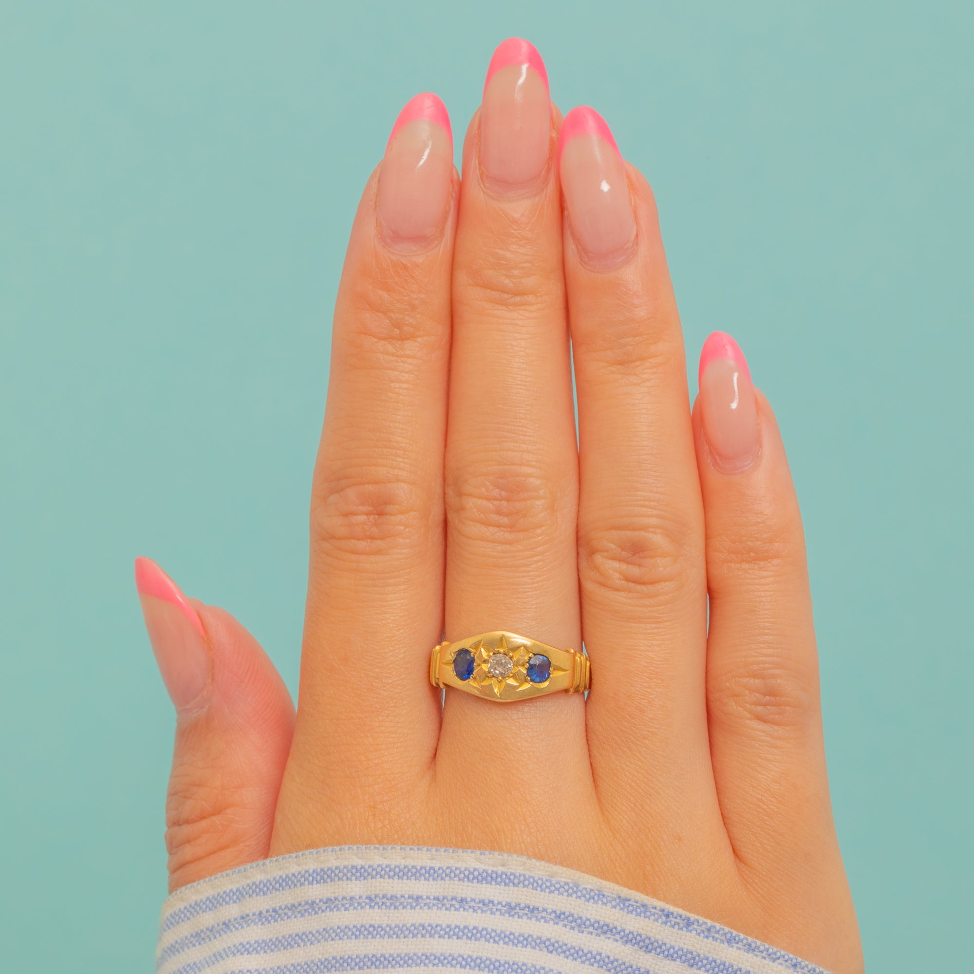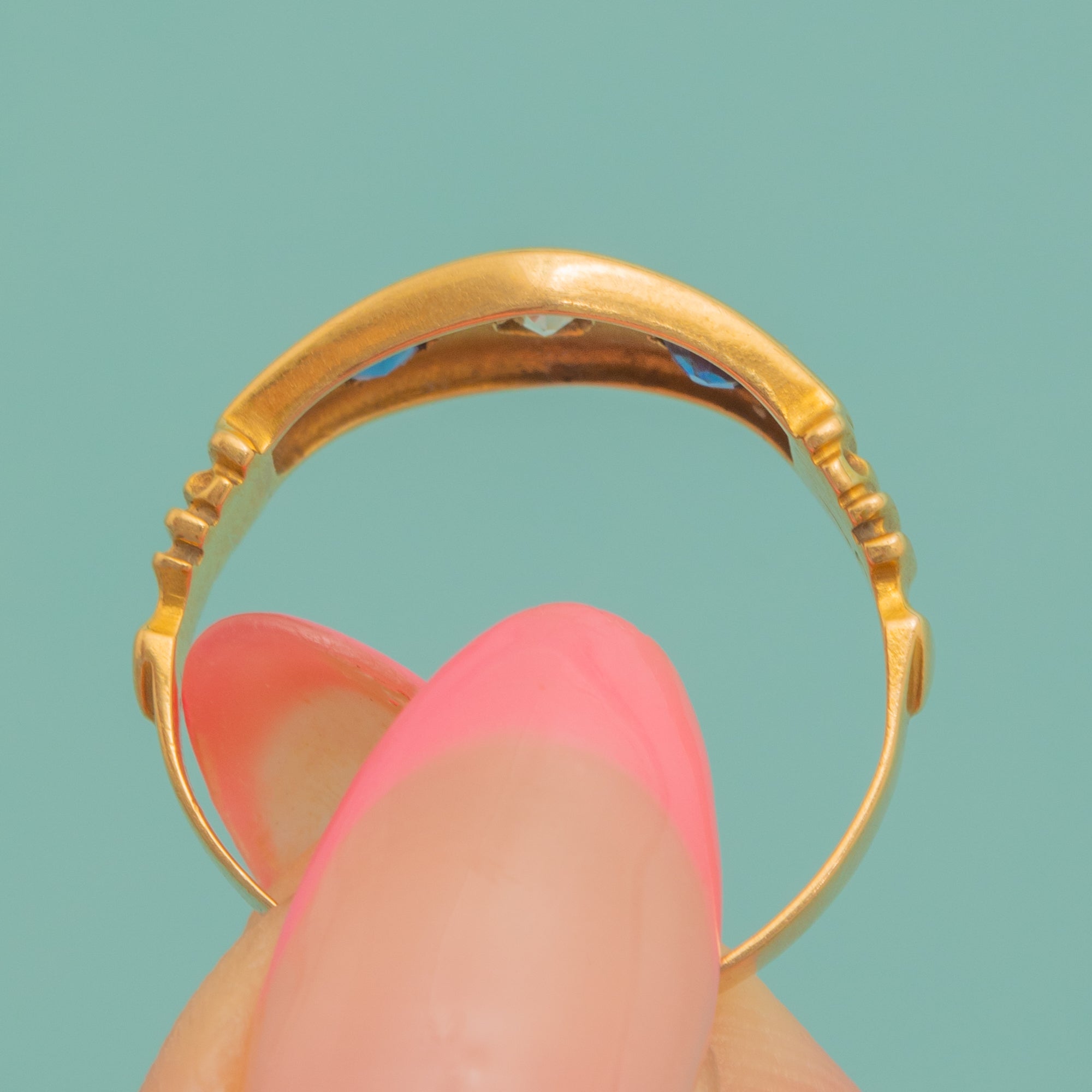 This antique 18ct Gold Sapphire Diamond gypsy ring is divine! Inlaid with two Aegean blue Sapphires and a scintillating Diamond, you'll certainly want this piece in your jewellery box.