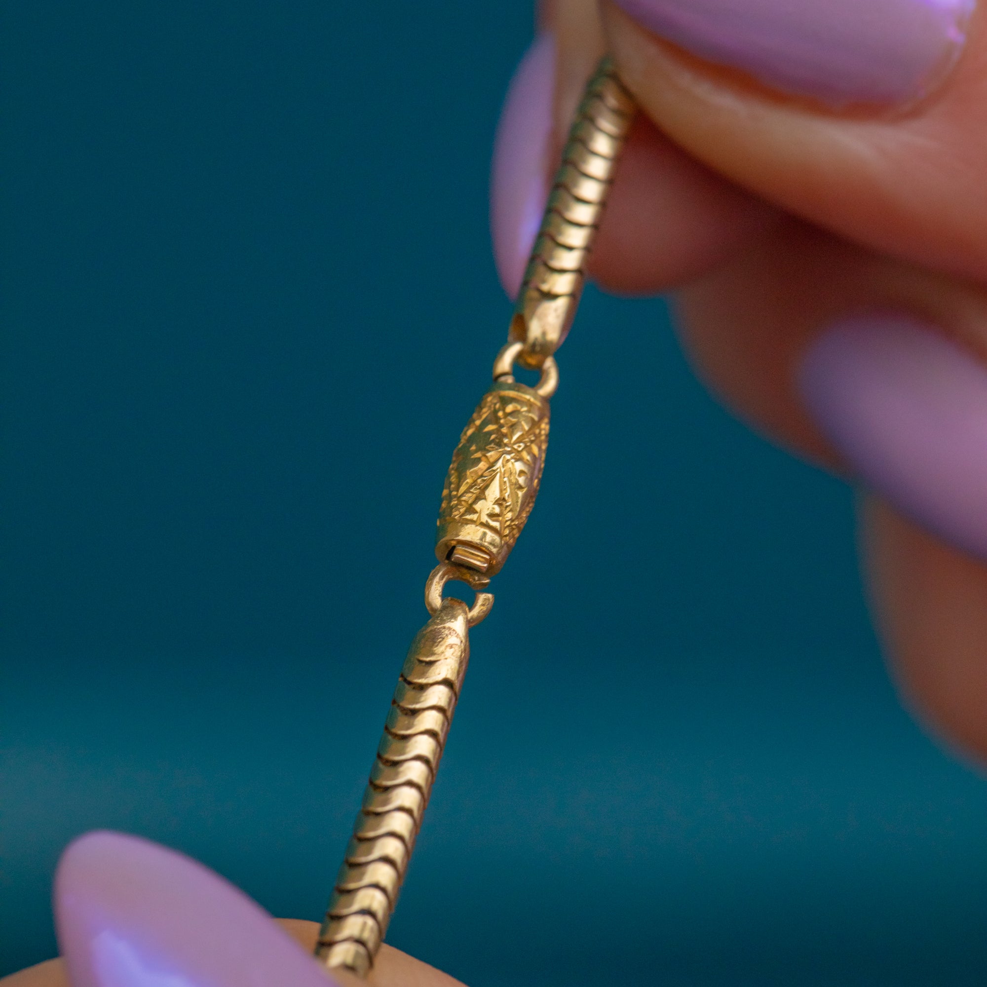 This antique 18ct Gold snake chain is the epitome of luxury and will make a fine addition to your collection! Each delicate 18ct Gold link intertwines gracefully, mimicking the sleek movement of a serpent, feeling chic and sensual against the skin.