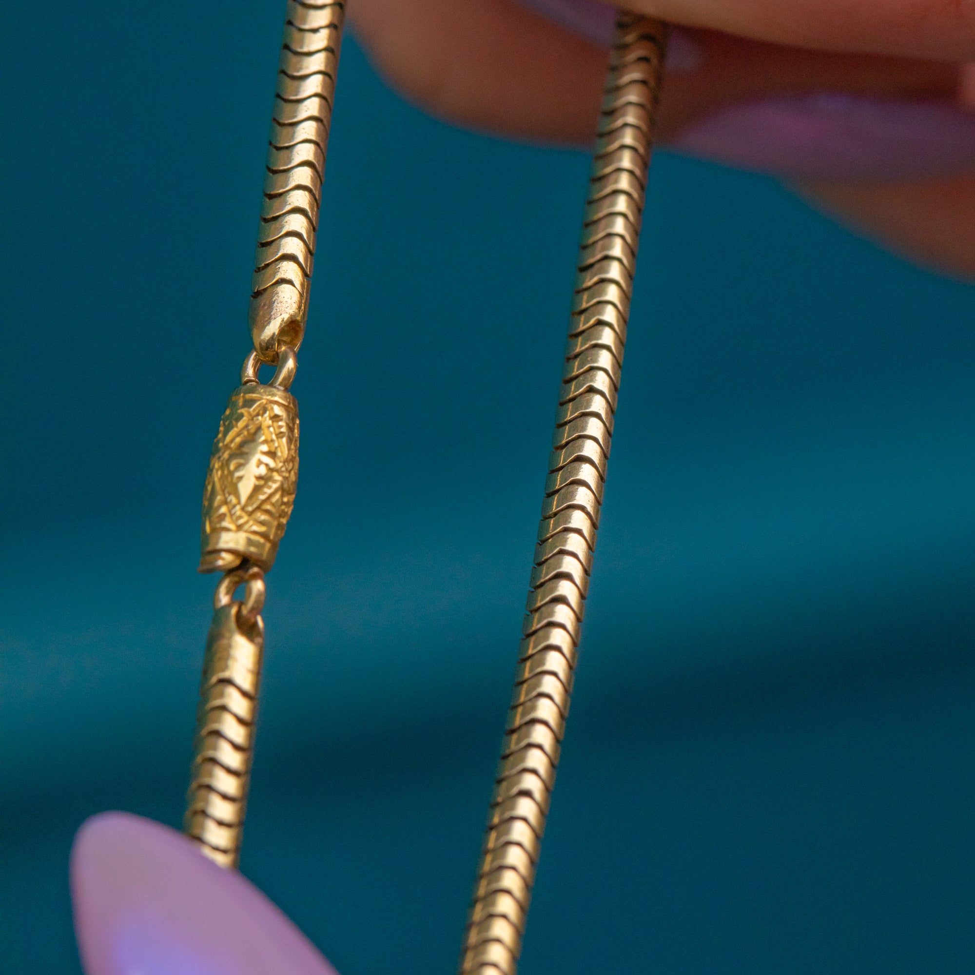 EXCELLENT. This antique 18ct Gold snake chain is in excellent condition. From its flawless surface to its seamless engraved barrel clasp, this Victoriuan chain is exquisite and will make a gorgeous choice for your collection!