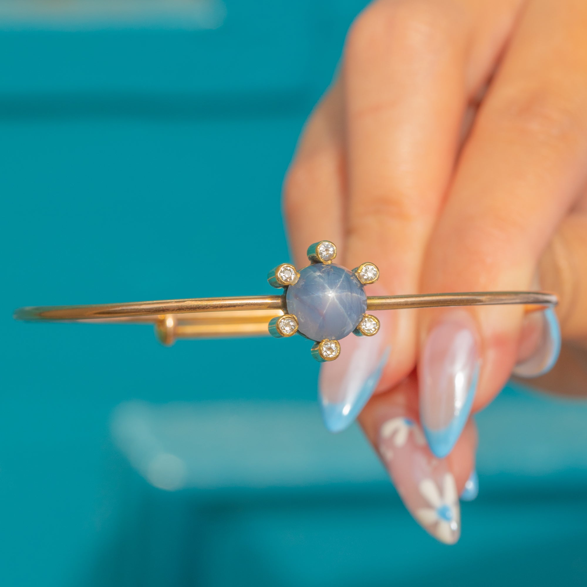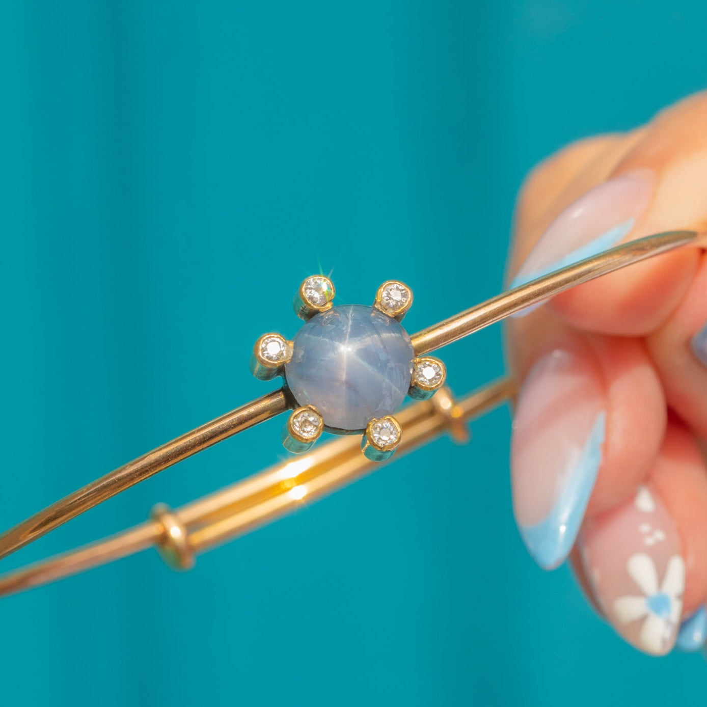This outstanding Victorian bangle is crafted from solid 18ct Gold and displays a natural Star Sapphire haloed by six glittering Diamonds. The high-domed 6.55ct Sapphire cabochon displays a bold asterism across its lilac-blue core, giving it that highly desirable star effect for which Star Sapphires are so revered.