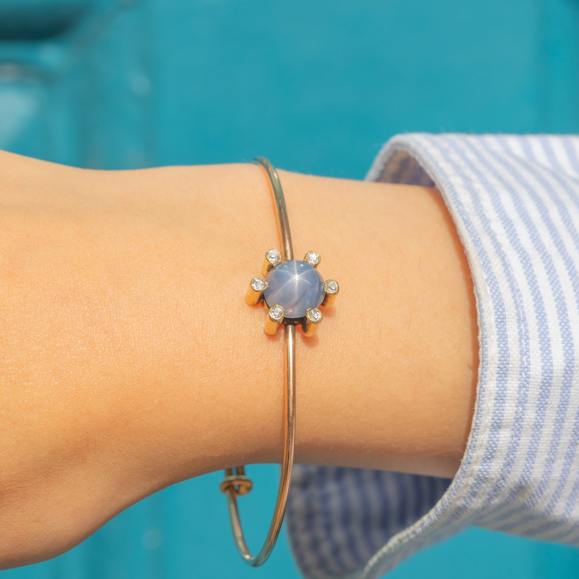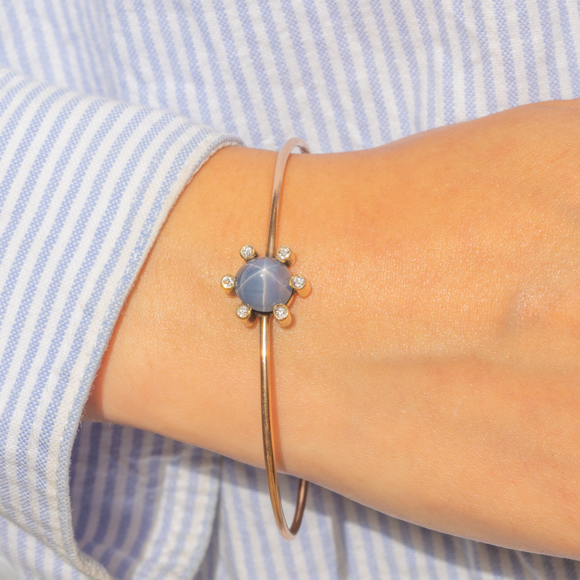 EXCELLENT: The Star Sapphire is smoothly domed and the Diamonds are bright, each one securely set and free from chips or abrasions. Despite slight play to the Sapphire, it is securely mounted and can be worn with utmost confidence. The 18ct Gold has a radiant saturation and the bangle is smooth, providing comfortable wear.