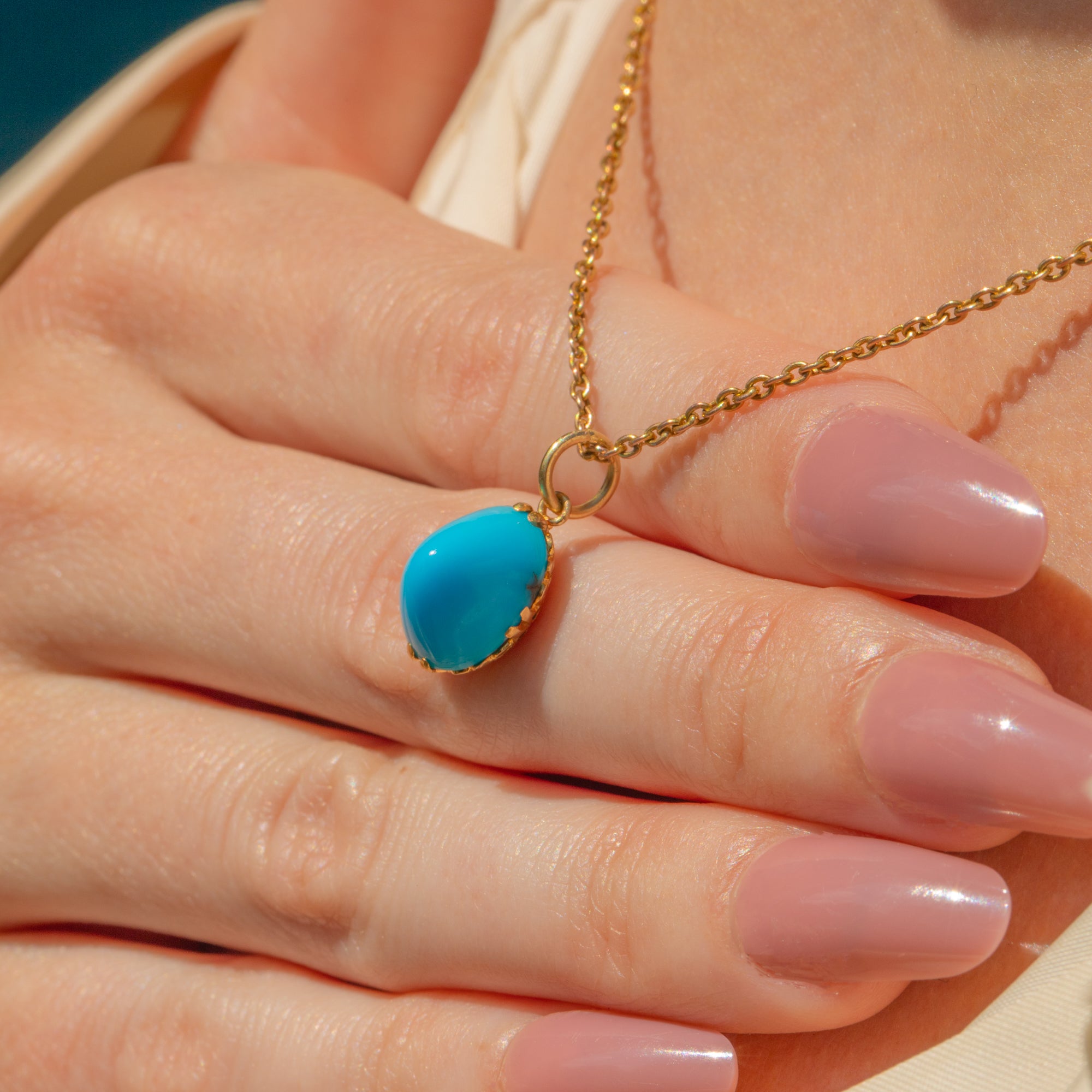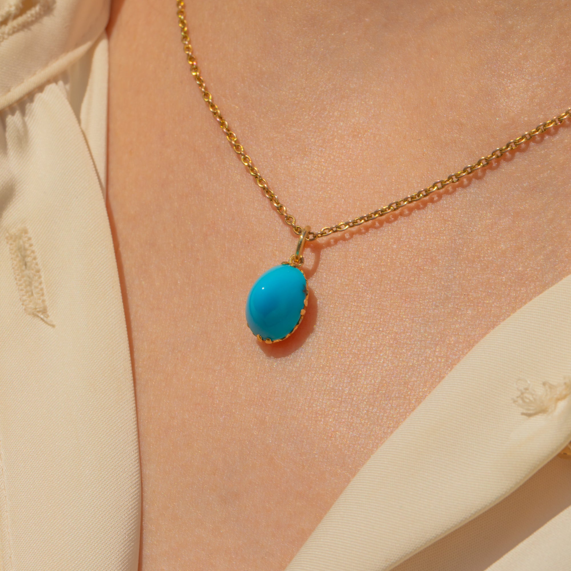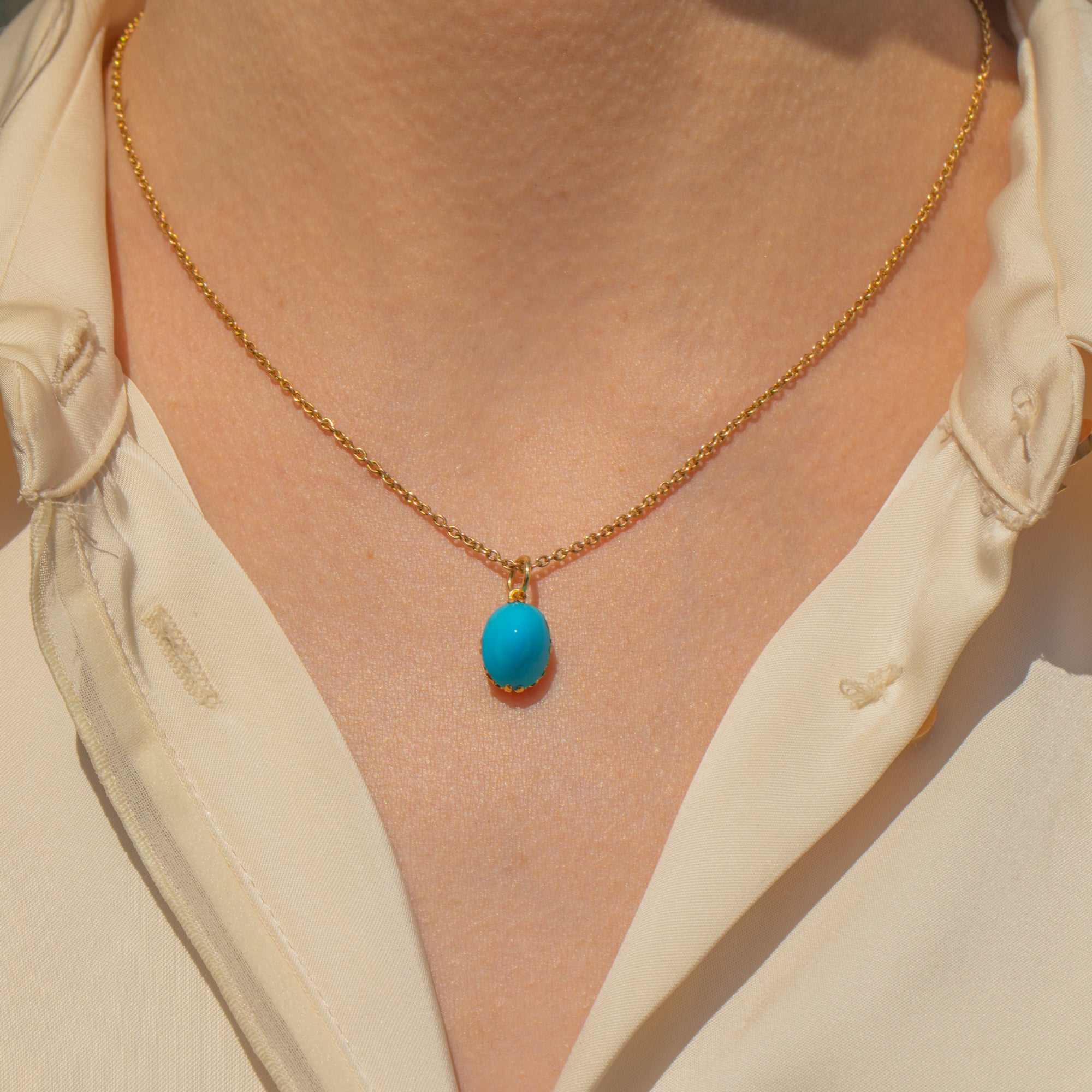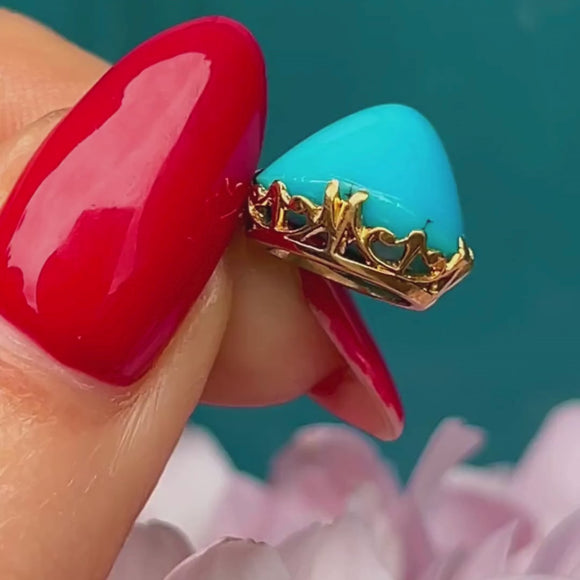 Add a glorious pop of colour to your décolletage with this phenomenal antique 18ct Gold Turquoise sugarloaf charm! The high-domed Turquoise boasts an exceptionally bright sky-blue hue that will instantly grab the attention of any onlooker, perfectly complimented by the sumptuous 18ct Gold.