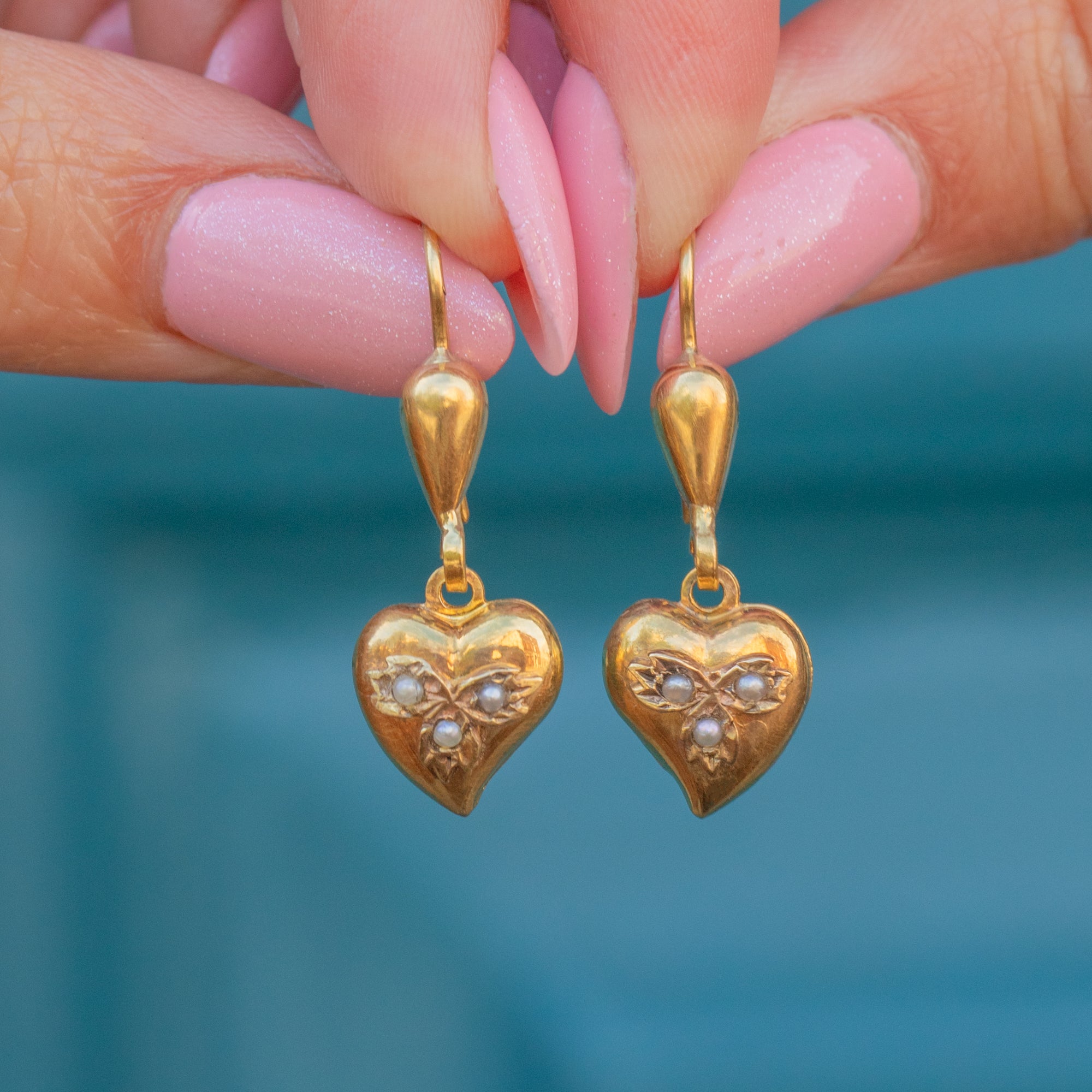 EXCELLENT: These antique 18ct Gold witches heart Pearl drop earrings are in excellent condition, showing only the lightest signs of wear consistent with their age. The Gold still gleams beautifully, and the Pearls remain secure with a gentle lustre. They are delightful!