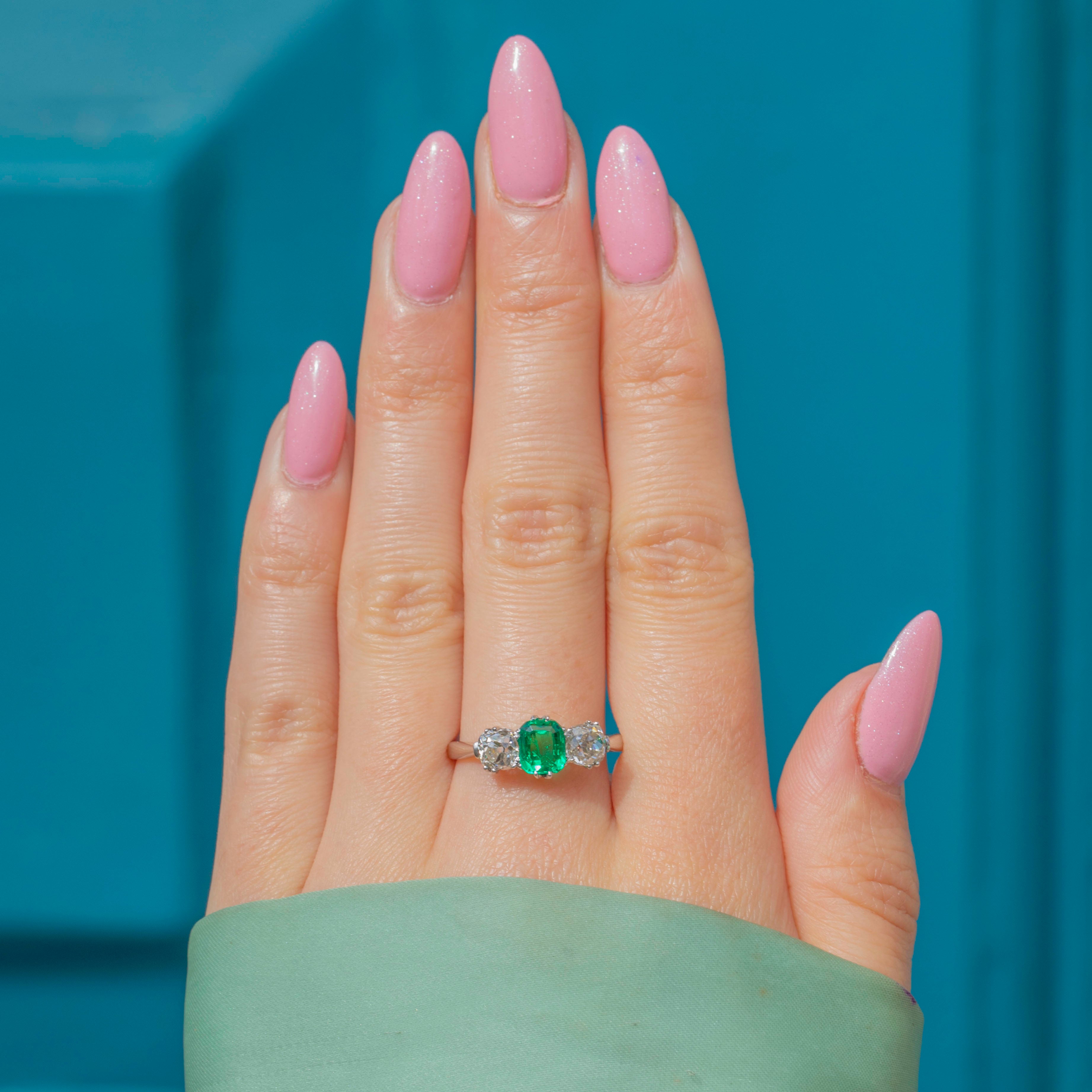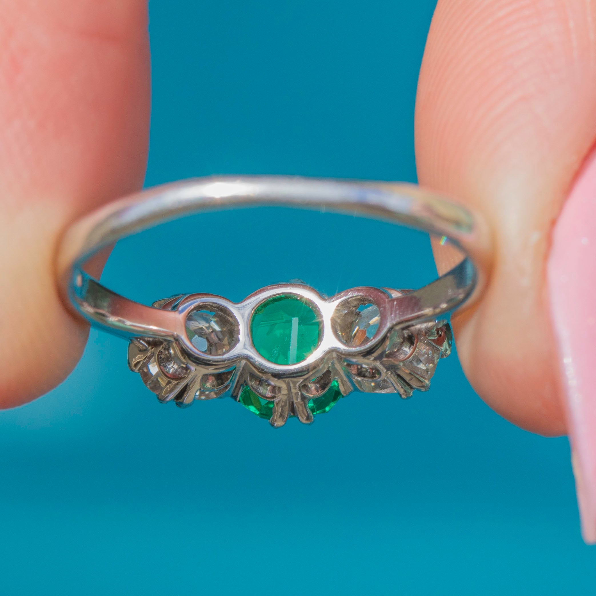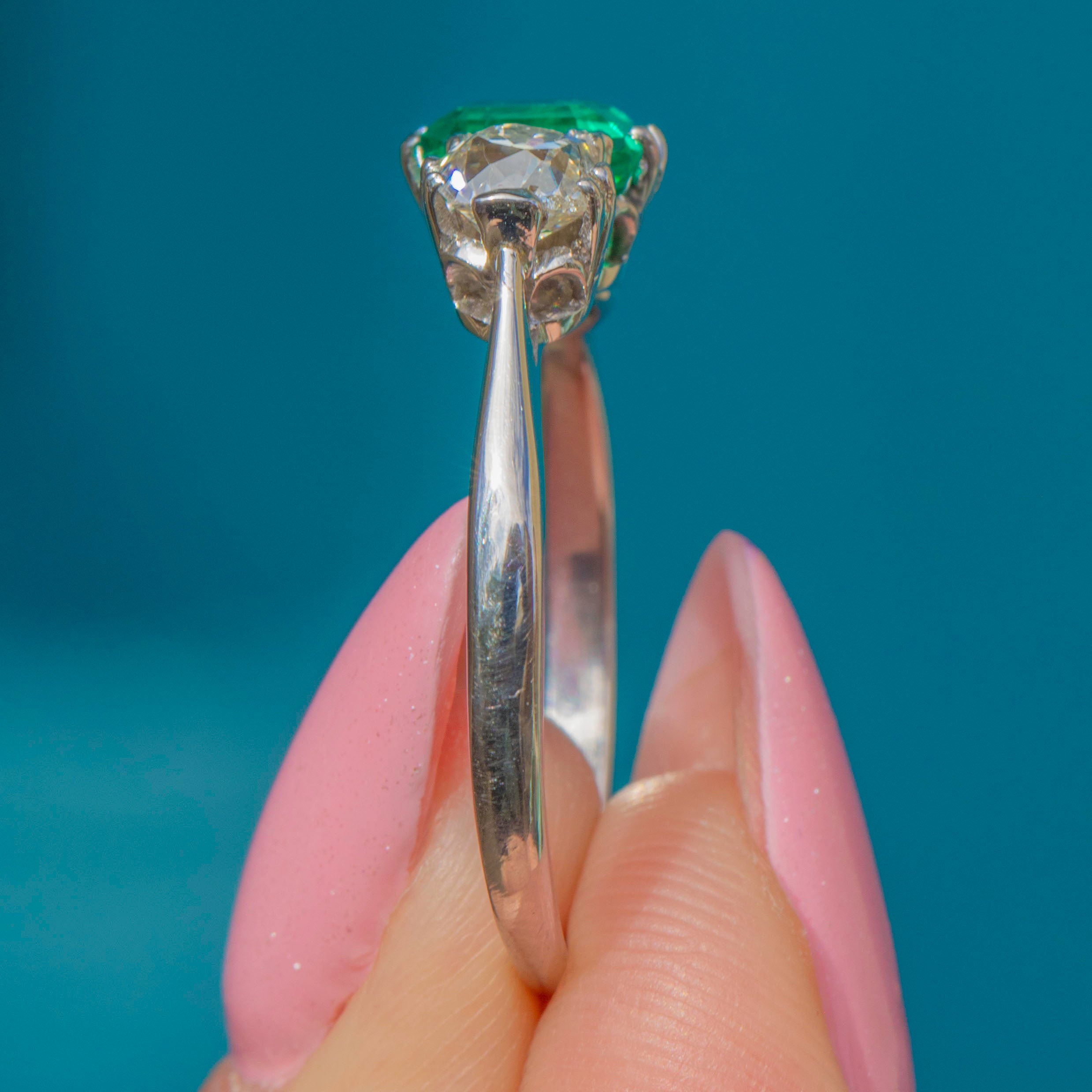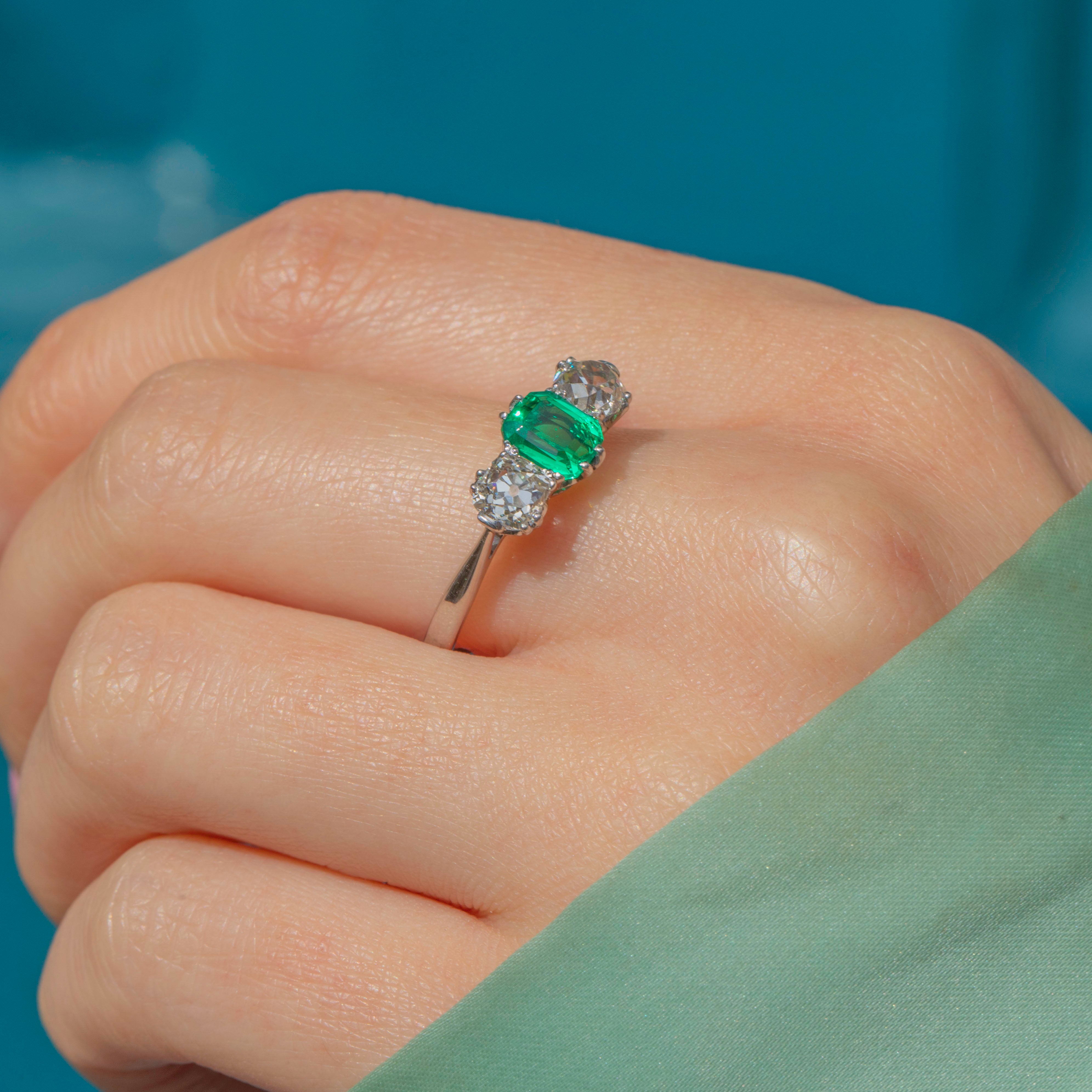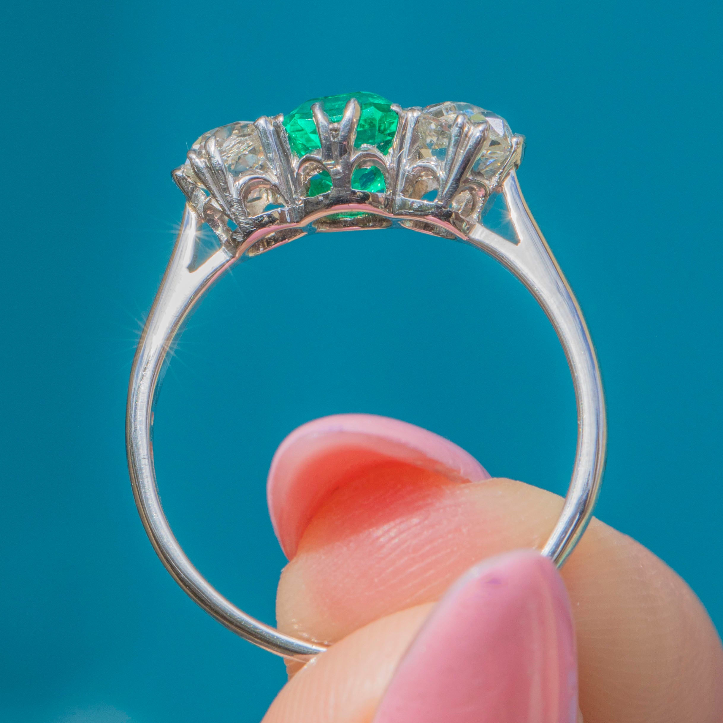 Antique 18ct White Gold Emerald Diamond Trilogy Ring, 0.80ct Old Mine Cut Diamonds