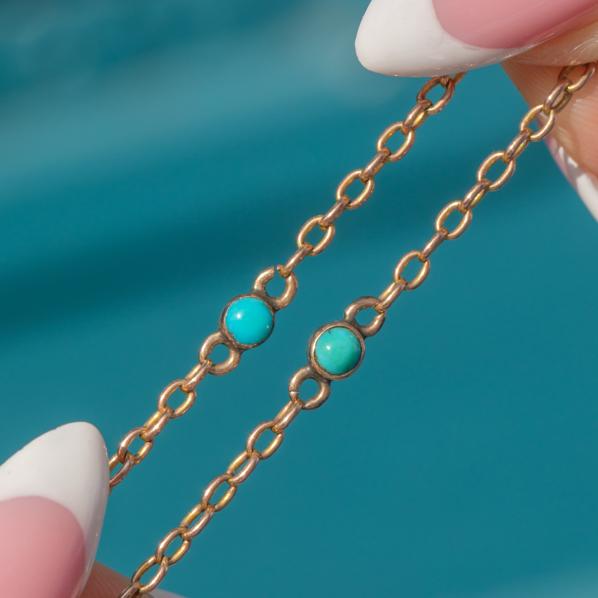 Crafted from rosy hued 9ct Gold, this antique chain necklace is dotted with alternating Turquoise and Pearls which provide a lovely pop of colour and iridescence.