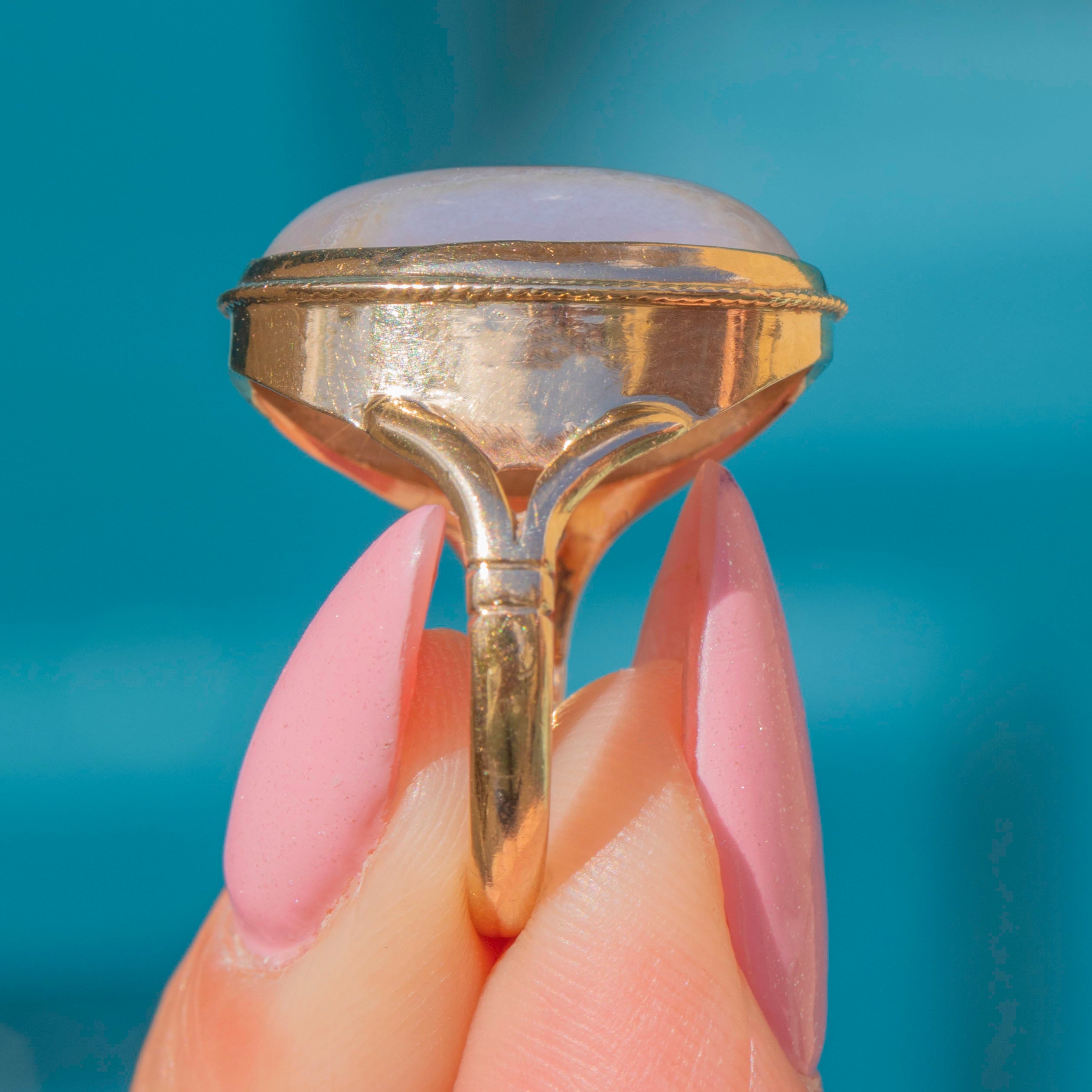 In her centre sits a large pastel blue-lilac Agate stone, adorned by creamy banding, akin to the surface of Neptune. She is encircled by a glossy 9ct Gold bezel, with subtle rope detailing for a textured, elegant finish.