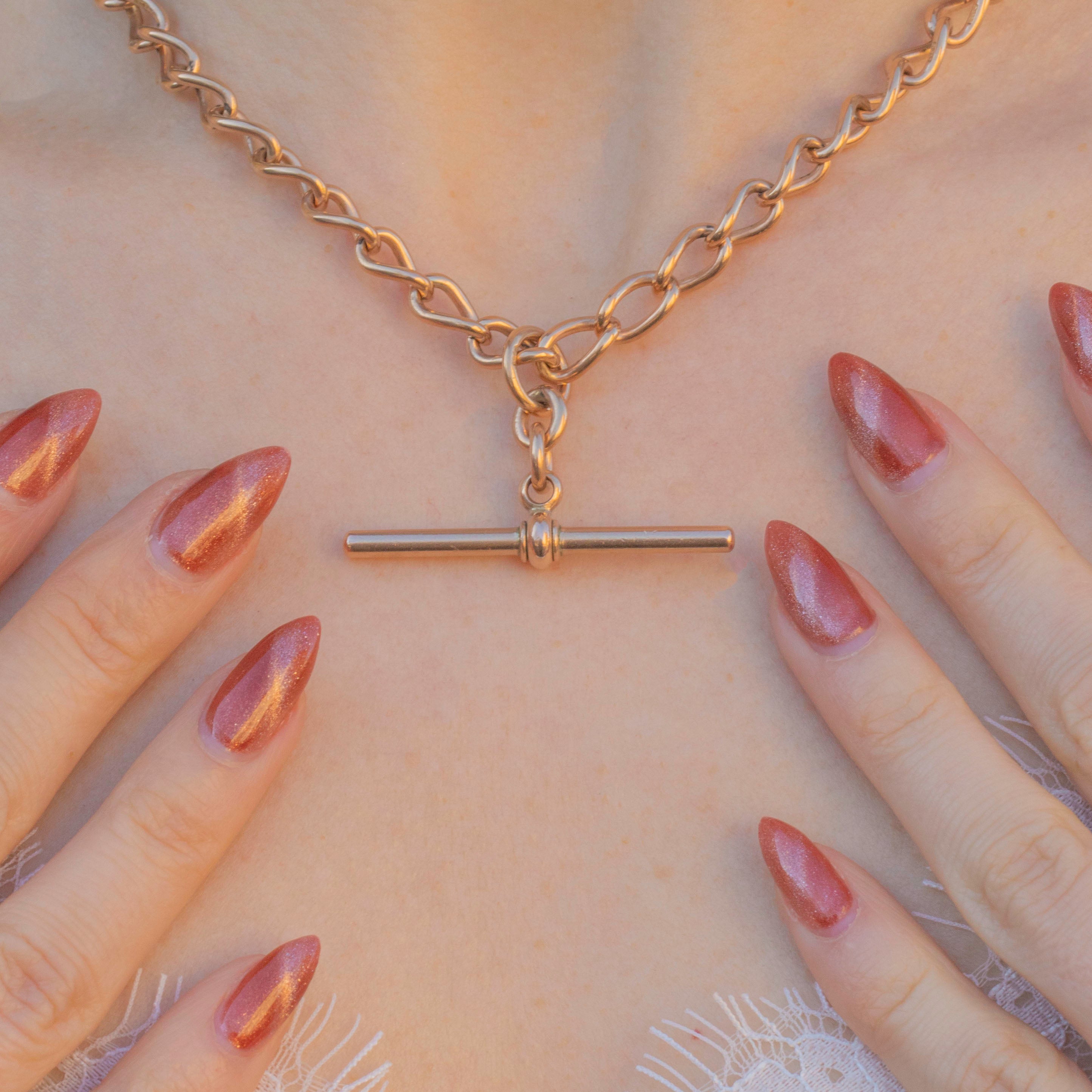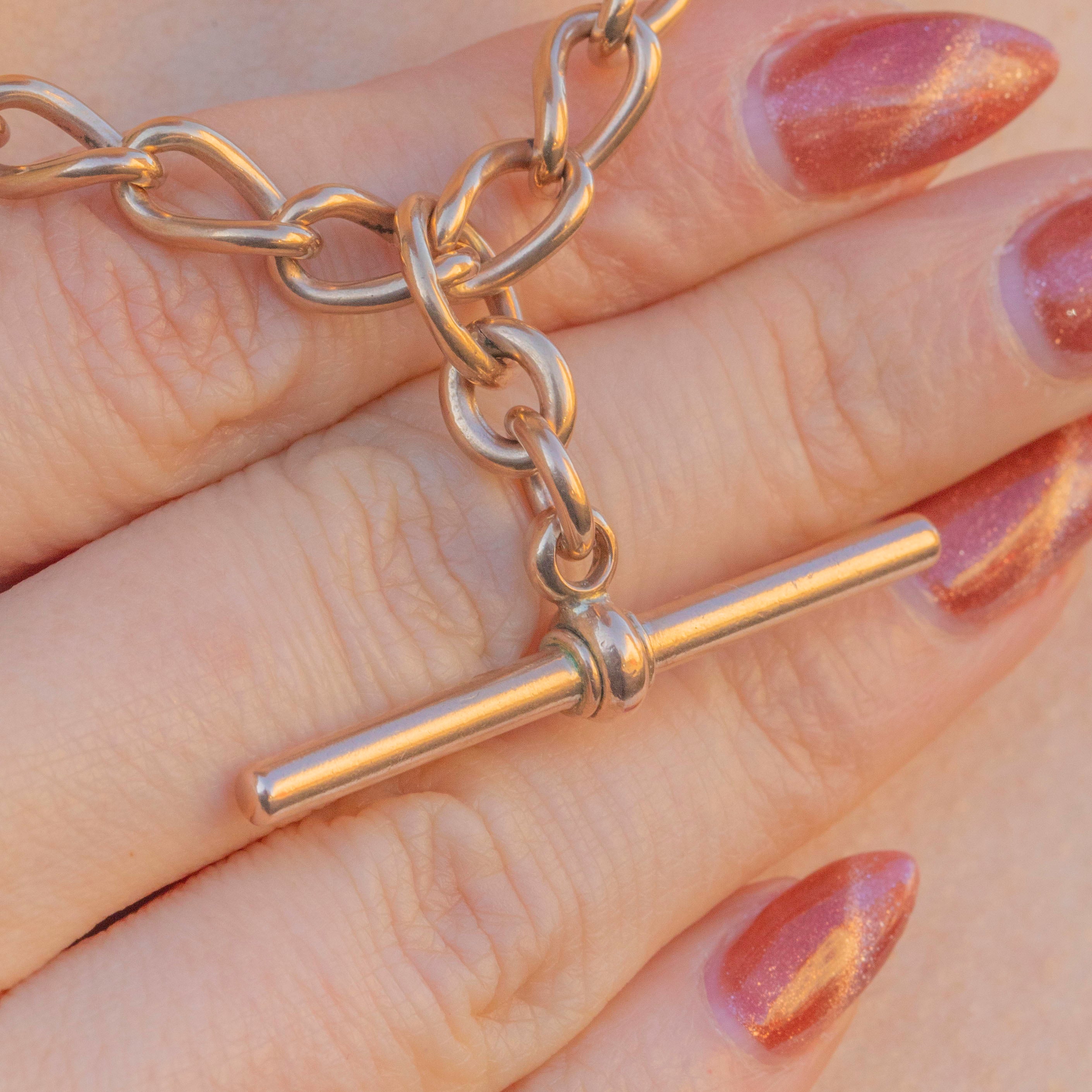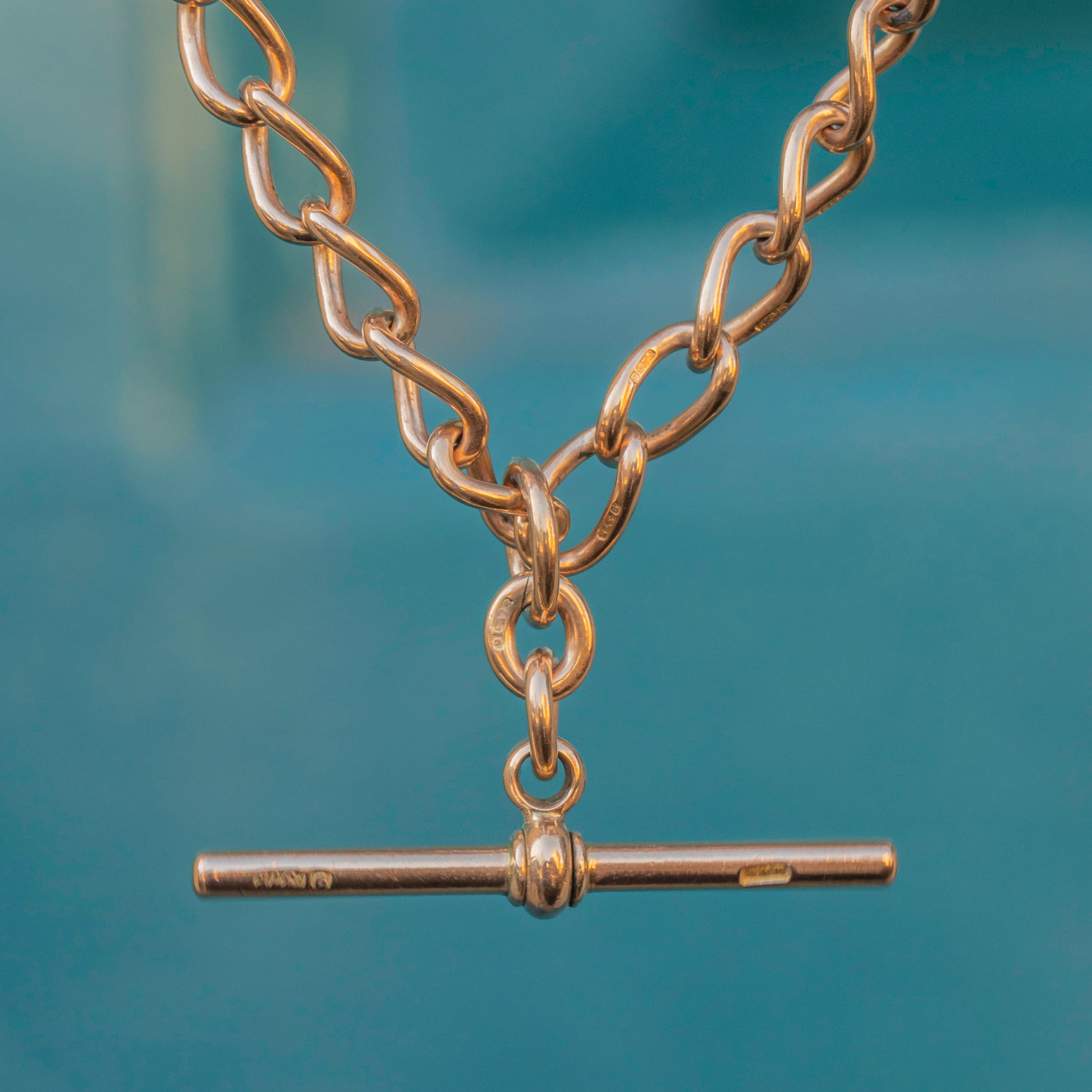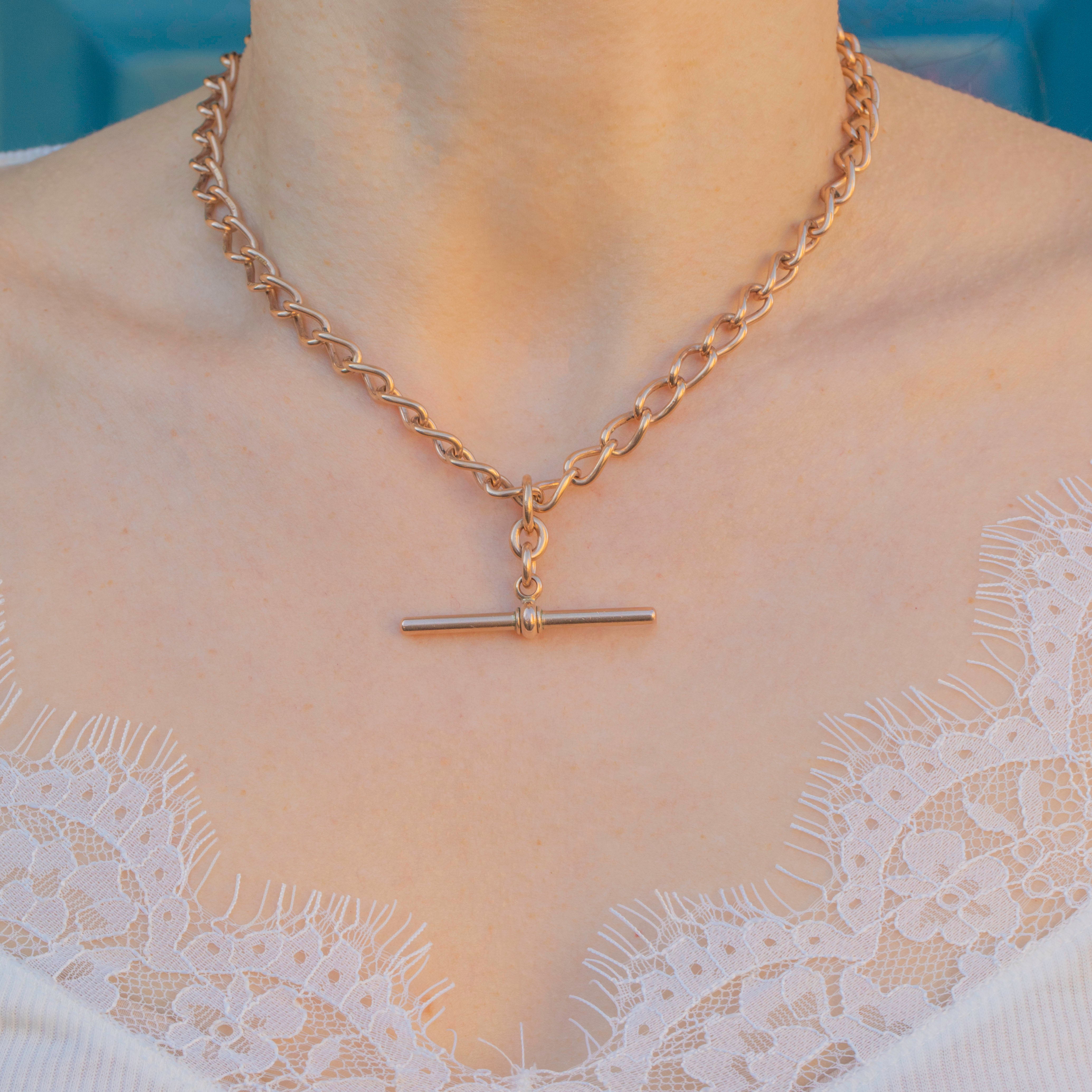 Every softly twisted curb link has a sumptuous glow, and this Victorian chain is complete with a highly desirable T-bar. Each link has an antique stamp, and the sliding jump ring has a full set of English hallmarks dating this piece to 1904, making it a true investment piece!