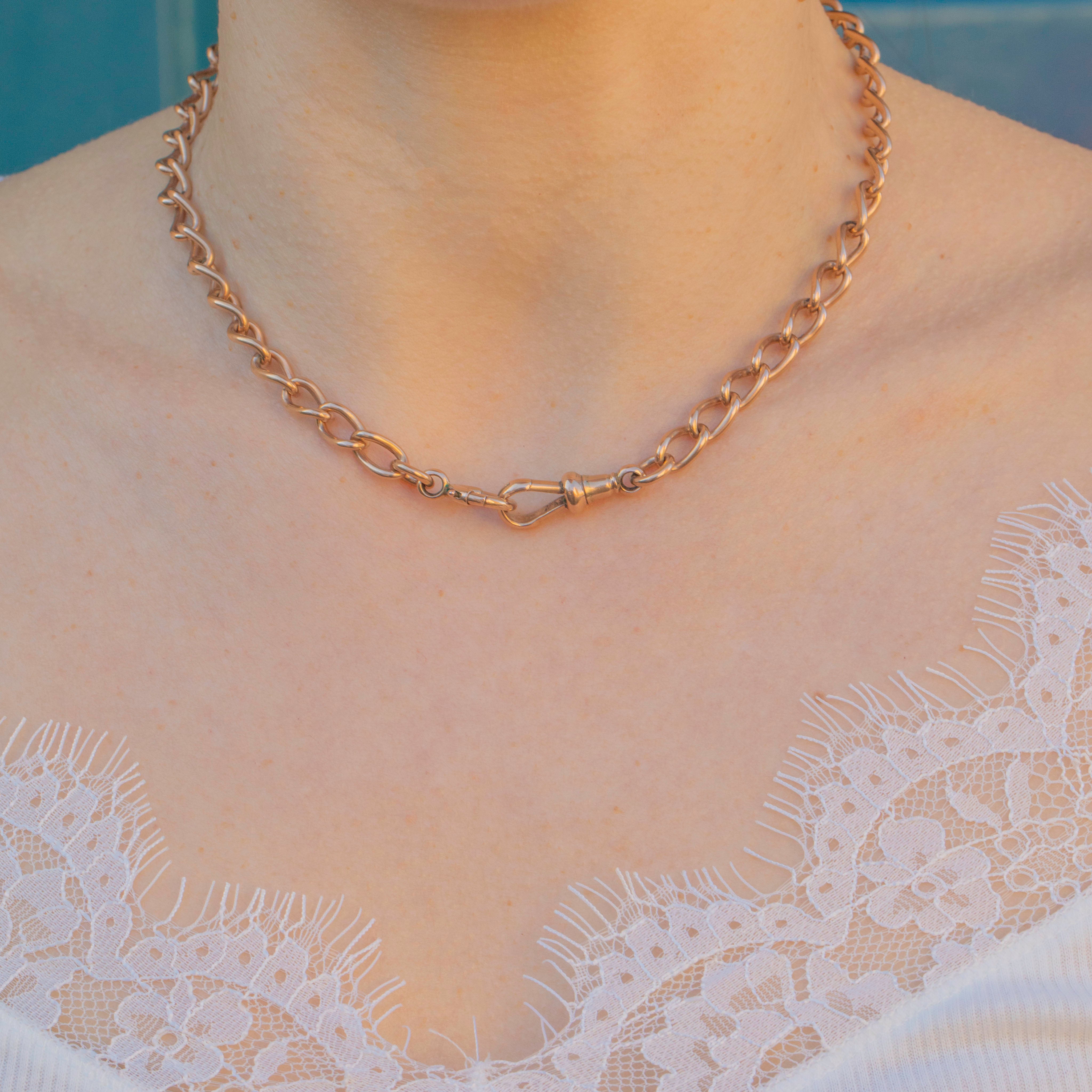 This is a remarkable antique 9ct Gold Albert chain! The necklace is complete with an oversized bolt ring and dog-clip for a classy antique feel.