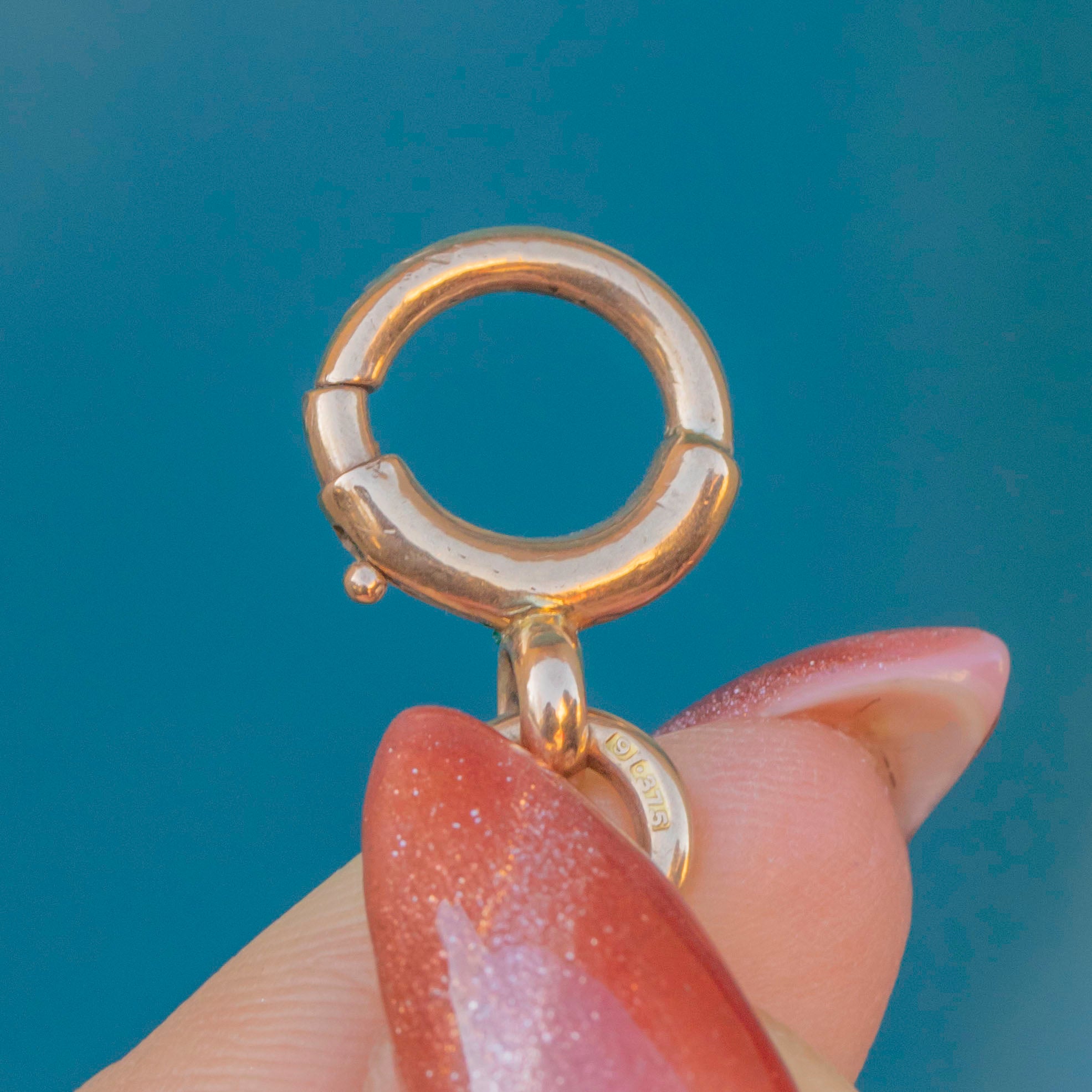 STAMPS: 9, .375 on every link, Birmingham Anchor, Date letter 'e' on sliding jump ring for 1904. M&M Makers mark, 9, .375 on dog-clip