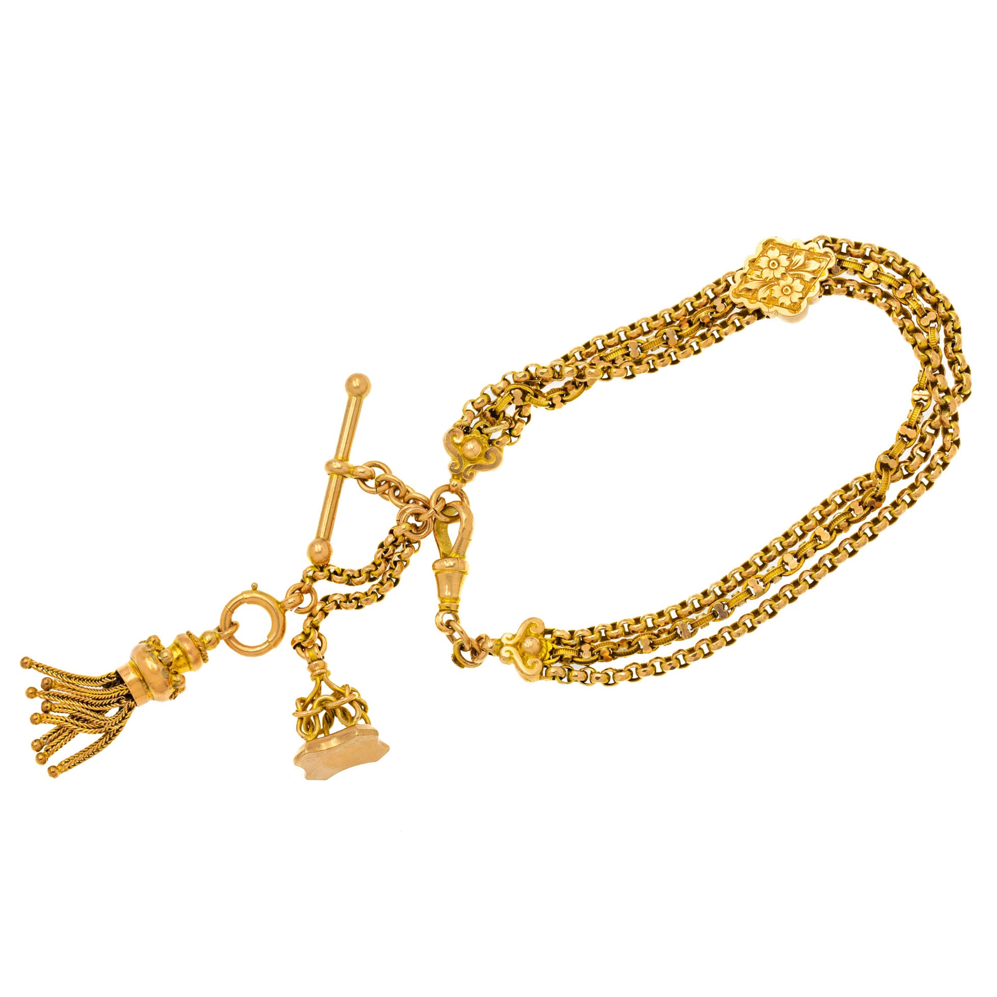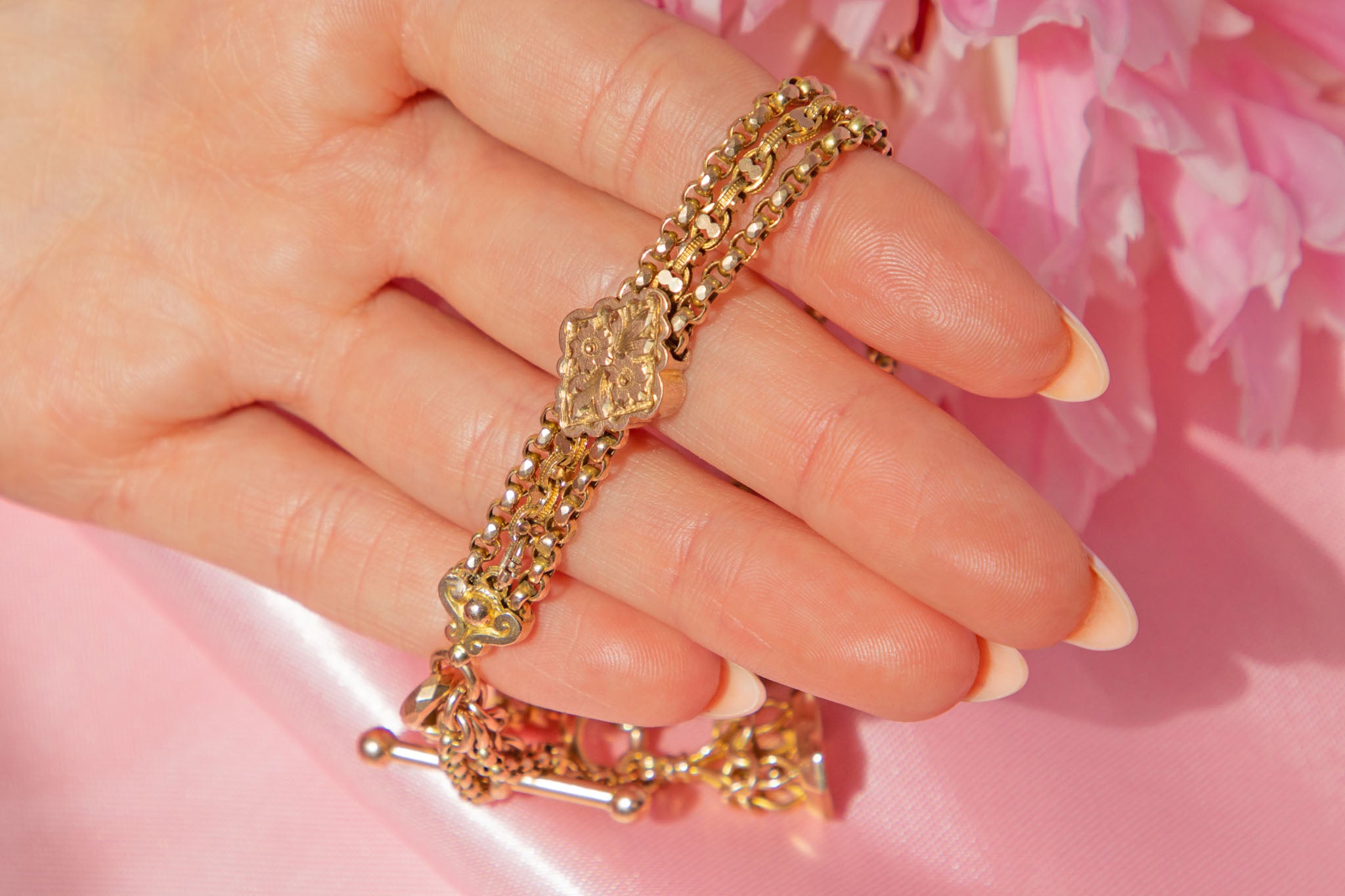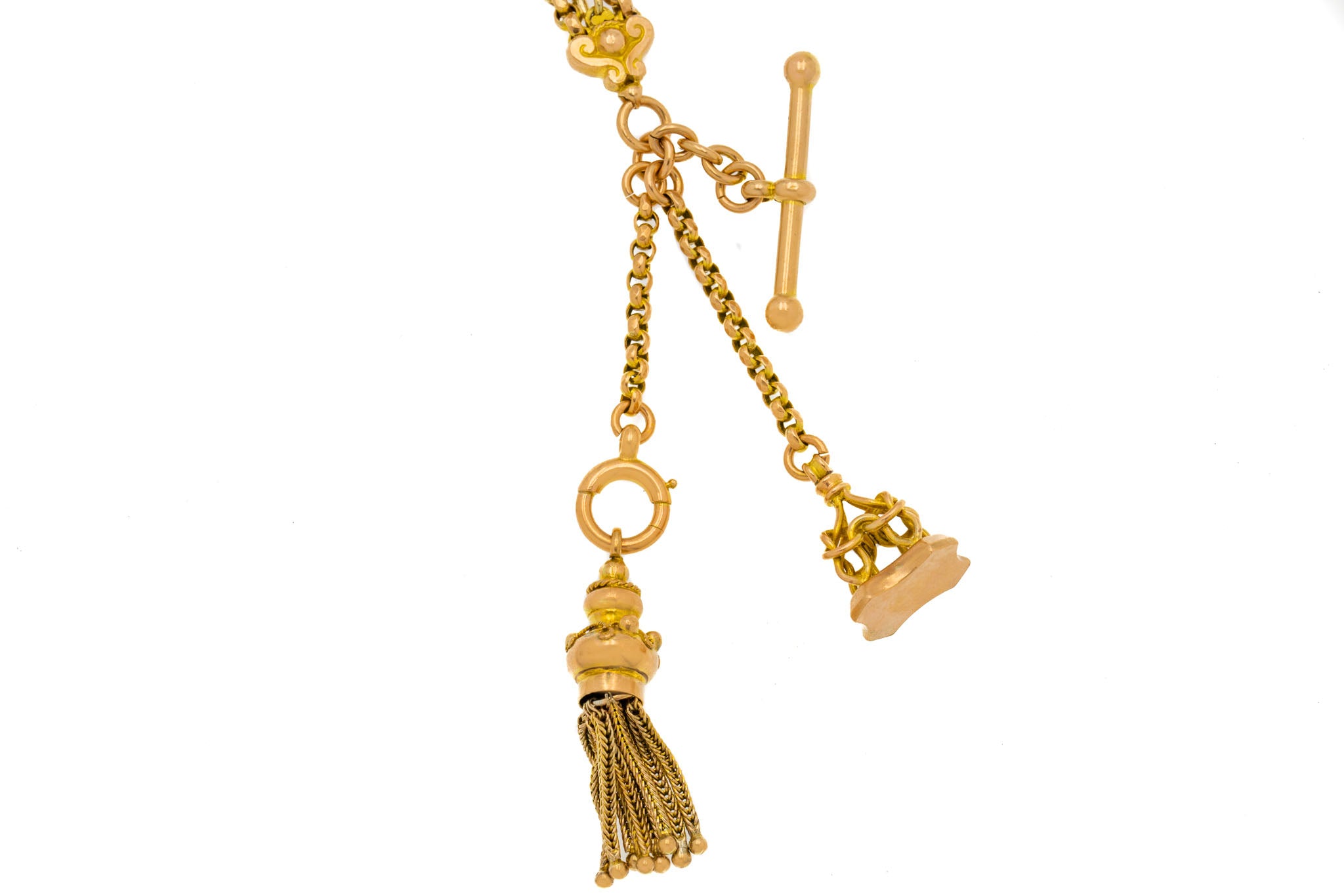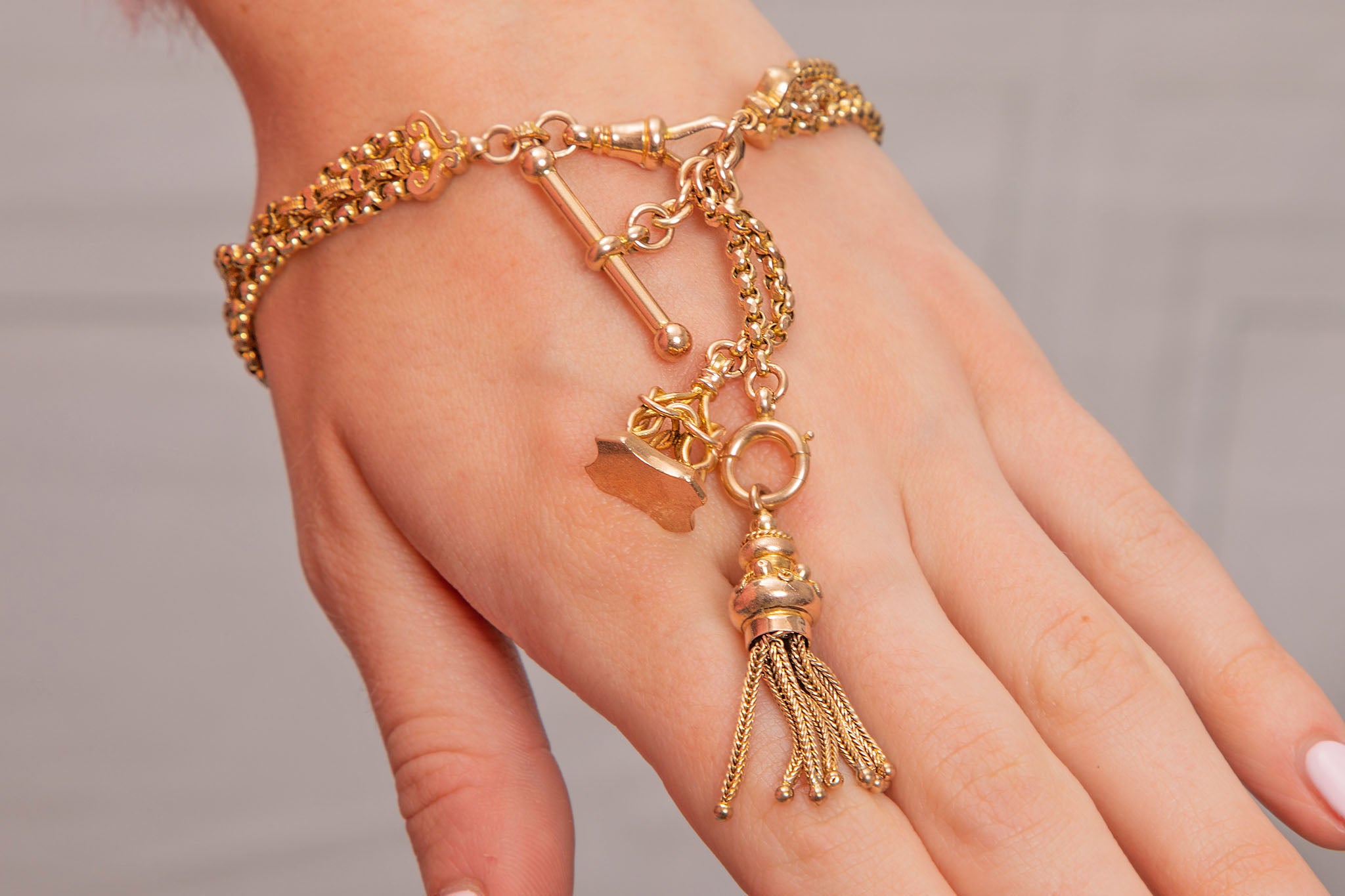アンティーク 9ct ゴールド アルベルティーナ スライダー チャーム ブレスレット、取り外し可能なタッセル&ミニ フォブ、21.7g