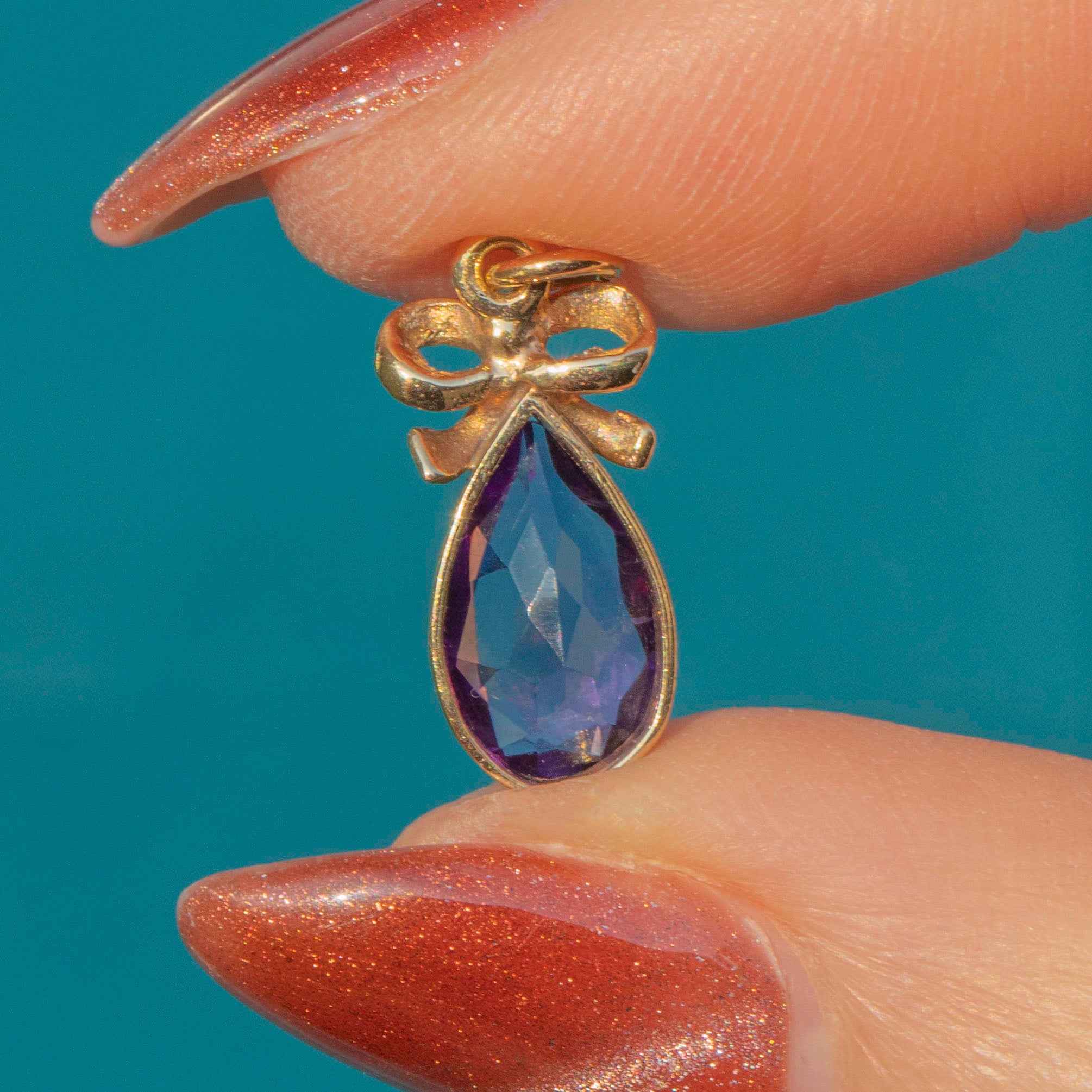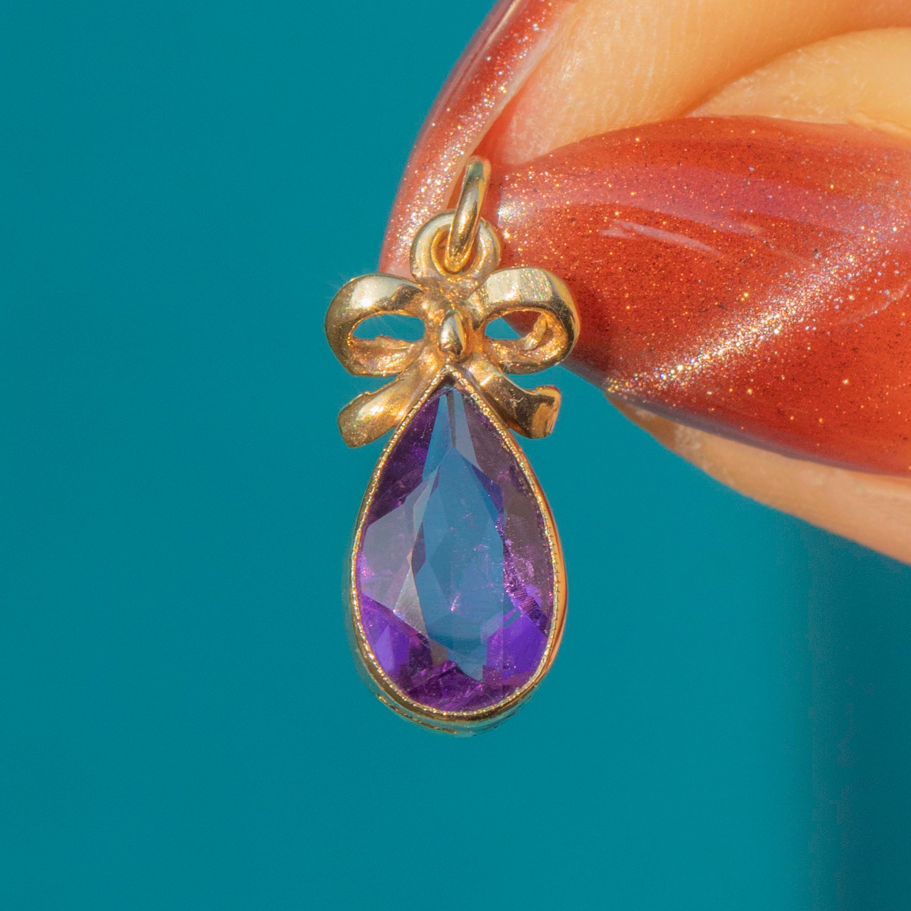 This antique 9ct Gold Amethyst charm will make a sweet addition to your collection! A radiant 0.95ct pear-cut Amethyst sits in her centre, flaunting deep violet hues as she catches the light.
