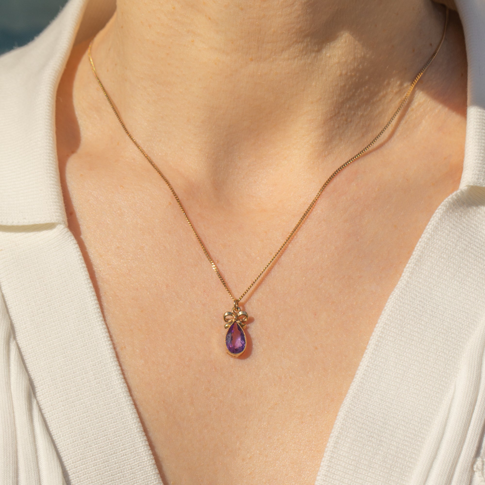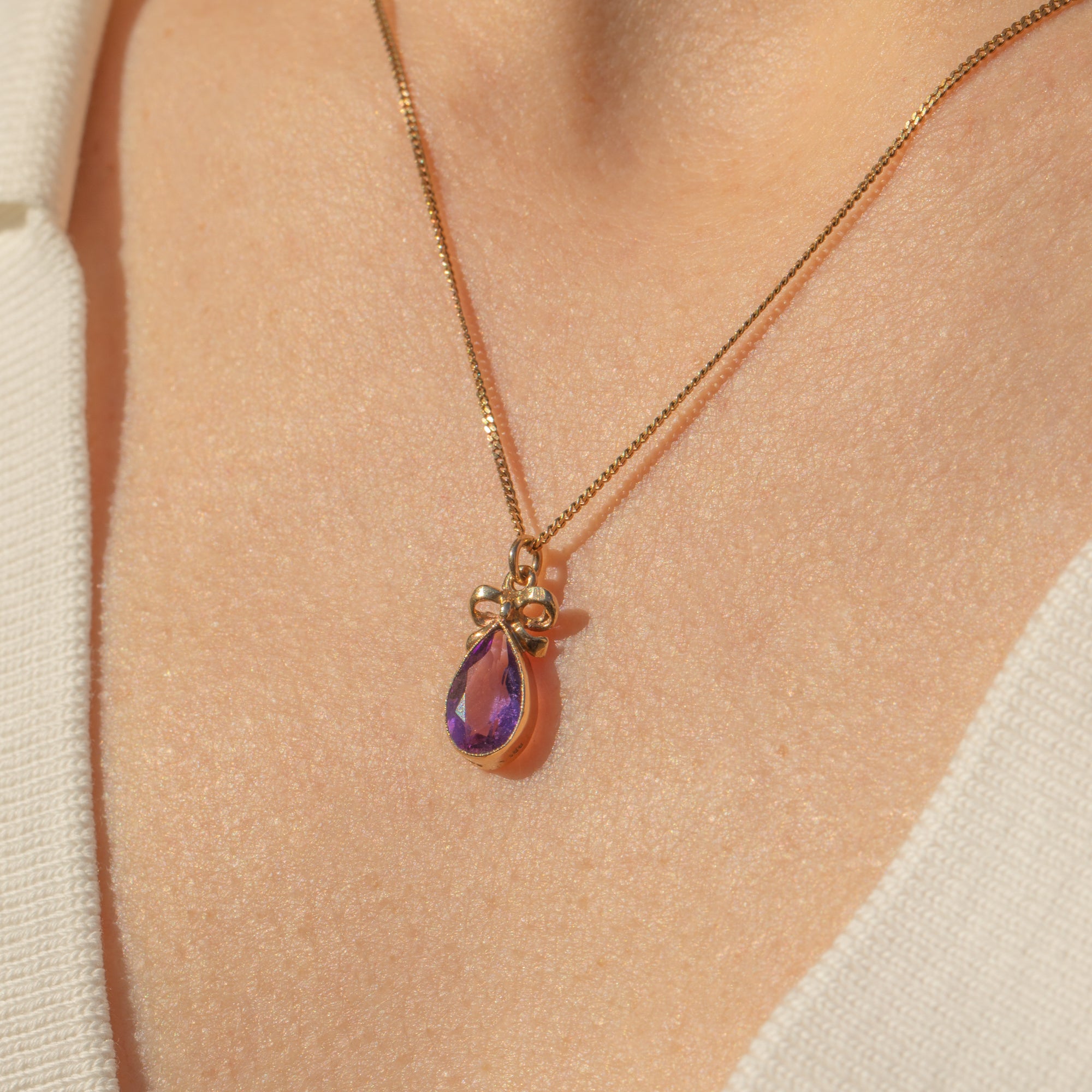 Complete with an adorable 9ct Gold ribbon top and a buttery bezel embracing the circumference of her Amethyst, this Victorian pendant oozes charm from all angles. The perfect dainty size, she will look pretty worn alone suspended from an antique Gold chain across your décolletage!