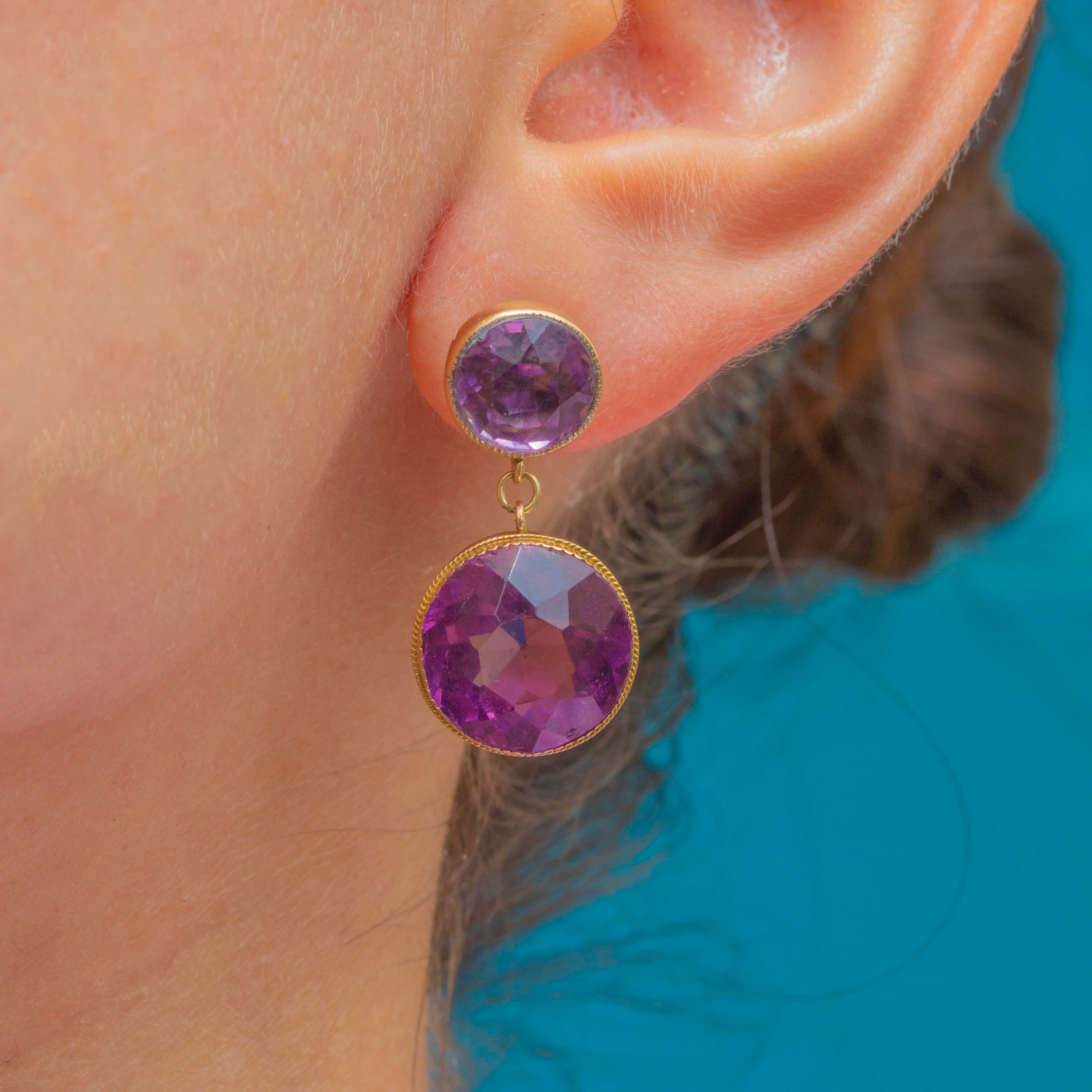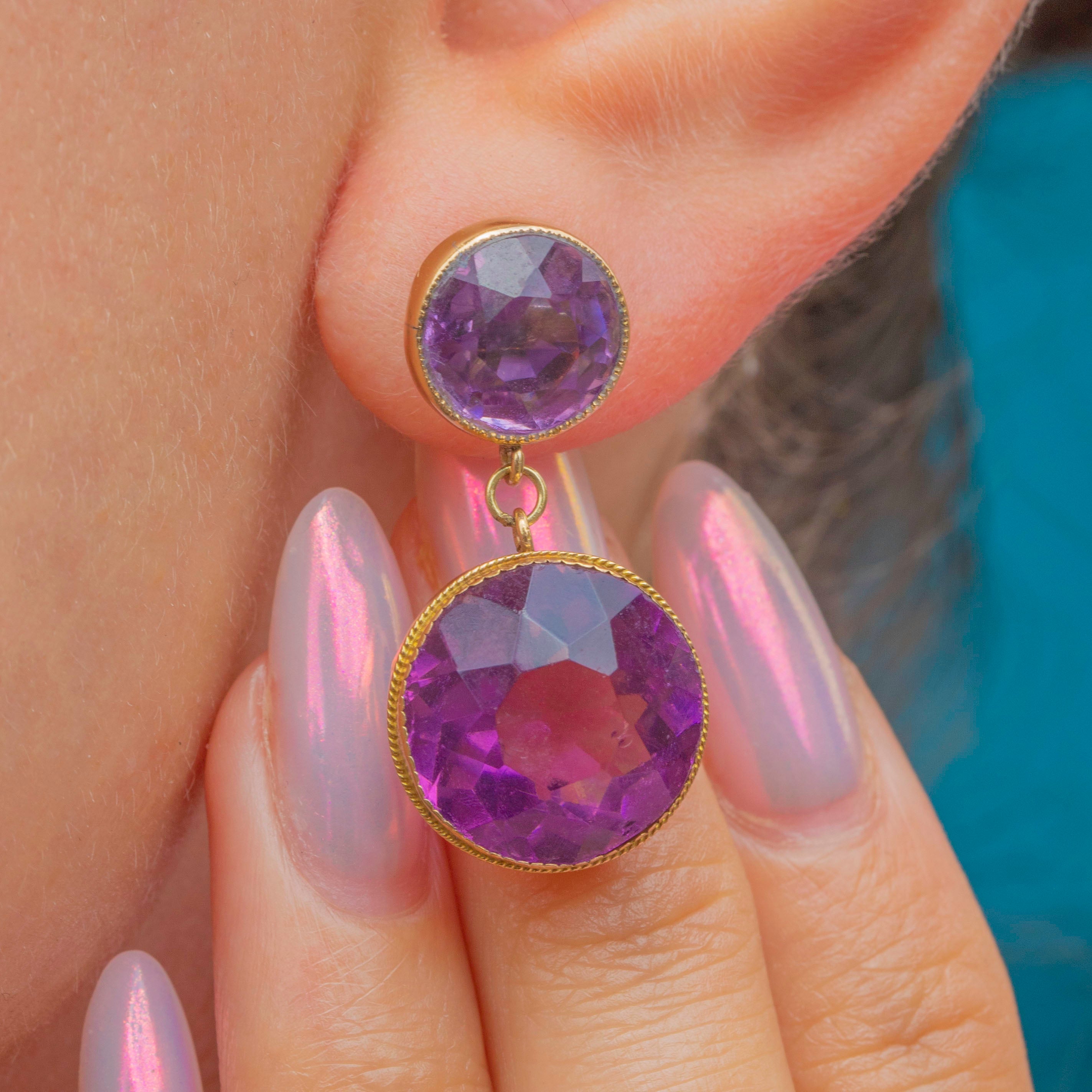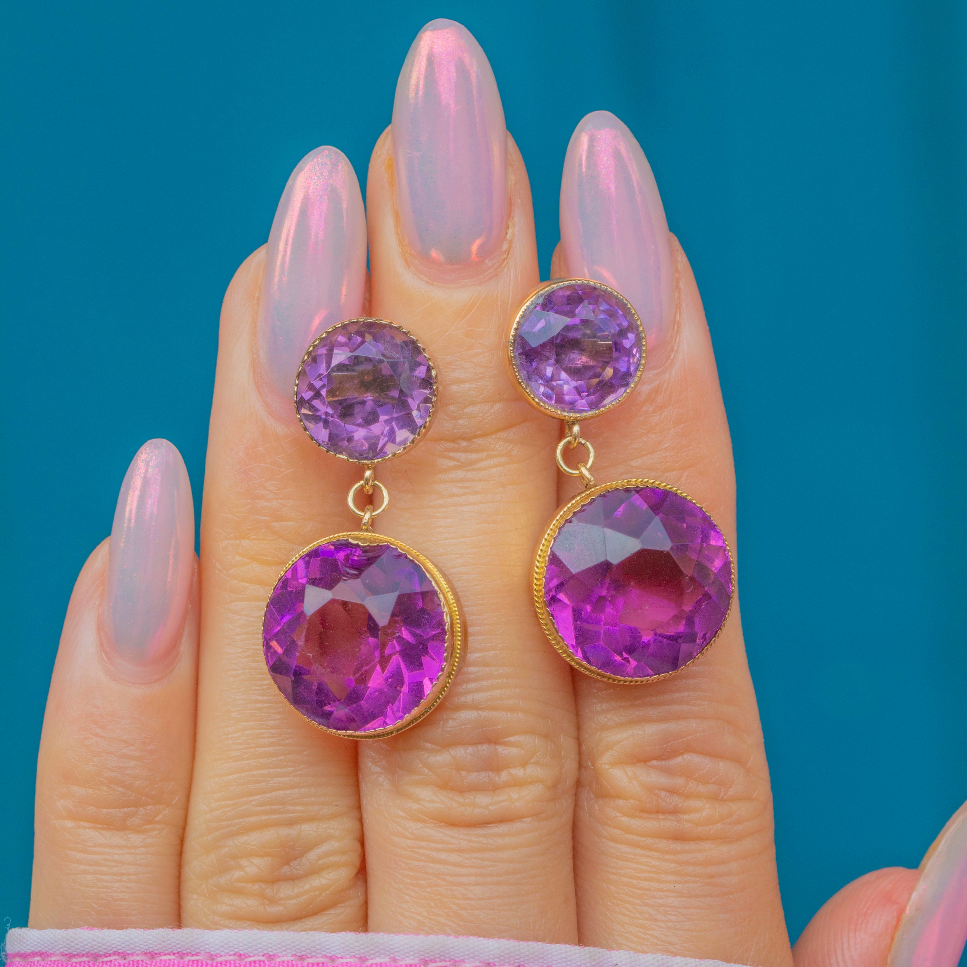 These impressive late Victorian earrings boast 19.62 carats of vibrant Amethyst displayed within rich 9ct Gold, and will add a punchy pop of colour to your lobes! Each earring boasts a double Amethyst drop, their bold round cuts shimmering effortlessly as their facets dance in the light.