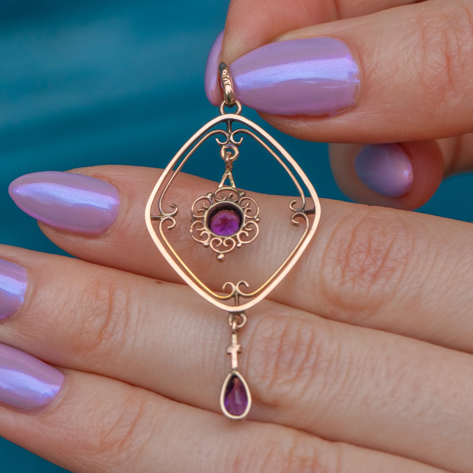 VERY GOOD-EXCELLENT. This antique 9ct Gold Amethyst drop pendant is in wonderful condition. The Amethysts have a wonderful radiance and are securely set. There are some minor signs of wear to the Gold commensurate with age, however this is difficult to spot when wearing. With a robust bale, you can wear her with confidence!