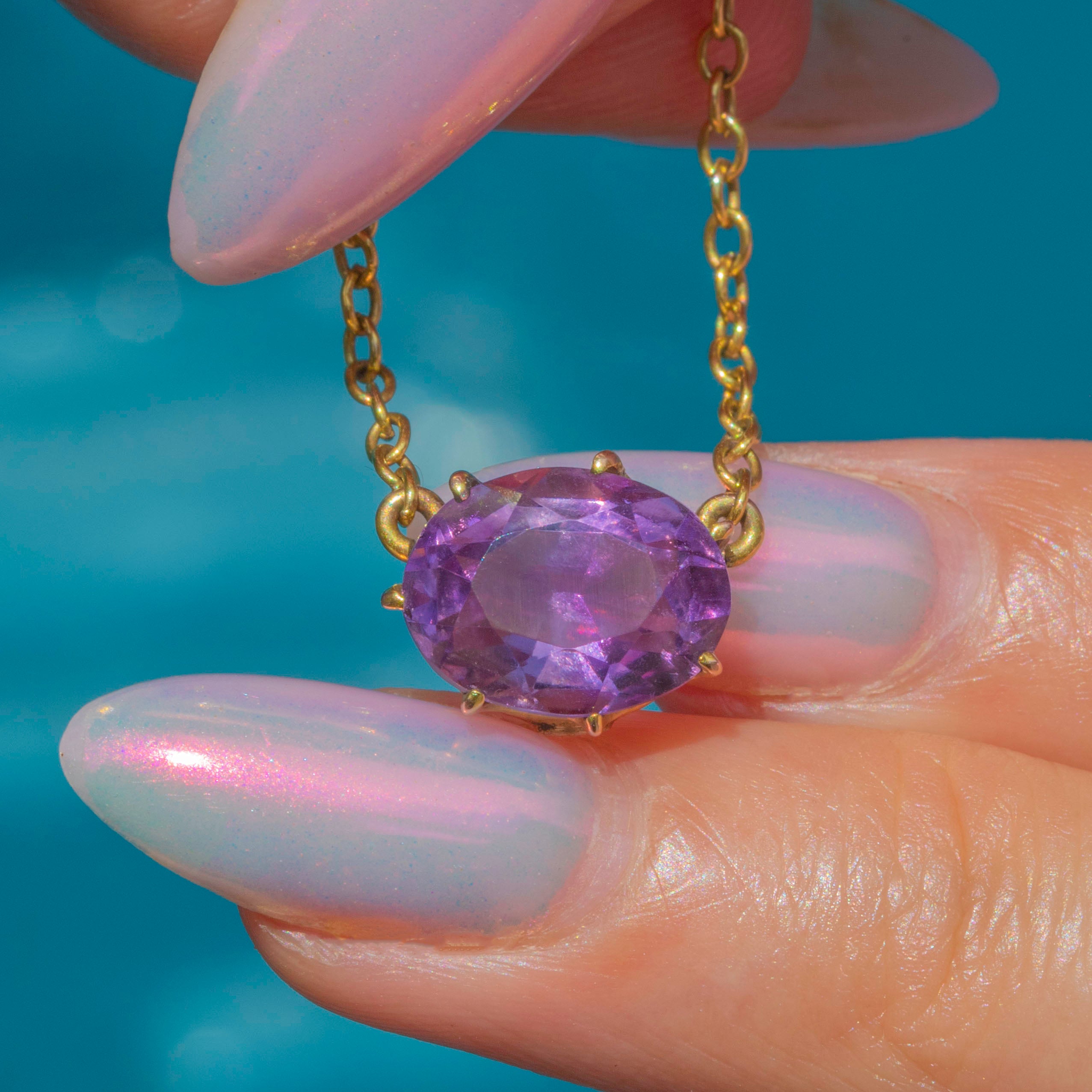 VERY GOOD: The Amethyst is glossy, with no chips or scuffs, and is secure within its claw setting. There is a conversion mark at the base of the Amethyst, which is not noticeable looking front on. The antique chain is in excellent condition, with all links securely connected. The new bolt-ring has been added for safety and security, allowing you to wear this Victorian necklace with confidence!