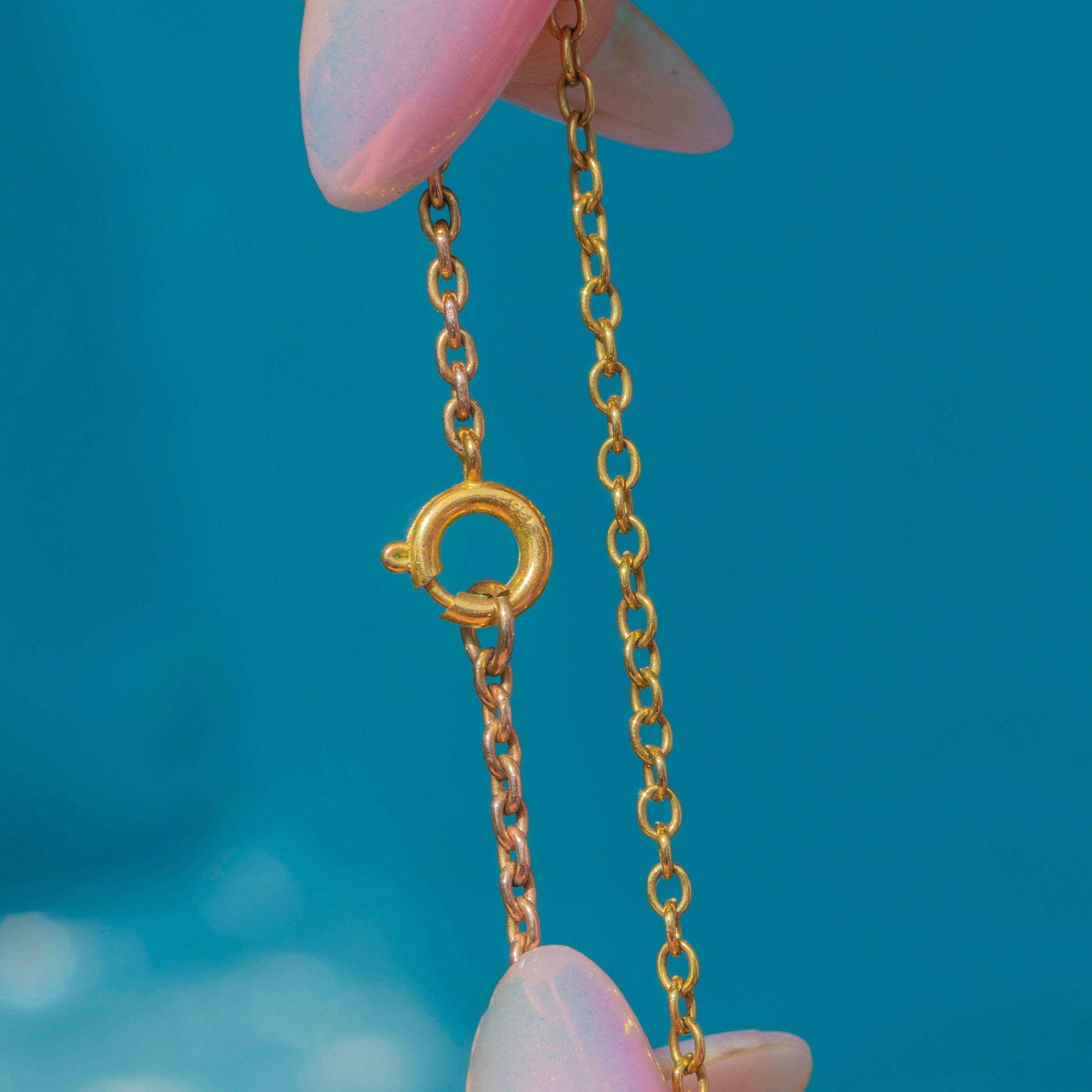 This glossy Victorian necklace has been crafted from buttery 9ct Gold and suspends a 2.43ct Amethyst embraced by claw settings. The 17" chain allows the Amethyst to rest centrally across your décolletage, radiating a deep plum hue and revealing subtle pink undertones as its facets shimmer in the light.