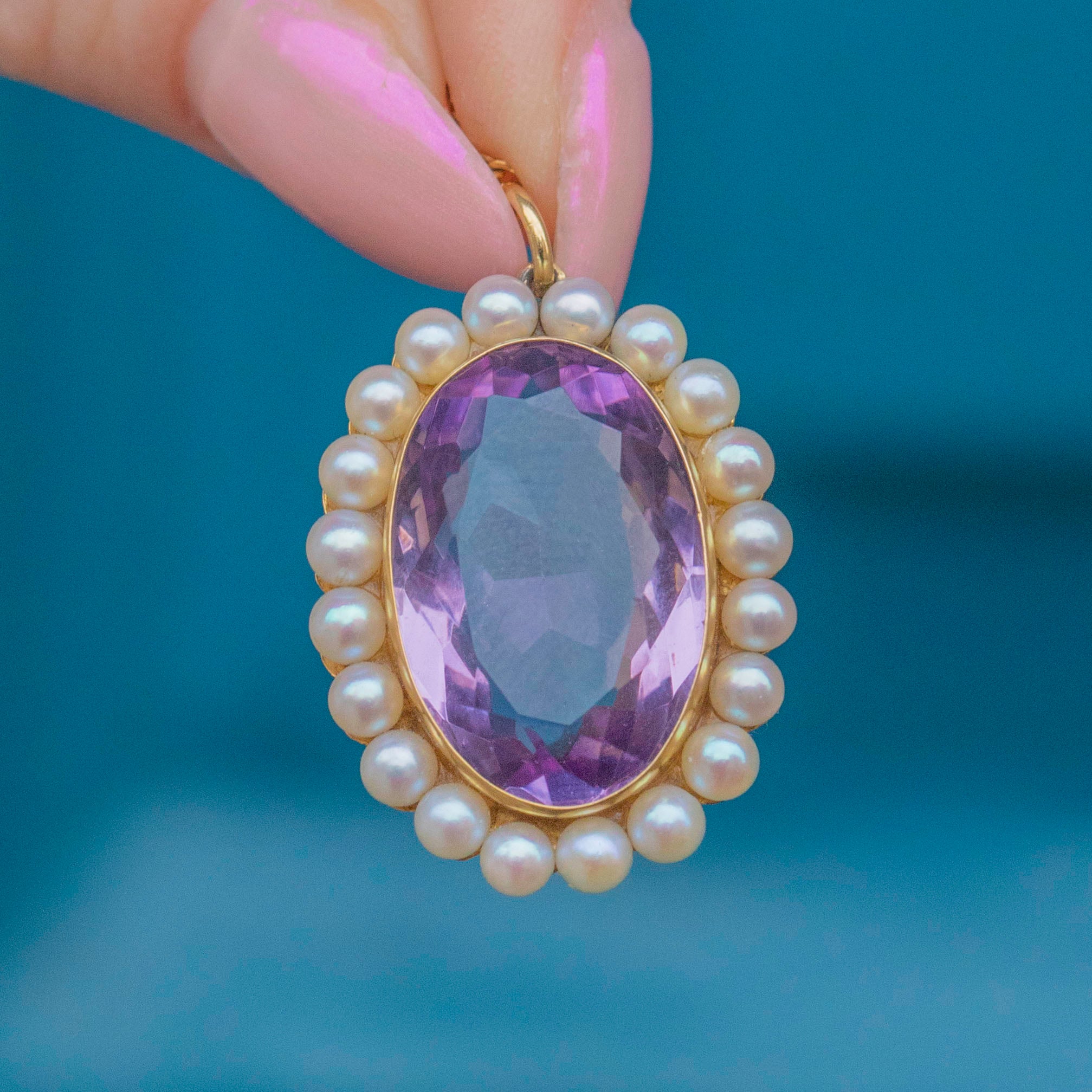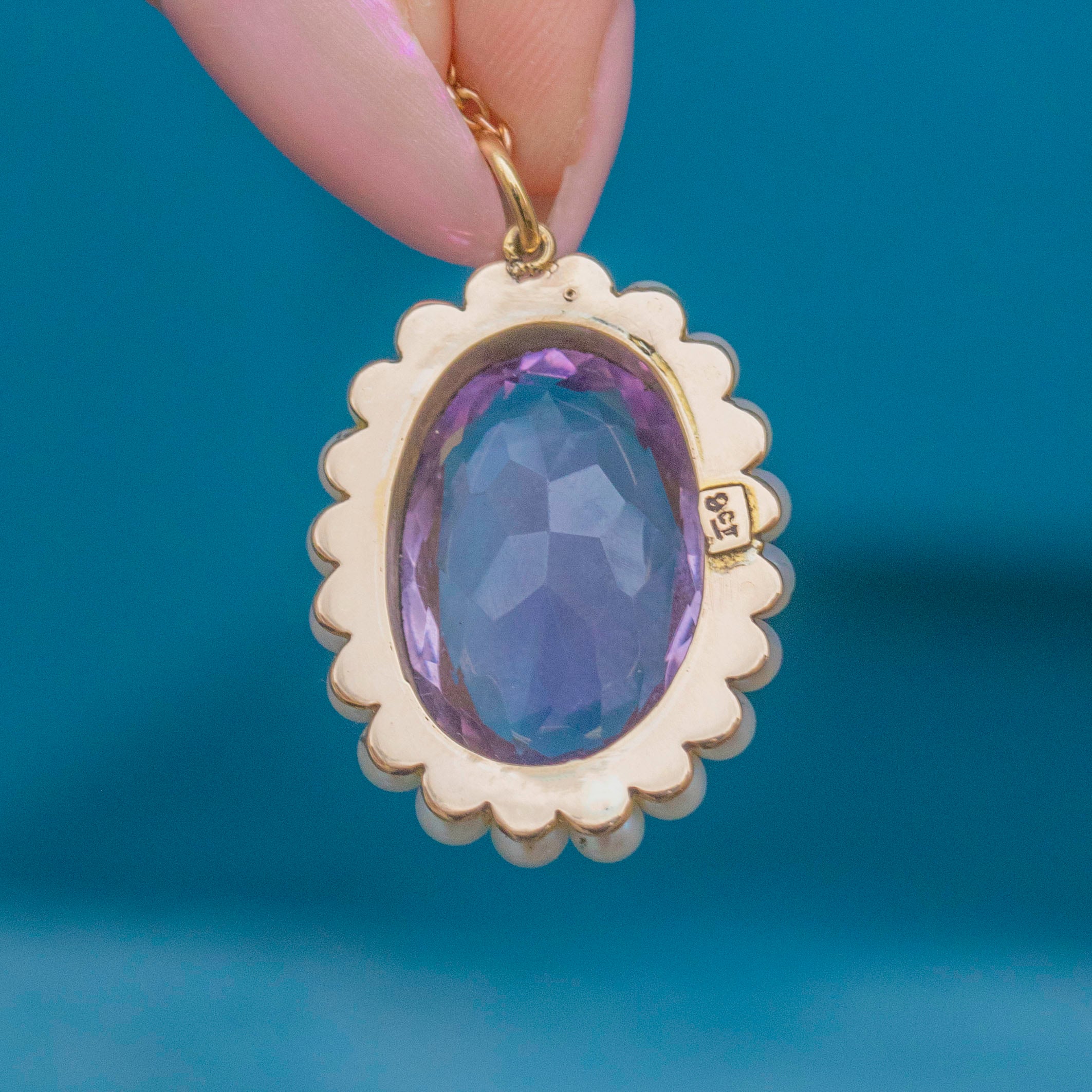 MATERIALS: Tests as 9ct Gold, Amethyst (9.88ct), Pearl.
