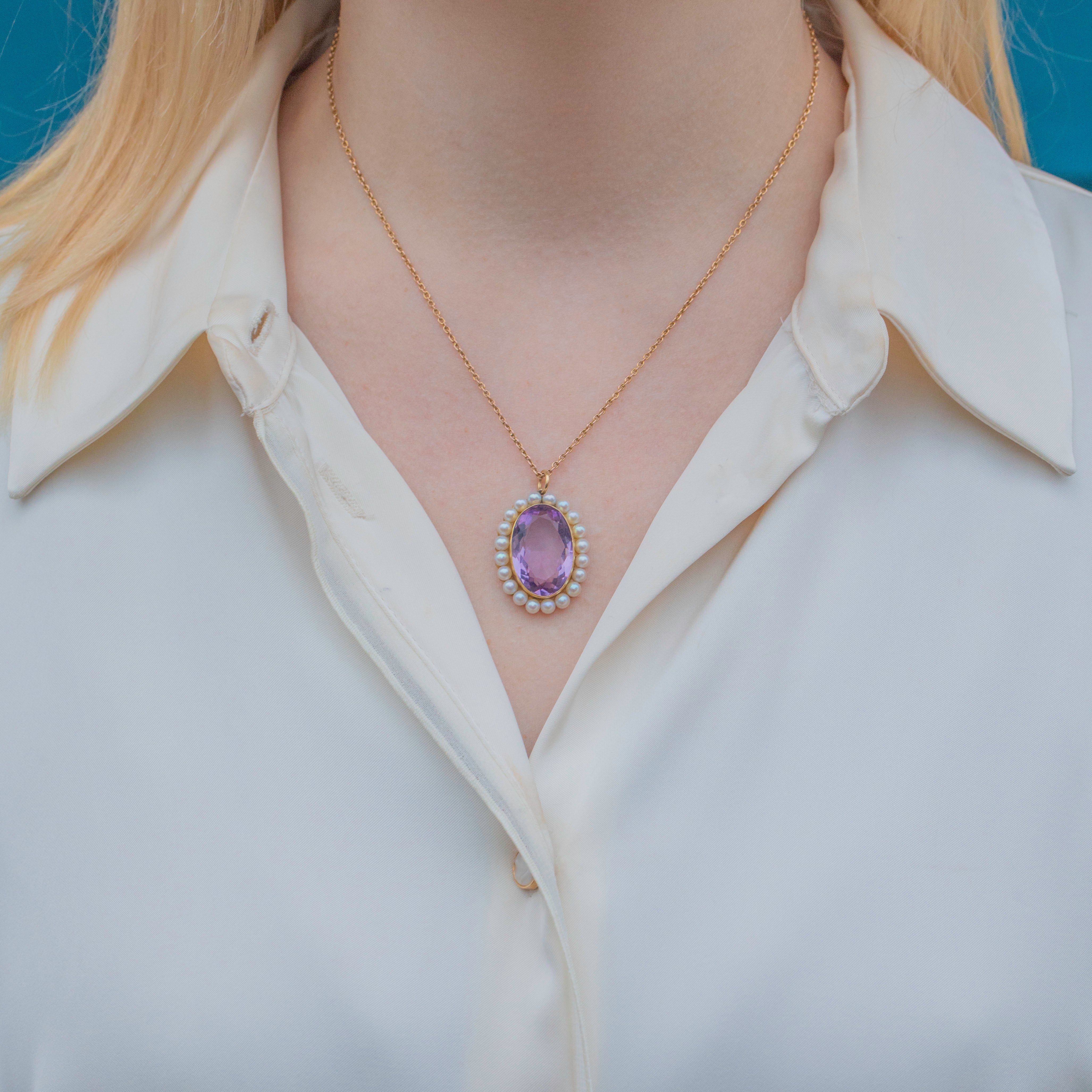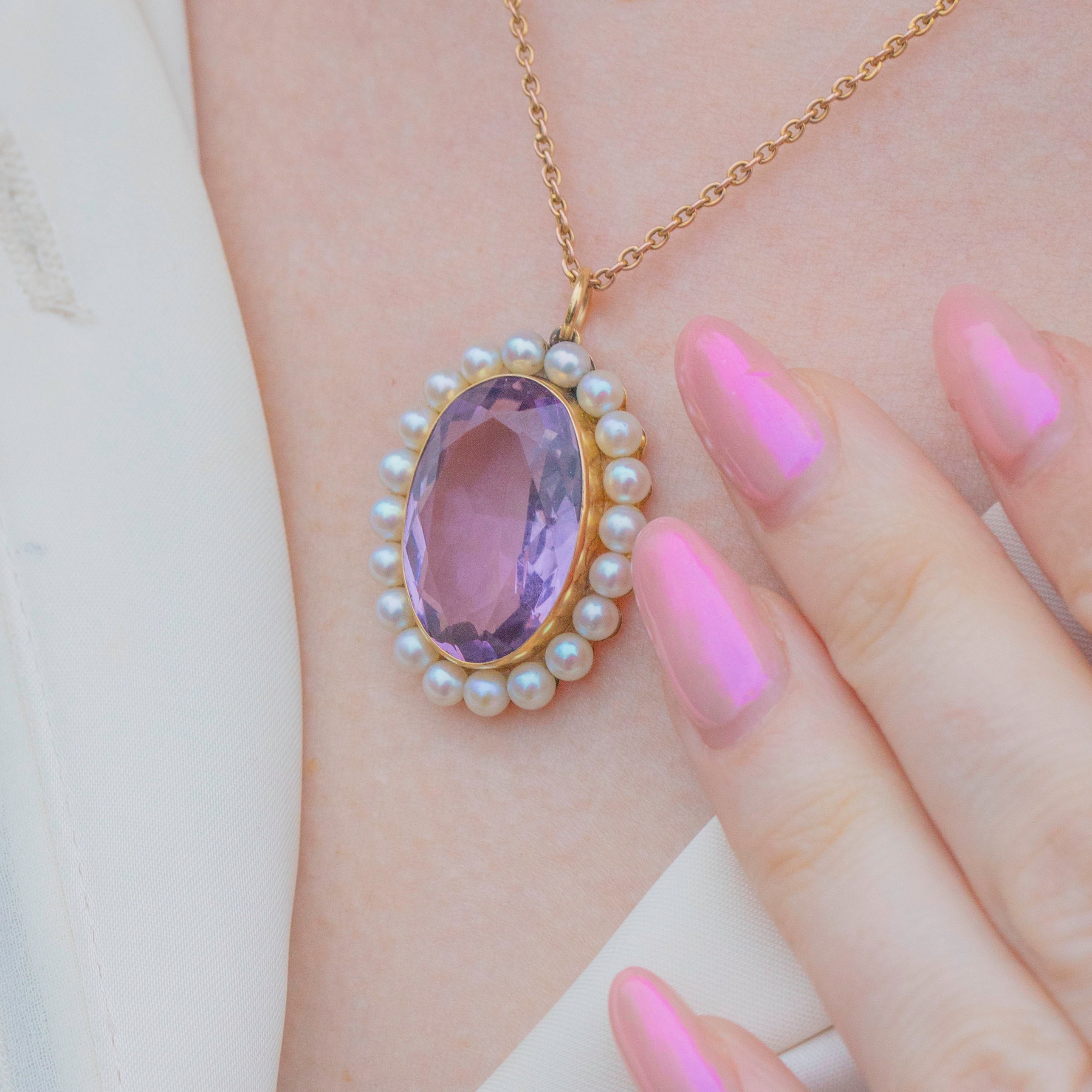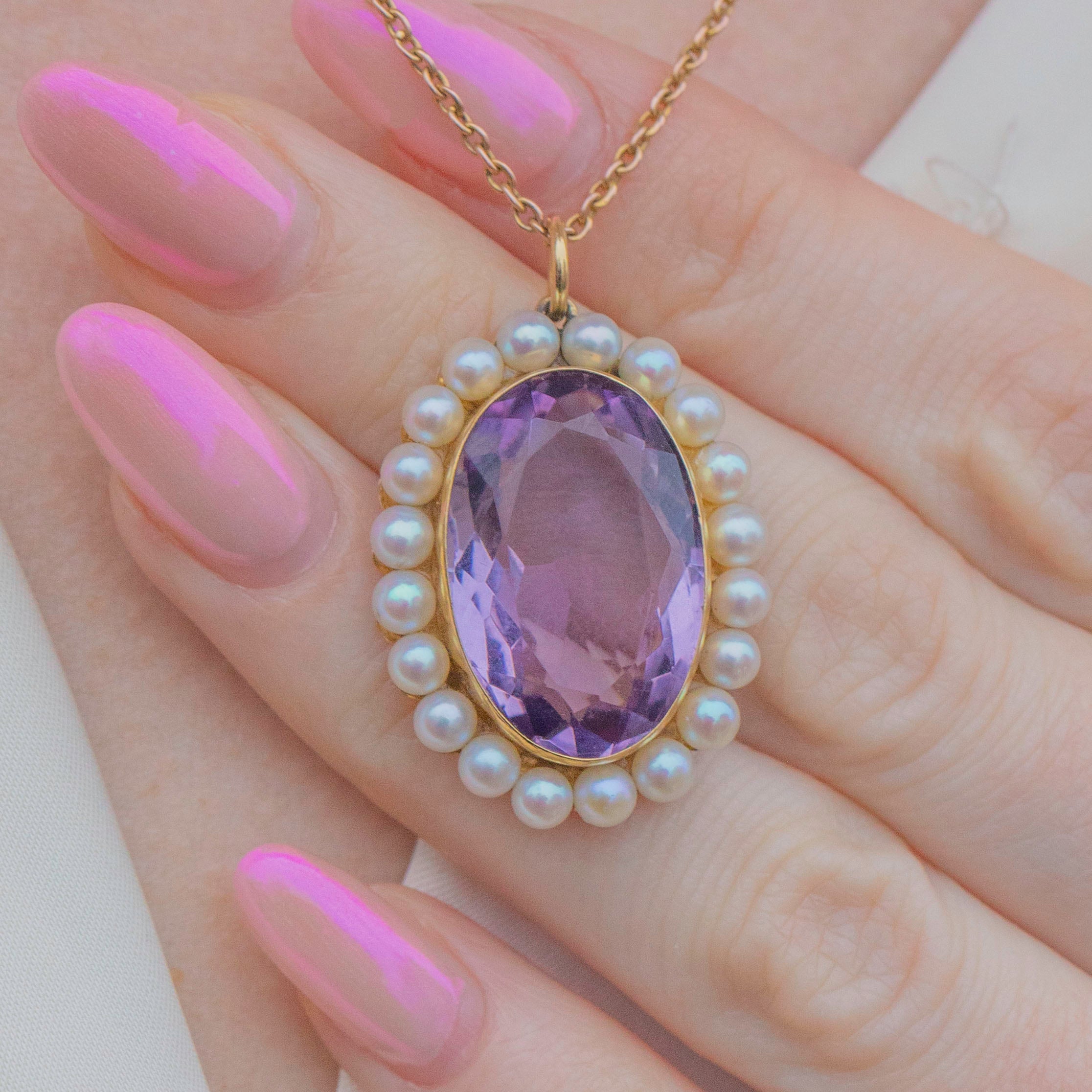 This antique 9ct Gold Amethyst Pearl cluster pendant will add a regal finishing touch to any ensamle! The 9.88ct Amethyst reveals a lovely lilac hue from its crisp cut facets, complemented by a halo of lustrous silvery Pearls to create a feminine cluster design.