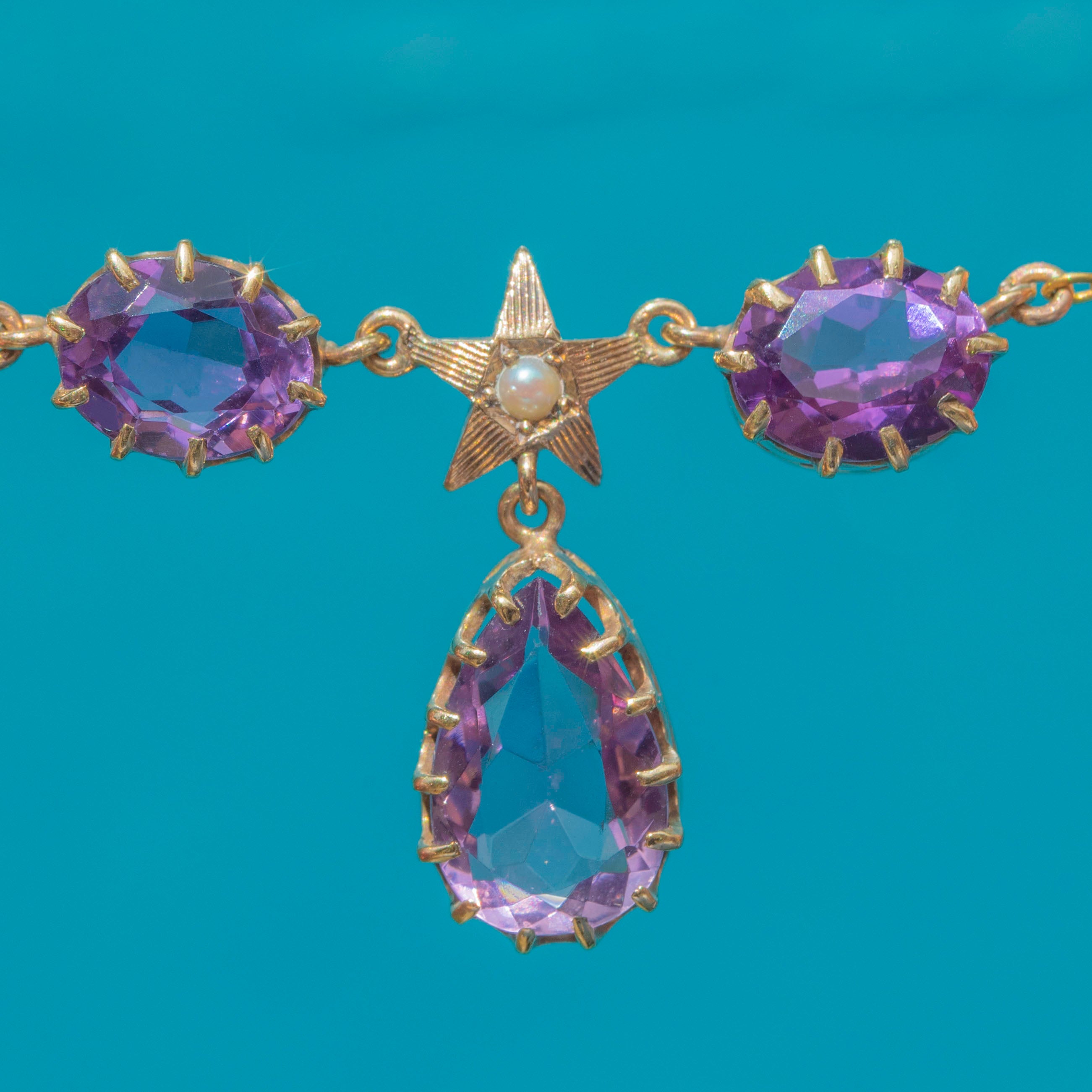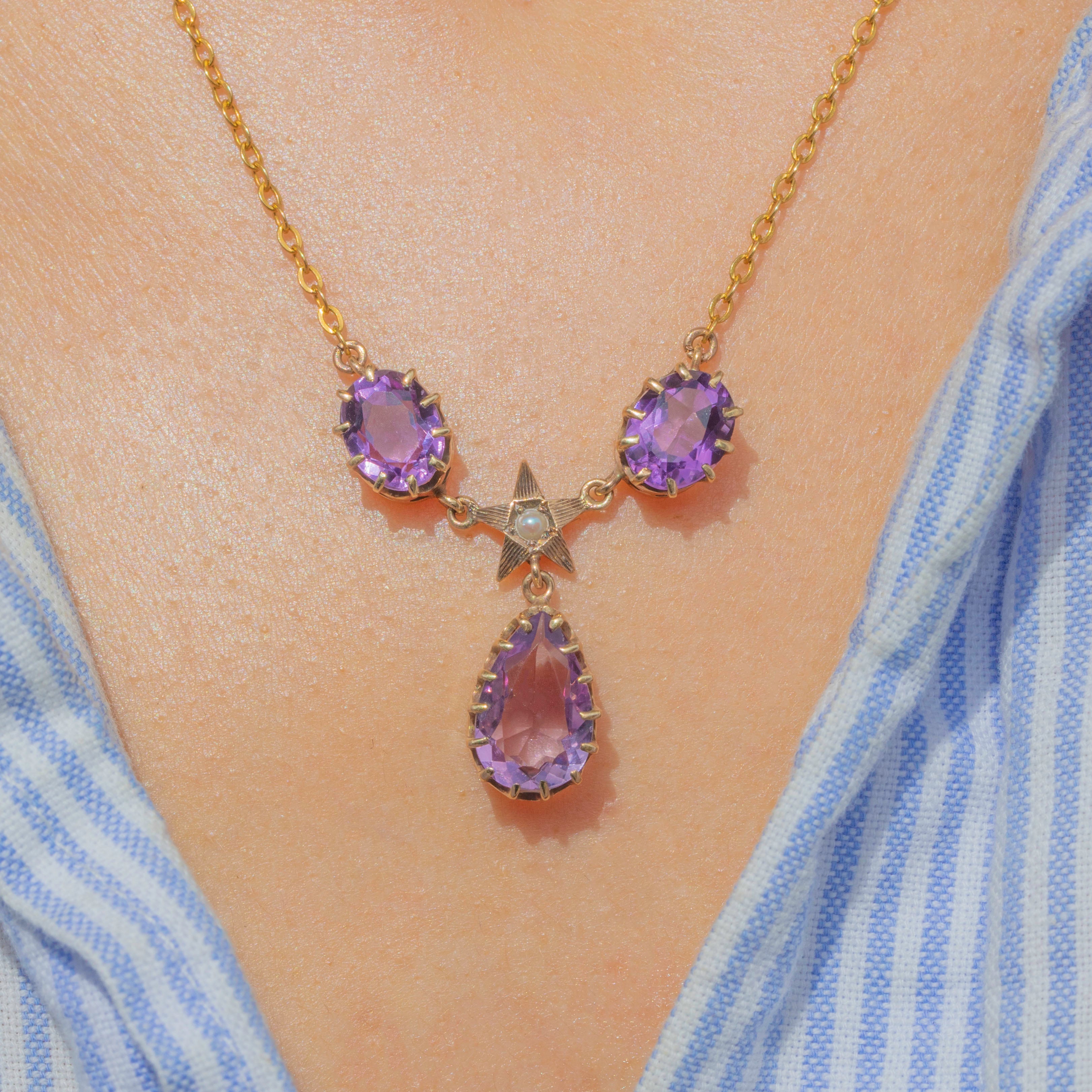 Antique 9ct Gold Amethyst Pearl Star Drop Necklace, 3.14ct