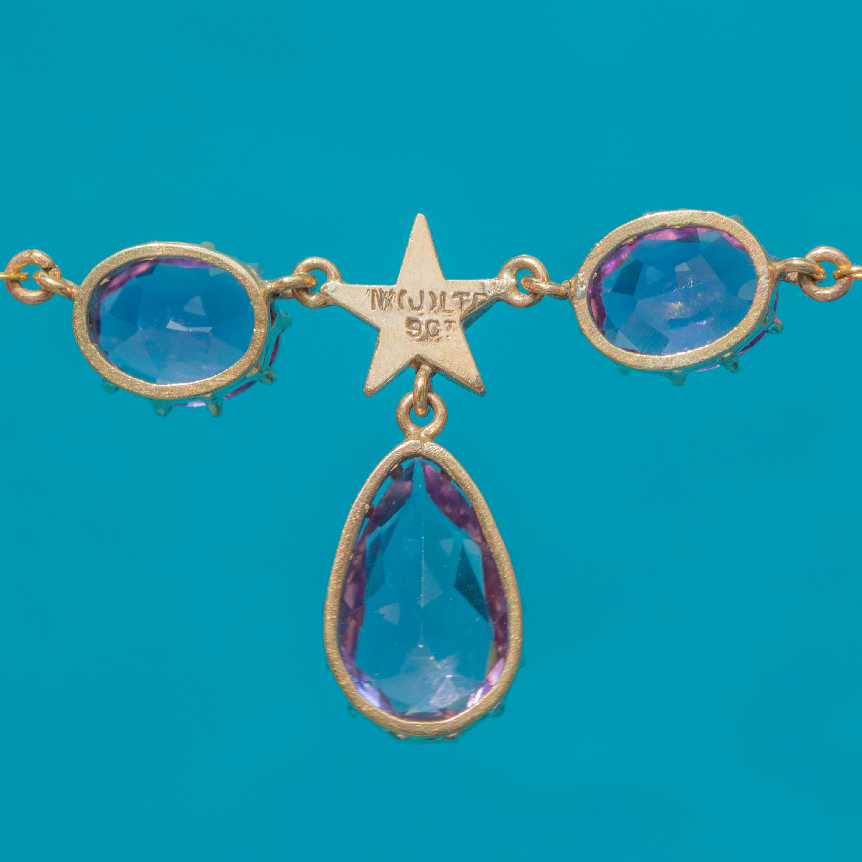 EXCELLENT: We are pleased to present this antique 9ct Gold Amethyst Pearl star drop necklace in excellent condition! The Amethysts have a delicious vibrant purple hue and boast crisp facets, free from fleabites or abrasions. The Gold is buttery and the gemstones are securely set. Each component is securely affixed, and with a fully functioning bolt-ring, you can enjoy wearing this celestial treasure with absolute confidence!