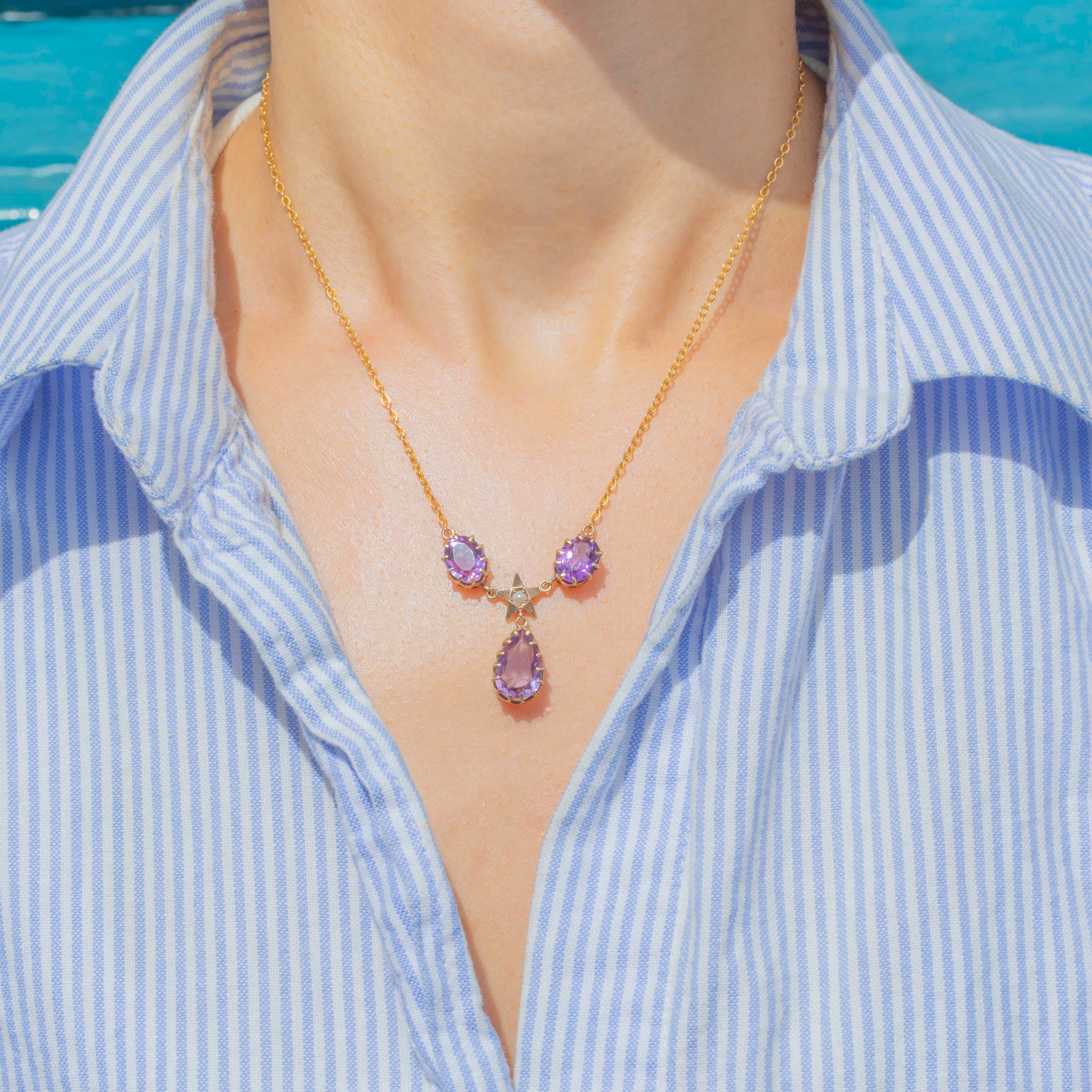 This antique 9ct Gold Amethyst Pearl star drop necklace is an outstanding Victorian treasure! At 15.5 inches long, this Victorian necklace will rest delicately across your décolletage, suspending the delectable gemstones centrally between your collarbones.