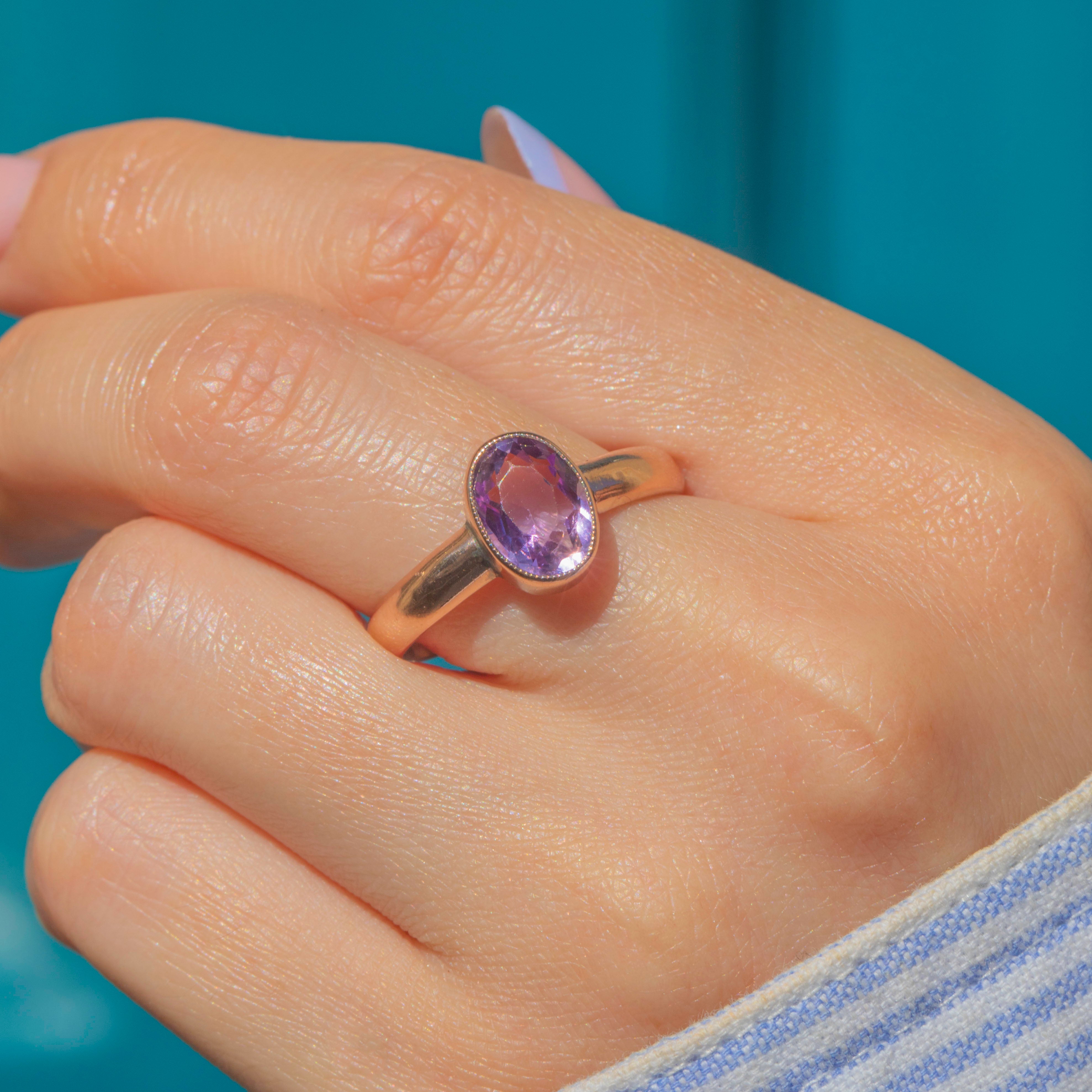 This Post-Edwardian Amethyst ring displays the most mesmerising violet colour, complimented by the delicate golden tones of her 9ct Gold settings. She sits high in her bezel and provides excellent finger coverage, making her quite the statement piece!