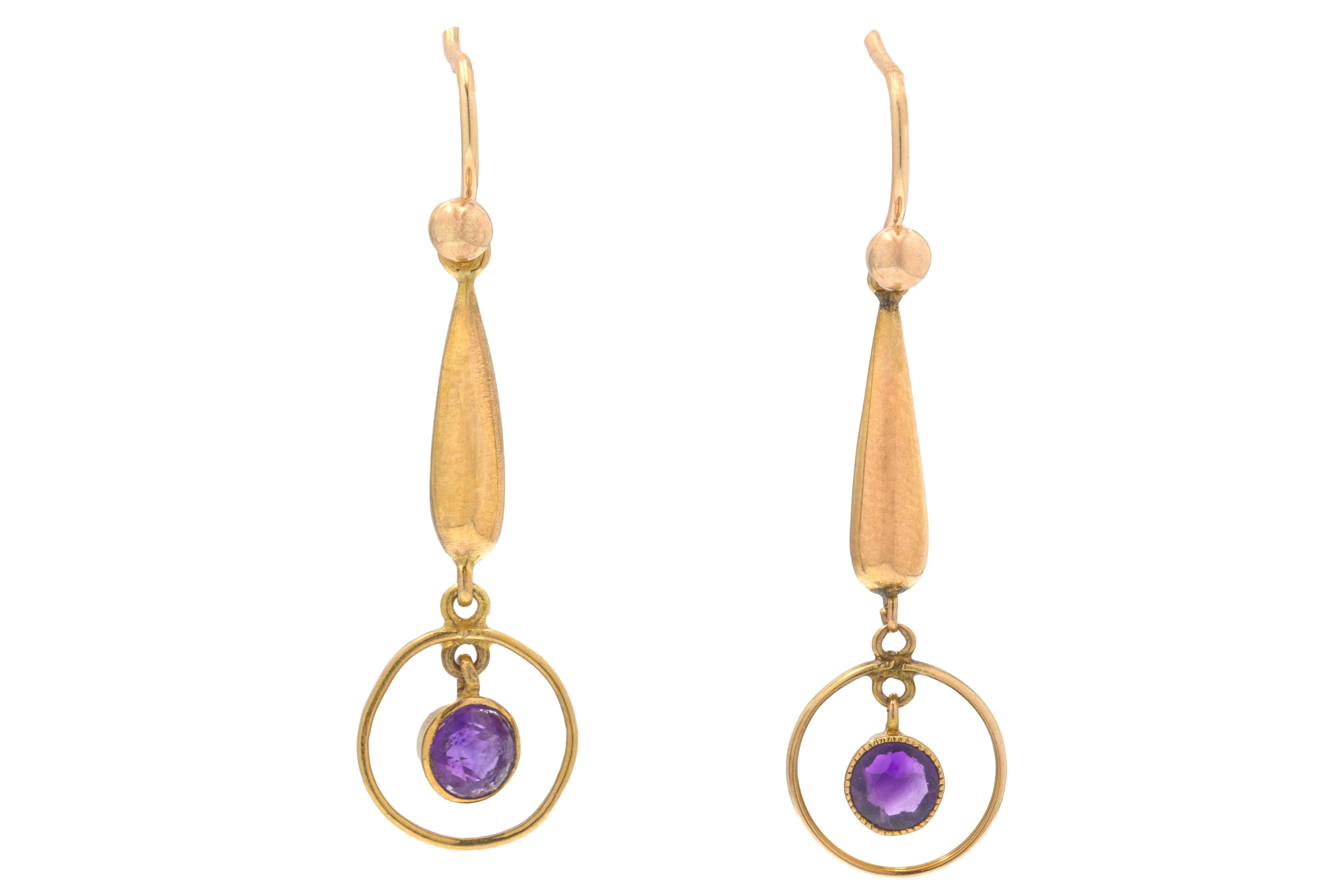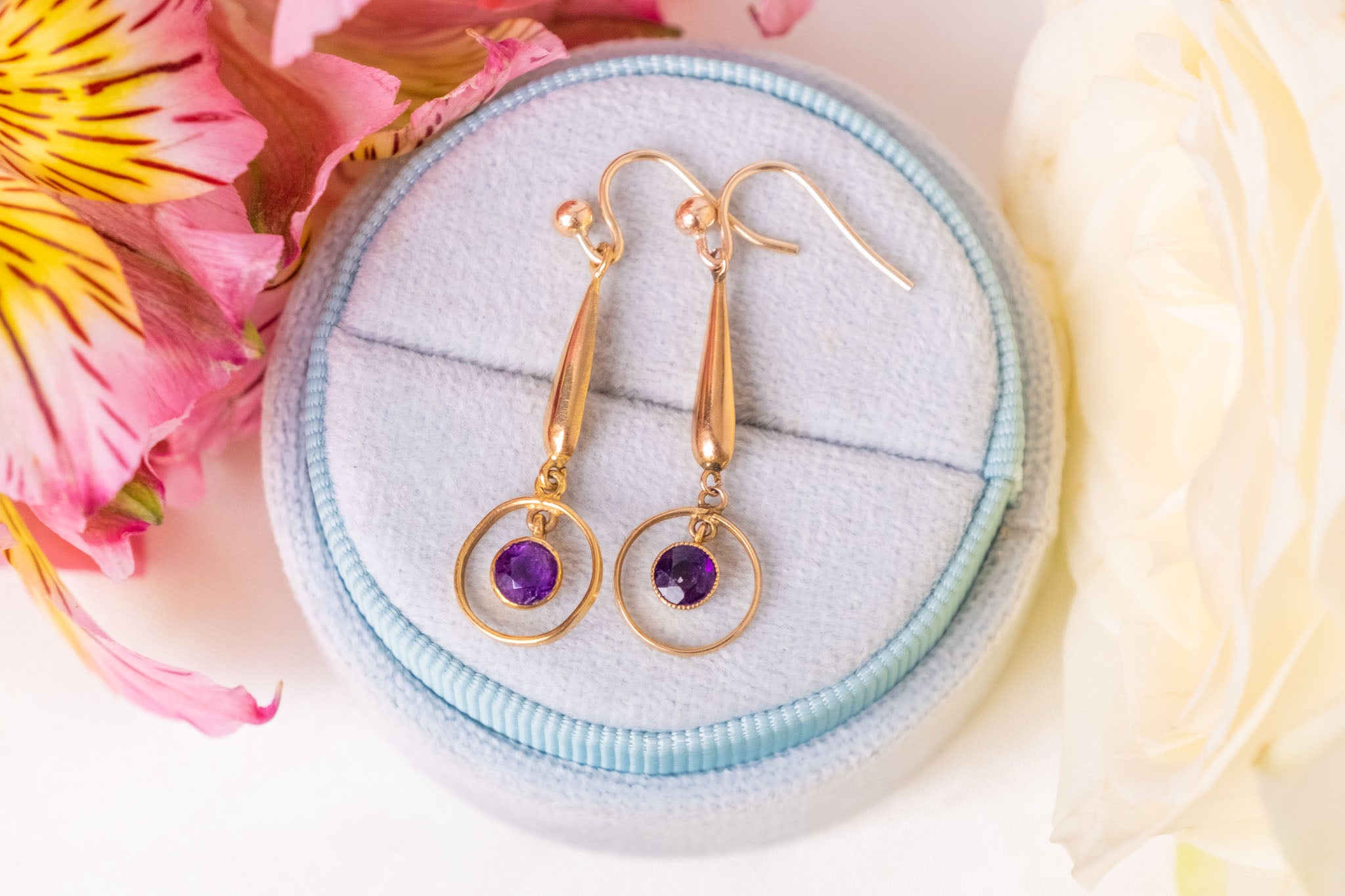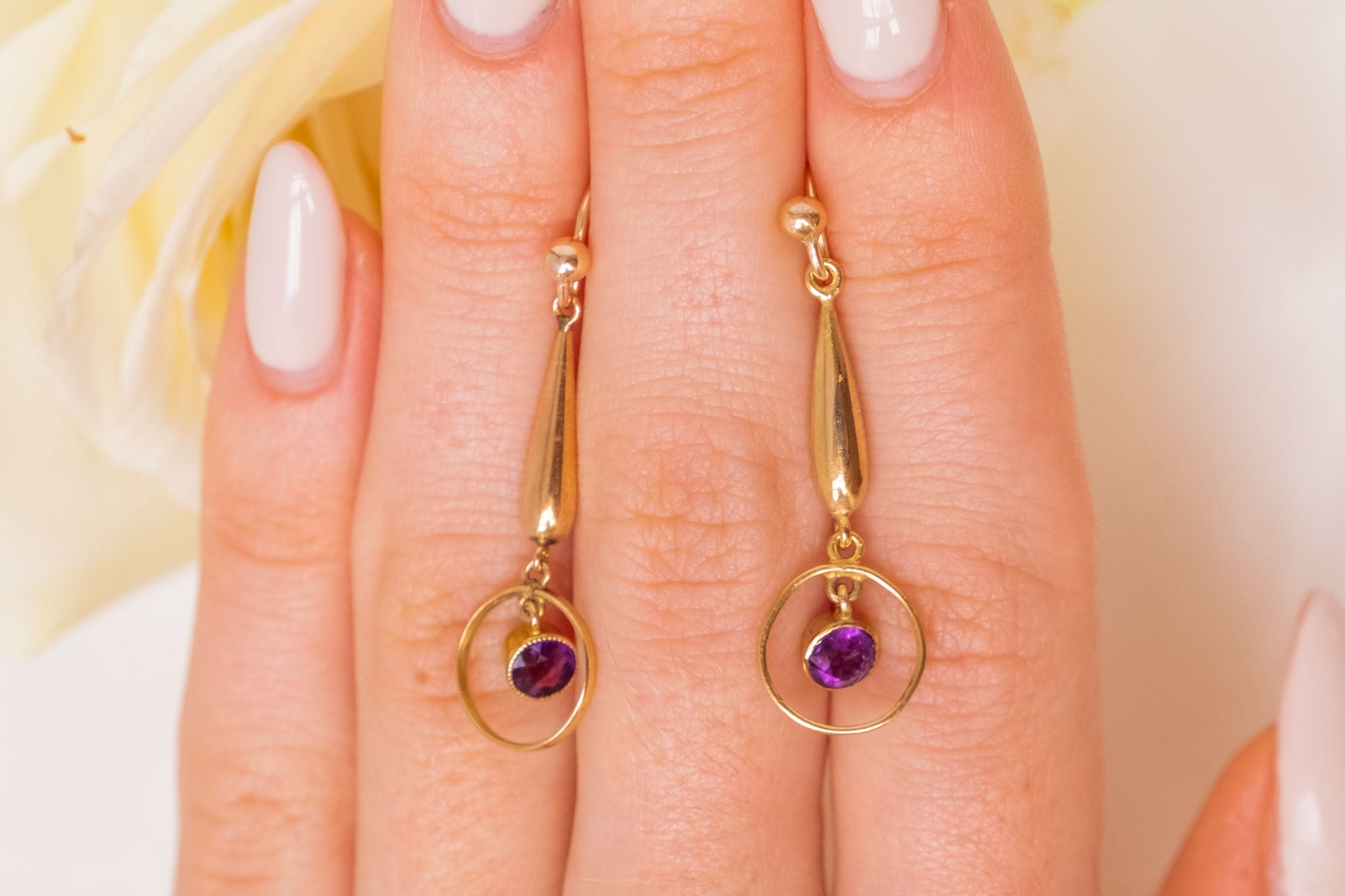 アンティーク 9ct ゴールド アメジスト ターゲット ドロップ イヤリング、0.60ct