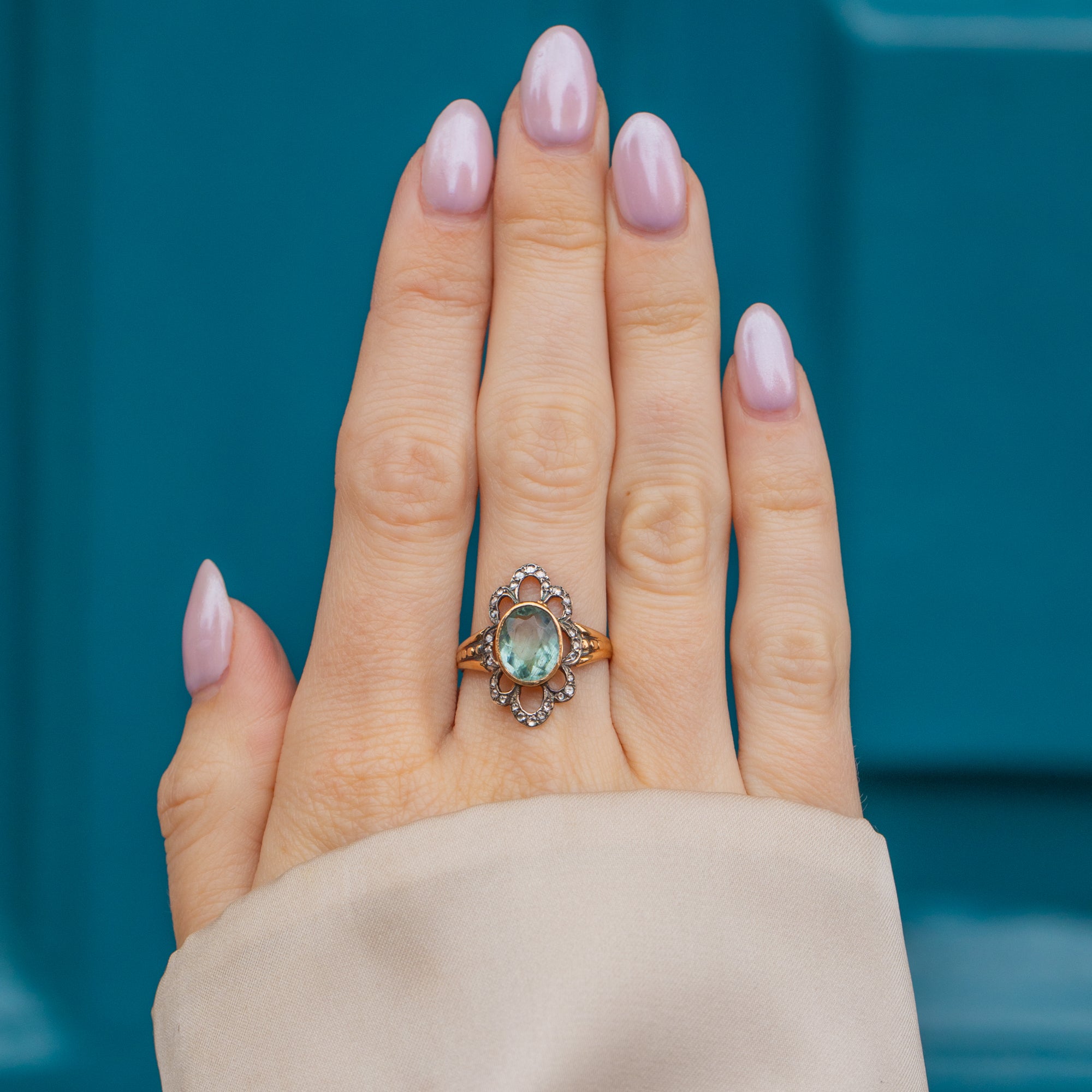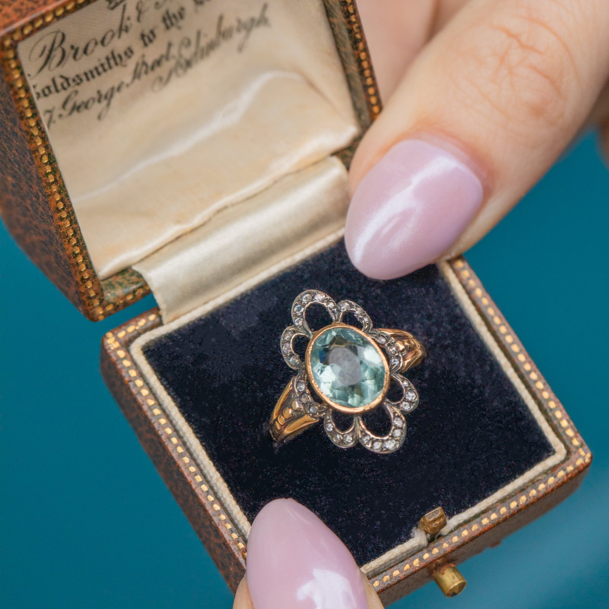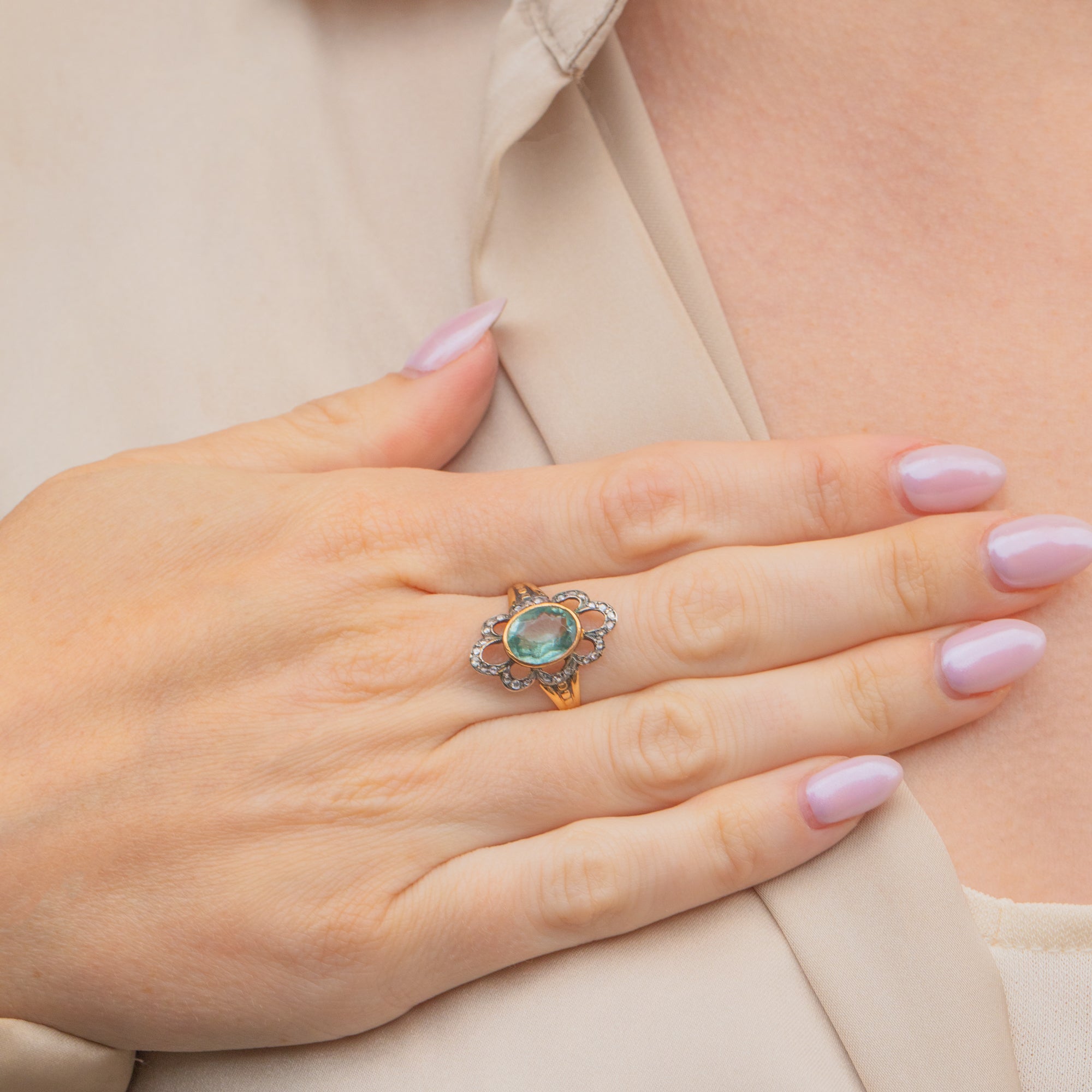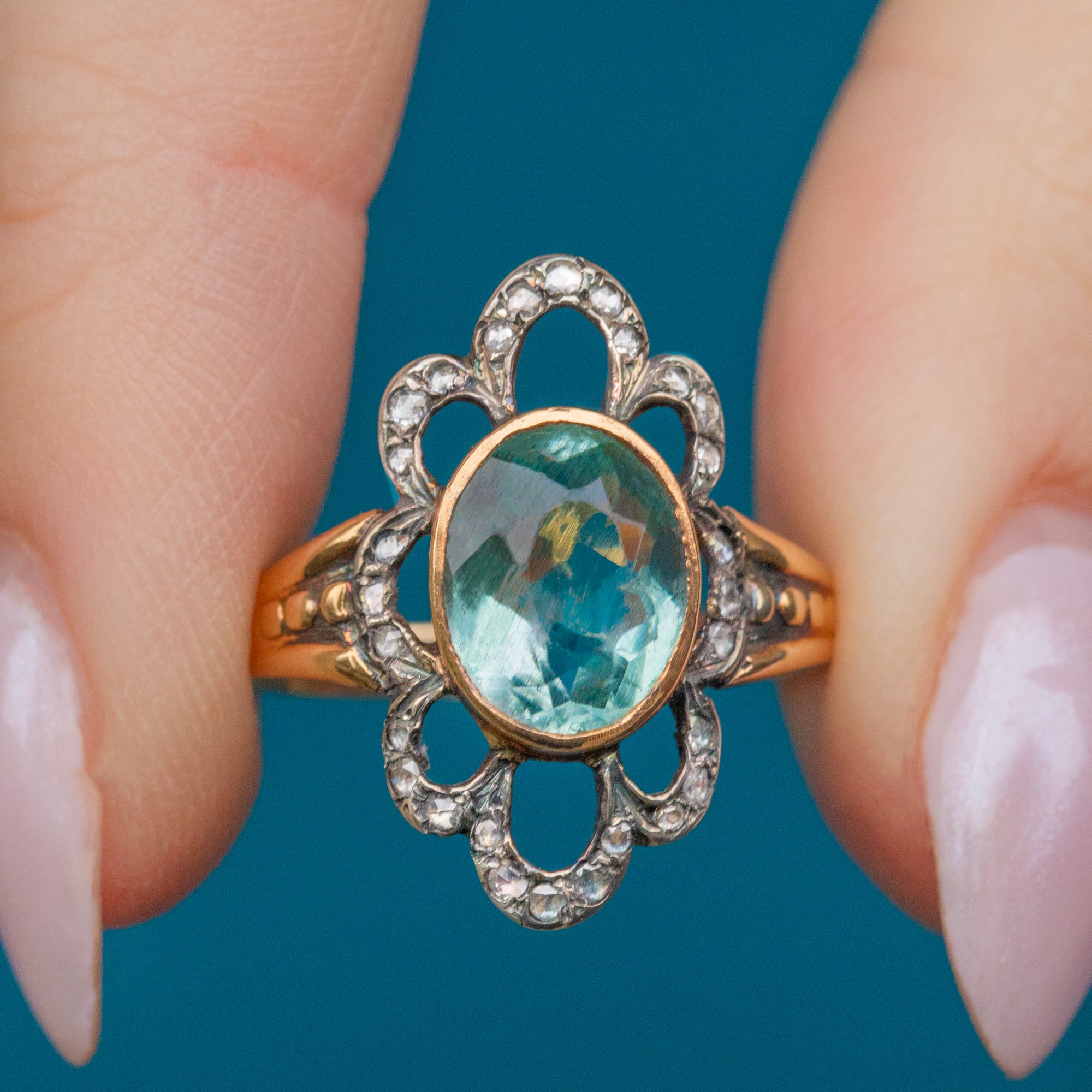 This gorgeous antique 9ct Gold Aquamarine Diamond flower ring will make an impact wherever she goes! This treasure has been crafted from 9ct Gold and is home to a pastel blue Aquamarine at the centre, surrounded by rose-cut Diamond gems set into Silver.