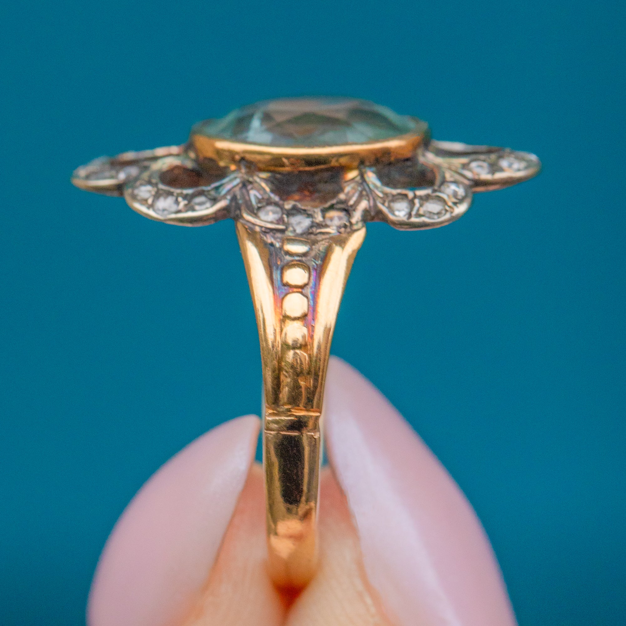 VERY GOOD - EXCELLENT. This antique 9ct Gold Aquamarine Diamond flower ring is in very good condition. The Aquamarine is securely set within its bezel, and up close you can see some wonderful, natural, inclusions that make this stone entirely unique. The rose-cut Diamonds are all present and sparkle beautifully, and the shoulders lead out onto a smooth Gold band. There is a resize mark on the back of the band, but it is smooth and the ring wears like a dream.
