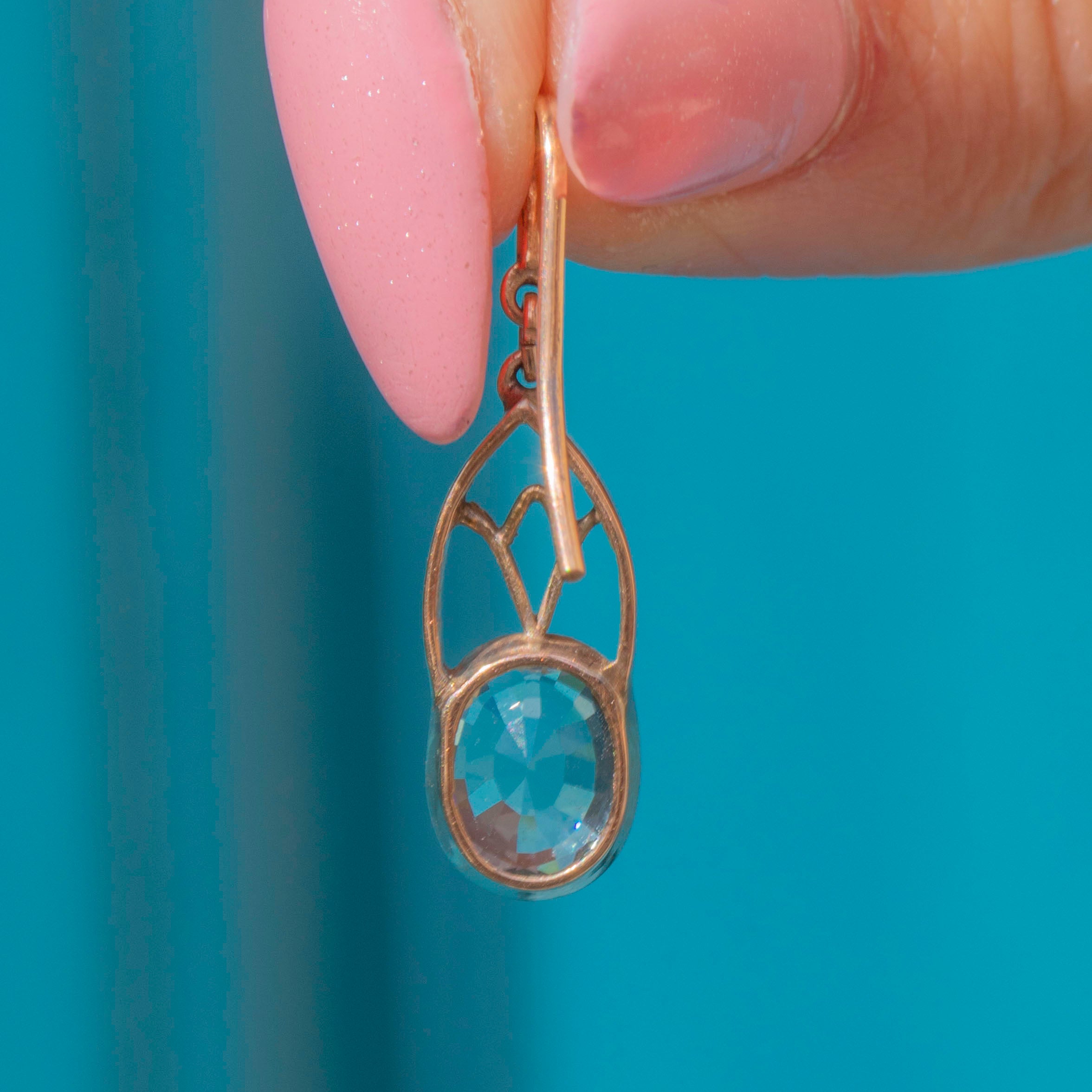 A sweet pair of antique 9ct Gold Aquamarine drop earrings, flaunting glacial hues that twinkle beneath the light.