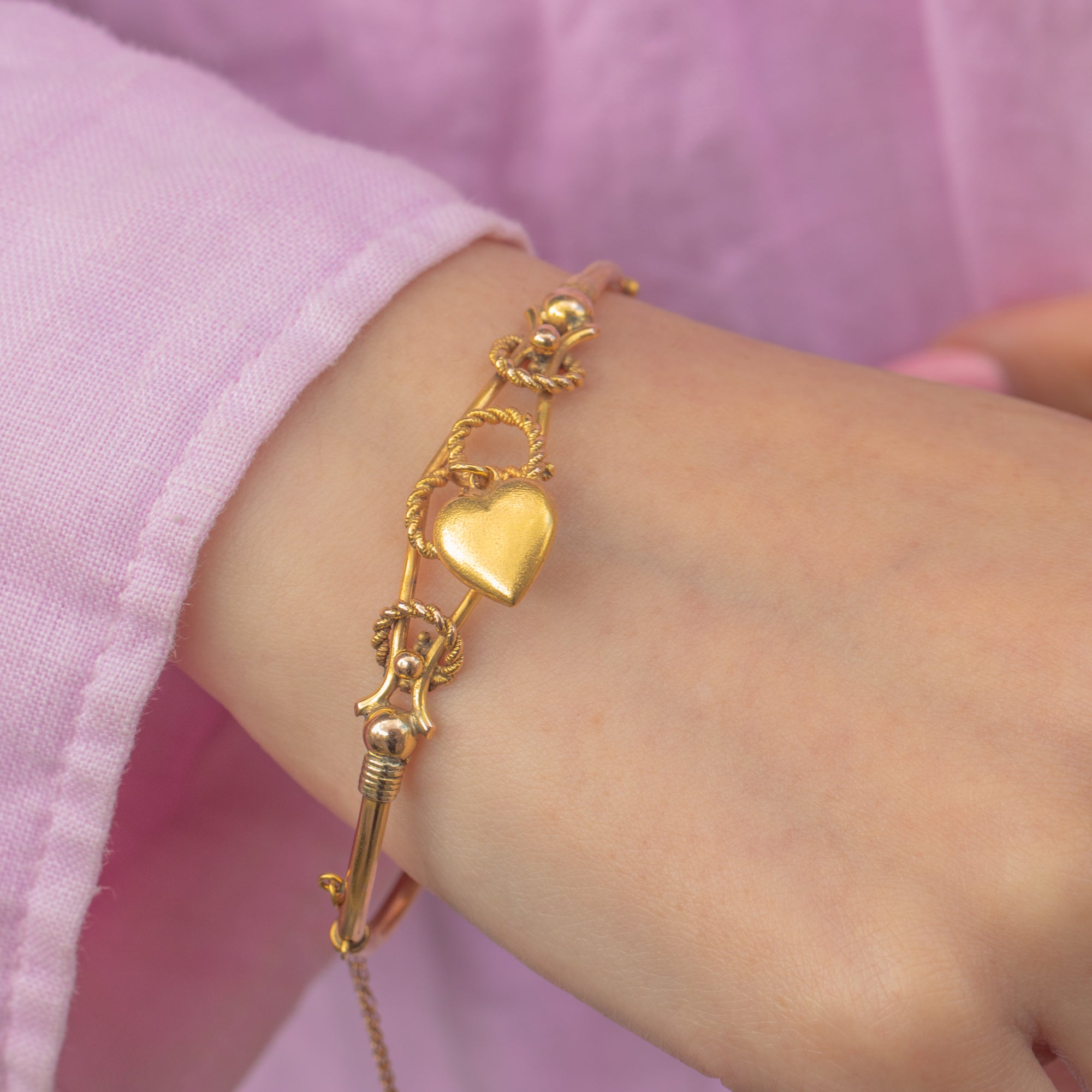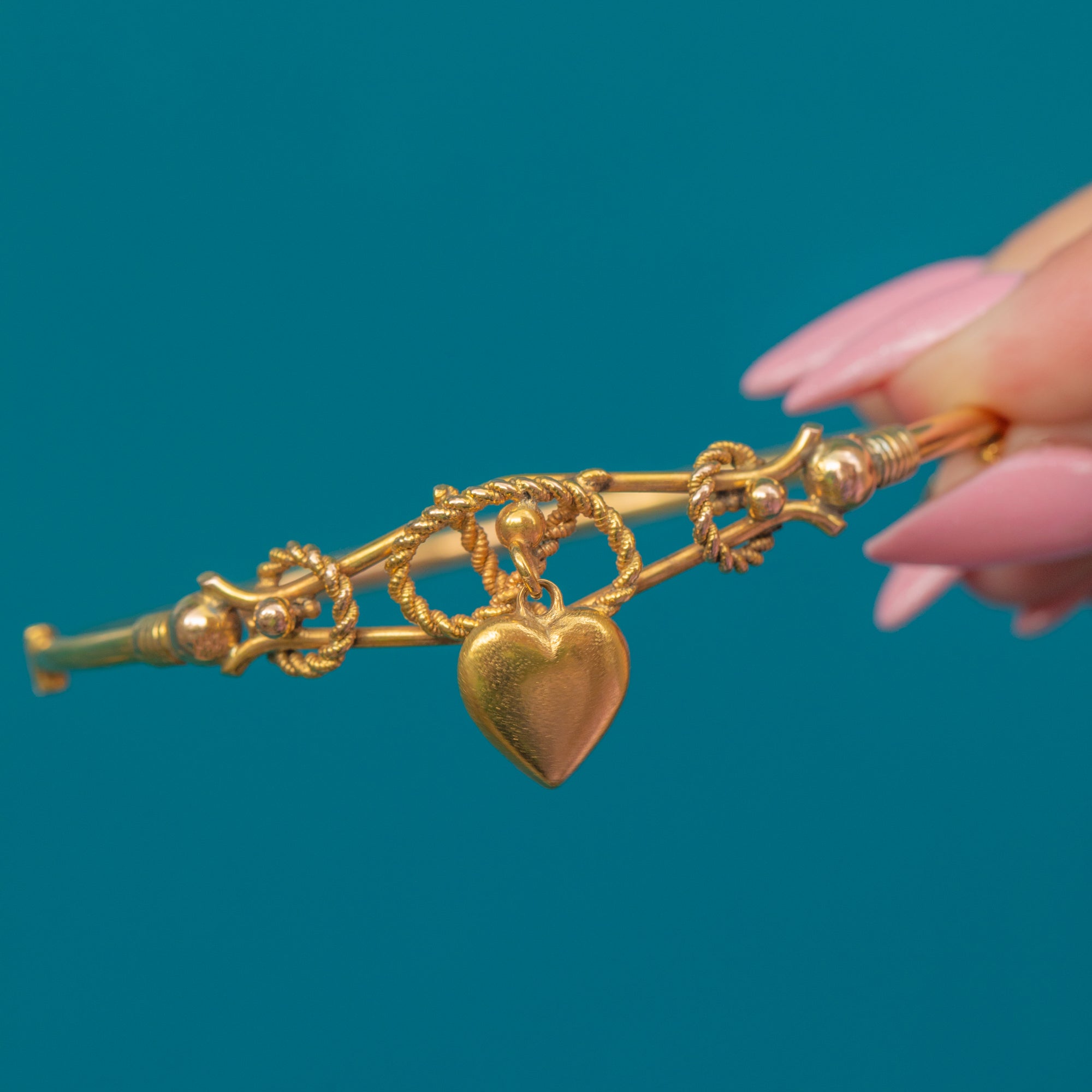 This Victorian 9ct Gold bangle exudes antique elegance, adorned with a playful puffy heart charm that gives the piece a feeling of life and movement.